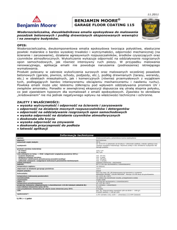 11.2011 BENJAMIN MOORE® GARAGE FLOOR COATING 115 Wodorozcieńczalna, dwuskładnikowa emalia epoksydowa do malowania posadzek betonowych i podłóg drewnianych eksponowanych wewnątrz i na zewnątrz budynków. OPIS: Wodorozcieńczalna, dwukomponentowa emalia epoksydowa tworząca połyskliwe, elastyczne powłoki malarskie o bardzo wysokiej trwałości i wytrzymałości, odporności mechanicznej (na ścieranie i zarysowanie), działanie agresywnych rozpuszczalników, środków czyszczących oraz czynników atmosferycznych. Wykończenie wykazuje odporność na oddziaływanie rozgrzanych opon samochodowych, jak równieŜ intensywny ruch pieszy. W przypadku malowania renowacyjnego, aplikacja emalii nie powoduje naruszenia (podnoszenia) istniejącego wymalowania. Produkt polecany w zakresie wykończenia surowych oraz malowanych wcześniej posadzek betonowych (garaŜe, piwnice, schody, podjazdy, etc.), podłóg drewnianych (tarasy, werandy, etc.) w obiektach mieszkalnych, jak i komercyjnych (równieŜ przemysłowych z wyjątkiem tych, podlegających bardzo intensywnemu obciąŜeniu mechanicznemu i nasileniu ruchu). Powłoka emalii moŜe ulec lekkiemu Ŝółknięciu pod wpływem oddziaływania promieni UV i związków amoniaku. Ponadto w zewnętrznej ekspozycji dopuszcza się utratę stopnia połysku, co jest zjawiskiem typowym dla wymalowań z emalii epoksydowych. Zjawisko to określane „kredowaniem” nie ma jednak negatywnego wpływu na właściwości techniczne i ochronne. ZALETY I WŁAŚCIWOŚCI: ● wysoka wytrzymałość i odporność na ścieranie i zarysowanie ● odporność na działanie mocnych rozpuszczalników i detergentów ● odporność na oddziaływanie rozgrzanych opon samochodowych ● wysoka odporność na działanie czynników atmosferycznych ● doskonała siła krycia ● wysoka odporność na zmywanie ● doskonała przyczepność do podłoŜa ● łatwość aplikacji Informacje techniczne spoiwo: Wodorozcieńczalna, poliamidowa Ŝywica epoksydowa pigment: zawartość części stałych: biel tytanowa 39 % ok. 6-8 m2/l w zaleŜności od struktury i chłonności podłoŜa, metody aplikacji oraz uŜytego narzędzia malarskiego. Wykonać próbę w celu określenia wydajności dla danego podłoŜa. wydajność: grubość warstwy malarskiej: - na mokro - na sucho: czas schnięcia (w temp. + 25°°C i wilgotności względnej powietrza 50%): - suchość dotykowa: - aplikacja kolejnej warstwy: - moŜliwość uŜytkowania pomalowanej posadzki/podłogi: - całkowite związanie i osiągnięcie końcowych parametrów technicznych: rodzaj schnięcia: lepkość: min. 30 min. min. 4 godz. min. 48 godz. min. 7-10 dni. wiązanie chemiczne - sieciowanie 85 ± 5 KU (po wymieszaniu z utwardzaczem) temperatura zapłonu: nie dotyczy odporność na działanie gorącego powietrza: stopień połysku: 121°C kolorystyka: temperatura malowanej powierzchni: rozcieńczalnik: czyszczenie: cięŜar 1 l: temperatura przechowywania: proporcja mieszania (objętościowa) z utwardzaczem 115-84 Catalyst (składnik B): czas indukcji mieszaniny (przy 25°C): czas przydatności mieszaniny do uŜycia (czas otwarcia) przy 25°C: LZO: opakowania*: *3,78 L = 1 galon 153,1 µm 58,7 µm połysk biel oraz bazy 1B i 4B dostosowane do barwienia w systemie BENJAMIN MOORE® COLOR PREVIEW®. Wersja 115 00 słuŜy do gruntowania. od +15°C do +32°C nie zaleca się rozcieńczać (czysta, przegotowana woda) czysta woda 1,30 kg (po wymieszaniu z utwardzaczem) od +5°C do +32°C 4:1 (emalia + utwardzacz) 30 min. 6-8 godz. Kat. A/j. Dopuszczalna zawartość LZO od 2010 r. –140 g/l. Produkt zawiera < 140 g/l LZO. 3,78 l (emalia 115); 0,95 l – utwardzacz (115-84 Catalyst) ZASTOSOWANIE Zakres uŜycia: niemalowane lub malowane podłoŜa betonowe i drewniane eksponowane wewnątrz i na zewnątrz budynków. Przygotowanie podłoŜa: ● powierzchnie niemalowane: PodłoŜa betonowe wewnętrzne i zewnętrzne: Nowe posadzki betonowe naleŜy sezonować przez okres 60-90 dni, do ich całkowitego wyschnięcia i związania, po czym wytrawić 10% roztworem kwasu solnego i obficie zmyć czystą wodą. Powierzchnia prawidłowo przygotowana do malowania powinna przypominać powierzchnię papieru ściernego o średnim uziarnieniu. NaleŜy usunąć zalęgający brud, kurz, tłuste plamy i luźne fragmenty podłoŜa. PodłoŜe moŜna równieŜ przygotować przy uŜyciu specjalnej maszyny (np. Onfloor Prep 16). Występujące na powierzchni mikroorganizmy (pleśń, algi i grzyby) naleŜy usunąć stosując odpowiednie preparaty. Przygotowane w powyŜszy sposób podłoŜe zagruntować jedną warstwą emalii Benjamin Moore® Garage Floor Coating 115 00 (baza transparentna). PodłoŜa drewniane wewnętrzne i zewnętrzne: ŚwieŜe podłoŜa drewniane naleŜy odpowiednio wysuszyć i wysezonować. Usunąć brud, kurz, tłuste plamy, Ŝywicę i luźne fragmenty podłoŜa. Nierówności i spękania wyrównać odpowiednią szpachlówką lub masą wypełniającą. Występujące na powierzchni mikroorganizmy (pleśń, algi i grzyby) naleŜy usunąć stosując odpowiednie preparaty. Powierzchnię zmatowić drobnoziarnistym papierem ściernym, dokładnie odpylić i odtłuścić. Tak przygotowane podłoŜe zagruntować farbą gruntującą BENJAMIN MOORE® FRESH START® ALL-PURPOSE 100% ACRYLIC PRIMER 023/N023 lub FRESH START® ALL-PURPOSE 100% ACRYLIC PRIMER 023 04/N023 04 (pod ciemne odcienie). Uwaga: w przypadku niemalowanych podłoŜy czynność gruntowania stanowi absolutny wymóg technologiczny. ● powierzchnie malowane (istniejące powłoki malarskie): PodłoŜa betonowe wewnętrzne i zewnętrzne: Usunąć zalęgający brud, kurz, tłuste plamy, łuszczące się powłoki malarskie oraz luźne fragmenty podłoŜa. Nierówności i spękania podłoŜa wyrównać materiałem zbliŜonym składem do pierwotnie uŜytego lub specjalnym materiałem szpachlowym. Gładkie podłoŜa zmatowić. Występujące na powierzchni mikroorganizmy (pleśń, algi i grzyby) n