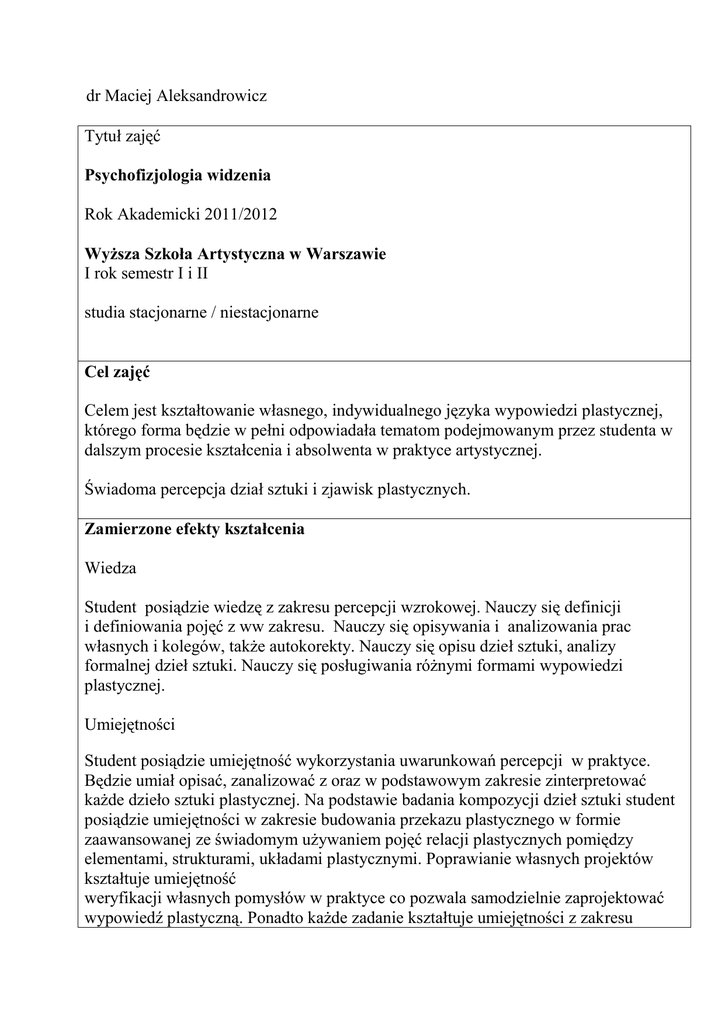 dr Maciej Aleksandrowicz Tytuł zajęć Psychofizjologia widzenia Rok Akademicki 2011/2012 Wyższa Szkoła Artystyczna w Warszawie I rok semestr I i II studia stacjonarne / niestacjonarne Cel zajęć Celem jest kształtowanie własnego, indywidualnego języka wypowiedzi plastycznej, którego forma będzie w pełni odpowiadała tematom podejmowanym przez studenta w dalszym procesie kształcenia i absolwenta w praktyce artystycznej. Świadoma percepcja dział sztuki i zjawisk plastycznych. Zamierzone efekty kształcenia Wiedza Student posiądzie wiedzę z zakresu percepcji wzrokowej. Nauczy się definicji i definiowania pojęć z ww zakresu. Nauczy się opisywania i analizowania prac własnych i kolegów, także autokorekty. Nauczy się opisu dzieł sztuki, analizy formalnej dzieł sztuki. Nauczy się posługiwania różnymi formami wypowiedzi plastycznej. Umiejętności Student posiądzie umiejętność wykorzystania uwarunkowań percepcji w praktyce. Będzie umiał opisać, zanalizować z oraz w podstawowym zakresie zinterpretować każde dzieło sztuki plastycznej. Na podstawie badania kompozycji dzieł sztuki student posiądzie umiejętności w zakresie budowania przekazu plastycznego w formie zaawansowanej ze świadomym używaniem pojęć relacji plastycznych pomiędzy elementami, strukturami, układami plastycznymi. Poprawianie własnych projektów kształtuje umiejętność weryfikacji własnych pomysłów w praktyce co pozwala samodzielnie zaprojektować wypowiedź plastyczną. Ponadto każde zadanie kształtuje umiejętności z zakresu estetyki i kultury wykonania projektu plastycznego, który należy zaprezentować na wspólnej wystawie końcowej. Inne kompetencje Każde zadanie w programie podejmuję problematykę samodoskonalenia studenta we wszystkich podejmowanych zakresach. Program ma częściowo charakter otwarty tzn. realizację zadań determinuje początkowy wybór danych pojęć lub relacji, wybór ten należy do studentów. Samodzielność ta jest ważną zachętą do poszukiwania własnego – oryginalnego i innowacyjnego języka wypowiedzi artystycznej oraz podejmowaniu za niego odpowiedzialności. Wiedza Umiejętności Postawy ++ +++ +++ Forma zajęć: Podstawową formą zajęć są : Wykłady określające zadania – ich tematykę, podejmowane pojęcia, założenia merytoryczne i techniczne, przykłady realizacji oraz inspiracje w procesie twórczym Dyskusja dydaktyczna i konwersatoria dotyczące realizacji zadań ćwiczenia na zajęciach podejmujące na bieżącą problematykę konwersatoriów Sposób sprawdzenia osiągnięcia efektów zamierzonych aktywność w konwersatoriach i dyskusjach dydaktycznych 25% atrakcyjność plastyczna i estetyczna realizacji zadań 25% adekwatność do tematyki zadań 25% oryginalność i innowacyjność realizacji zadań 25% Całkowity nakład pracy studenta potrzebny do osiągnięcia efektów w godzinach oraz punktach ECTS. Studia stacjonarne: ćwiczenia– 20 czas na wysłuchanie wykładów – 40 Razem 60 godzin - 4 pkt. ECTS Studia niestacjonarne: ćwiczenia– 12 czas na wysłuchanie wykładów – 24 Razem 36 godzin - 4 pkt. ECTS Warunki zaliczenia – przedstawienie na ostatnich zajęciach 100% zadanych w semestrze zadań, które były uprzednio konsultowane z prowadzącym; frekwencja na zajęciach nie mniejsza niż 80 % Forma zaliczenia –zaliczenie z oceną Treść zajęć: I semestr 1. „Pion Poziom” o roli przestrzeni trzech i dwu wymiarów 2. „Widzieć znaczy wiedzieć”przybliżający podstawowe pojęcia i definicje z zakresu percepcji wizualnej. 3.”Duże, małe, średnie” o roli podobieństw w percepcji wizualnej 4.”Kontrast kształtów” o roli różnić, w percepcji wizualnej 5. „Rytm” świadome używanie podobieństw i różnic 6. „Dynamika i statyka” fenomen języka plastycznego II semestr 1. „Opis, analiza i interpretacja dzieł sztuki” notowanie plastyczne istotnych cech układu kompozycyjnego 2. „Obrót bryły” fenomen przestrzeni trójwymiarowej 3. Kreowanie układów kompozycyjnych kontrast , dominacja, alienacja równowagi, rozwóju 4. „Światło i cień” niematerialność bodźców plastycznych Literatura podstawowa i uzupełniająca, inne pomoce dydaktyczne. Oskar Hansen Towards Open Form / Ku formie otwartej Warszawa 2004 Oskar Hansen Zobaczyć Świat Warszawa 2005 Rudolf Arnheim Sztuka i percepcja wzrokowa Gdańsk 2004 Stefan Papp Przestrzeń Kraków 2002 E. H. Gombrich Sztuka i złudzenie Warszawa 1981 Pod redakcją Bogusława Żyłko Sztuka w świecie znaków Gdańsk 2002 Pod redakcją Andrzeja Mencwla Antropologia Kultury Zagadnienia i wybór tekstów Warszawa 2005 Bogdan Paczowski Zobaczyć Gdańsk 2005 John Berger O patrzeniu Warszawa 1999 John Berger Spotkania Warszawa 2001 Pod redakcją Marii Anny Potockiej Publiczna przestrzeń dla sztuki? Kraków 2003 Słownik terminologiczny Sztuk pięknych Warszawa1997 Wymagania dotyczące pomocy dydaktycznych Rzutnik multimedialny ekran Multimedialny tablica biała ścieralna laptop materiały biurowe i papiernicze