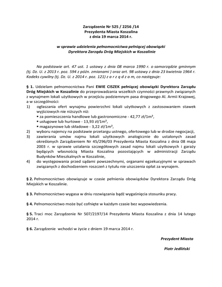 Zarządzenie Nr 525 / 2256 /14 Prezydenta Miasta Koszalina z dnia 19 marca 2014 r. w sprawie udzielenia pełnomocnictwa pełniącej obowiązki Dyrektora Zarządu Dróg Miejskich w Koszalinie Na podstawie art. 47 ust. 1 ustawy z dnia 08 marca 1990 r. o samorządzie gminnym (tj. Dz. U. z 2013 r. poz. 594 z późn. zmianami ) oraz art. 98 ustawy z dnia 23 kwietnia 1964 r. Kodeks cywilny (tj. Dz. U. z 2014 r. poz. 121) z a r z ą d z a m, co następuje: § 1. Udzielam pełnomocnictwa Pani EWIE CISZEK pełniącej obowiązki Dyrektora Zarządu Dróg Miejskich w Koszalinie do przeprowadzania wszelkich czynności prawnych związanych z wynajmem lokali użytkowych w przejściu podziemnym pasa drogowego Al. Armii Krajowej, a w szczególności: 1) ogłaszania ofert wynajmu powierzchni lokali użytkowych z zastosowaniem stawek wyjściowych nie niższych niż: za pomieszczenia handlowe lub gastronomiczne - 42,77 zł/1m², usługowe lub hurtowe - 13,93 zł/1m², magazynowe lub składowe - 3,22 zł/1m², 2) wyboru najemcy na podstawie przetargu ustnego, ofertowego lub w drodze negocjacji, 3) zawierania umów najmu lokali użytkowych analogicznie do ustalonych zasad określonych Zarządzeniem Nr 45/296/03 Prezydenta Miasta Koszalina z dnia 08 maja 2003 r. w sprawie ustalania szczegółowych zasad najmu lokali użytkowych i garaży będących własnością Miasta Koszalina pozostających w administracji Zarządu Budynków Mieszkalnych w Koszalinie, 4) do występowania przed sądami powszechnymi, organami egzekucyjnymi w sprawach związanych z dochodzeniem roszczeń z tytułu nie uiszczenia opłat za wynajem. § 2. Pełnomocnictwo obowiązuje w czasie pełnienia obowiązków Dyrektora Zarządu Dróg Miejskich w Koszalinie. § 3. Pełnomocnictwo wygasa w dniu rozwiązania bądź wygaśnięcia stosunku pracy. § 4. Pełnomocnictwo może być cofnięte w każdym czasie bez wypowiedzenia. § 5. Traci moc Zarządzenie Nr 507/2197/14 Prezydenta Miasta Koszalina z dnia 14 lutego 2014 r. § 6. Zarządzenie wchodzi w życie z dniem 19 marca 2014 r. Prezydent Miasta Piotr Jedliński