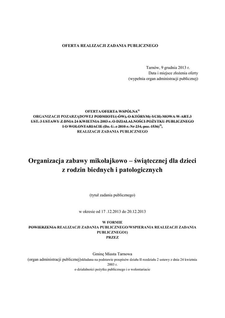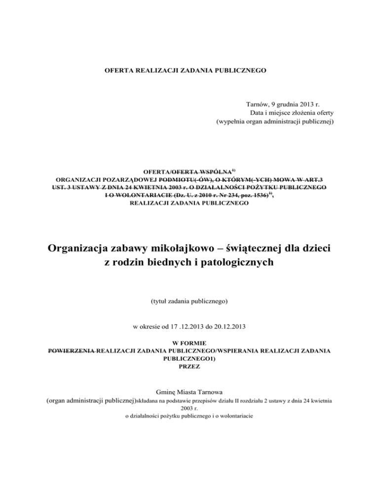 OFERTA REALIZACJI ZADANIA PUBLICZNEGO Tarnów, 9 grudnia 2013 r. Data i miejsce złożenia oferty (wypełnia organ administracji publicznej) OFERTA/OFERTA WSPÓLNA1) ORGANIZACJI POZARZĄDOWEJ PODMIOTU(-ÓW), O KTÓRYM(-YCH) MOWA W ART.3 UST. 3 USTAWY Z DNIA 24 KWIETNIA 2003 r. O DZIAŁALNOŚCI POŻYTKU PUBLICZNEGO I O WOLONTARIACIE (Dz. U. z 2010 r. Nr 234, poz. 1536) 1), REALIZACJI ZADANIA PUBLICZNEGO Organizacja zabawy mikołajkowo – świątecznej dla dzieci z rodzin biednych i patologicznych (tytuł zadania publicznego) w okresie od 17 .12.2013 do 20.12.2013 W FORMIE POWIERZENIA REALIZACJI ZADANIA PUBLICZNEGO/WSPIERANIA REALIZACJI ZADANIA PUBLICZNEGO1) PRZEZ Gminę Miasta Tarnowa (organ administracji publicznej)składana na podstawie przepisów działu II rozdziału 2 ustawy z dnia 24 kwietnia 2003 r. o działalności pożytku publicznego i o wolontariacie I. Dane oferenta/oferentów1),3) 1. pełna nazwa 2. forma prawna:4) Stowarzyszenie KANON stowarzyszenie kościelna osoba prawna spółdzielnia socjalna X fundacja kościelna jednostka organizacyjna Inna ……………………. 3. numer w Krajowym Rejestrze 0000376992 Sądowym, w innym rejestrze lub 5) ewidencji 4. data wpisu, rejestracji lub utworzenia6) 28.01.2011 r. 9930636493 5. NIP REGON 6.adres: 121452441 Tarnów miejscowość ulica Zbylitowska 5 dzielnica lub inna jednostka pomocnicza7) _ gmina _ powiat _ województwo małopolskie kod pocztowy 33-101 poczta Tarnów 7. tel. 603953185 fax b.d. e-mail [email protected] http:// www.stowarzyszeniekanon.pl 8. numer rachunku bankowego 83 1050 1562 1000 0090 3010 0276 nazwa banku ING Bank Śląski 9. nazwiska i imiona osób upoważnionych do reprezentowania oferenta/oferentów1) 10. nazwa, adres i telefon kontaktowy jednostki bezpośrednio wykonującej zadanie, o którym mowa w ofercie9) a) Iwona Snopkowska b) Andrzej Bernach Stowarzyszenie KANON Zbylitowska 5 33-101 Tarnów 11. osoba upoważniona do składania Iwona Snopkowska wyjaśnień i uzupełnień dotyczących oferty 603953185 (imię i nazwisko oraz nr telefonu kontaktowego) 12. przedmiot działalności pożytku publicznego a) działalność nieodpłatna pożytku publicznego NIE DOTYCZY. b) działalność odpłatna pożytku publicznego NIE DOTYCZY. 1) 1) 13. jeżeli oferent/oferenci prowadzi/prowadzą działalność gospodarczą a) numer wpisu do rejestru przedsiębiorców 0000376992 b) przedmiot działalności gospodarczej Zgodnie z załączonym statutem Stowarzyszenia KANON paragraf 6 pkt 1,2,3. III Szczegółowy zakres rzeczowy zadania publicznego proponowanego do realizacji 1. Krótka charakterystyka zadania publicznego Głównym celem jest organizacja zabawy mikołajkowo-świątecznej dla dzieci z rodzin biednych i patologicznych wszystkich świetlic środowiskowych działających na terenie miasta Tarnowa. Obdarowanie dzieci paczkami w których są słodycze i owoce, których na co dzień nie dostają. Wspólna zabawa z prawdziwym wodzirejem sprzyja integracji, poznaniu nowych kolegów i koleżanek. 2. Opis potrzeb wskazujących na konieczność wykonania zadania publicznego, opis ich przyczyn oraz skutków W Tarnowie jest kilka świetlic środowiskowych do których uczęszczają dzieci z rodzin biednych i patologicznych. Nie każda z tych świetlic ma możliwość zorganizowania zabawy świątecznej i spotkania ze Św. Mikołajem oraz zrobienia paczek z racji braku środków pieniężnych. Każda pomoc dla dzieci z rodzin będących w trudnej sytuacji materialnej jest wskazana i przynosi niewymierną radość i tego odbarowywanego i tego który obdarowywuje. 3. Opis grupy adresatów zadania publicznego Uczestnikami są dzieci w wieku od 6 do 17 lat zgłoszone przez poszczególne świetlice. Większość stanowią dzieci młodsze z rodzin dysfunkcyjnych, rozbitych, niepełnych, eurosieroty, z mieszkań komunalnych, blokowisk oraz rodzin o bardzo niskim statusie materialnym które uczęszczają do świetlic środowiskowych lub parafialnych - Matki Bożej Szkaplerznej ul. Gumniska -Miłosierdzia Bożego ul. Klikowska -NMP Królowej Polski w Mościcach -ze Stowarzyszenia Ich pasje - z TPD Łącznie 75 dzieci 4. Uzasadnienie potrzeby dofinansowania z dotacji inwestycji związanych z realizacją zadania publicznego, w szczególności ze wskazaniem, w jaki sposób przyczyni się to do podwyższenia standardu realizacji zadania11) Nie Dotyczy 5. Informacja, czy w ciągu ostatnich 5 lat oferent/oferenci1) otrzymał/otrzymali1) dotację na dofinansowanie inwestycji związanych z realizacją zadania publicznego z podaniem inwestycji, które zostały dofinansowane, organu, który udzielił dofinansowania, oraz daty otrzymania dotacji11) Nie dotyczy 6. Zakładane cele realizacji zadania publicznego oraz sposób ich realizacji Podtrzymanie tradycji spotkań ze Św. Mikołajem Obdarowanie paczkami które sprawią ogromną radość i uśmiech na twarzach dzieci Pożyteczne zagospodarowanie wolnego czasu Nauka pozytywnych zachowań, właściwych postaw wobec innych ludzi Poznanie poprzez zabawę nowych kolegów i koleżanek Troska o kulturę słowa , kulturę spożywania wspólnego posiłku 7. Miejsce realizacji zadania publicznego Aula w Zespole Szkół Ogólnokształcących nr. 1 w Tarnowie-Mościcach 8. Opis poszczególnych działań w zakresie realizacji zadania publicznego12) Zakup produktów potrzebnych do skompletowania paczek mikołajkowych Pozyskanie wolontariuszy do pomocy przy zabawie, posiłku i pakowaniu paczek Udekorowanie sali spotkania i zabawy przez wolontariuszy Pomoc przy przygotowaniu posiłku na Sali oraz dopilnowanie aby zabawa przebiegała zgodnie z założeniami. 9. Harmonogram13) Zadanie publiczne realizowane w okresie od 17 grudnia 2013. do 20 grudnia 2013 Poszczególne działania w zakresie Terminy realizacji Oferent lub inny podmiot realizowanego zadania poszczególnych odpowiedzialny za działanie w 14) publicznego działań zakresie realizowanego zadania publicznego Spotkanie organizacyjne i rozdzielenie