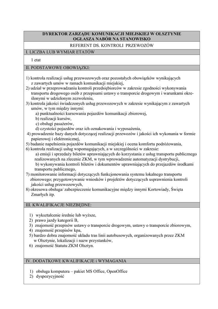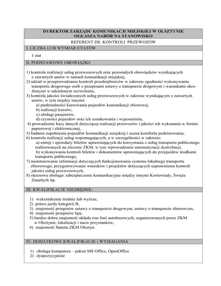 DYREKTOR ZARZĄDU KOMUNIKACJI MIEJSKIEJ W OLSZTYNIE OGŁASZA NABÓR NA STANOWISKO REFERENT DS. KONTROLI PRZEWOZÓW I. LICZBA LUB WYMIAR ETATÓW 1 etat II. PODSTAWOWE OBOWIĄZKI: 1) kontrola realizacji usług przewozowych oraz pozostałych obowiązków wynikających z zawartych umów w ramach komunikacji miejskiej, 2) udział w przeprowadzaniu kontroli przedsiębiorców w zakresie zgodności wykonywania transportu drogowego osób z przepisami ustawy o transporcie drogowym i warunkami określonymi w udzielonym zezwoleniu, 3) kontrola jakości świadczonych usług przewozowych w zakresie wynikającym z zawartych umów, w tym między innymi: a) punktualności kursowania pojazdów komunikacji zbiorowej, b) realizacji kursów, c) obsługi pasażerów, d) czystości pojazdów oraz ich oznakowania i wyposażenia, 4) prowadzenie bazy danych dotyczącej realizacji przewozów i jakości ich wykonania w formie papierowej i elektronicznej, 5) badanie napełnienia pojazdów komunikacji miejskiej i ocena komfortu podróżowania, 6) kontrola realizacji usług wspomagających, a w szczególności w zakresie: a) emisji i sprzedaży biletów uprawniających do korzystania z usług transportu publicznego realizowanych na zlecenie ZKM, w tym wprowadzenie automatyzacji dystrybucji, b) wykonywania kontroli biletów i dokumentów uprawniających do przejazdów środkami transportu publicznego, 7) monitorowanie informacji dotyczących funkcjonowania systemu lokalnego transportu zbiorowego; przygotowywanie wniosków i projektów dotyczących usprawnienia kontroli jakości usług przewozowych, 8) okresowa obsługa/ zabezpieczenie komunikacyjne między innymi Kortowiady, Święta Zmarłych itp. III. KWALIFIKACJE NIEZBĘDNE: 1) wykształcenie średnie lub wyższe, 2) prawo jazdy kategorii B, 3) znajomość przepisów ustawy o transporcie drogowym, ustawy o transporcie zbiorowym, 4) znajomość przepisów kpa, 5) bardzo dobra znajomość układu tras linii autobusowych, organizowanych przez ZKM w Olsztynie, lokalizacji i nazw przystanków, 6) znajomość Statutu ZKM Olsztyn. IV. DODATKOWE KWALIFIKACJE i WYMAGANIA 1) obsługa komputera – pakiet MS Office, OpenOffice 2) dyspozycyjność V. UMIEJĘTNOŚCI 1. umiejętność swobodnego formułowania myśli w mowie i na piśmie, 2. umiejętność analitycznego i logicznego myślenia, 3. sprawność, stanowczość, rzetelność, dokładność, systematyczność i terminowość w wykonywaniu powierzonych obowiązków, 4. umiejętność organizacji pracy na zajmowanym stanowisku, 5. odporność na stres, 6. komunikatywność. VI. WYMAGANE DOKUMENTY I OŚWIADCZENIA 1. CV oraz list motywacyjny, 2. Kopie dokumentów potwierdzających wymagane wykształcenie, 3. Kopie świadectw pracy, 4. Kopie posiadanych uprawnień i dodatkowych umiejętności, 5. Oświadczenie kandydata o wyrażeniu zgody na przetwarzanie danych osobowych do celów rekrutacji, 6. Oświadczenie o posiadaniu pełnej zdolności do czynności prawnych oraz korzystaniu z pełni praw publicznych 7. Oświadczenie, że kandydat nie był prawomocnie skazany za przestępstwo przeciwko mieniu, przeciwko obrotowi gospodarczemu, przeciwko działalności instytucji państwowych oraz samorządu terytorialnego, przeciwko wiarygodności dokumentów lub za przestępstwo skarbowe, 8. Oświadczenie o braku przeciwwskazań zdrowotnych do zajmowania stanowiska referenta ds. kontroli przewozów. VII.TERMIN I MIEJSCE SKŁADANIA DOKUMENTÓW Dokumenty należy składać osobiście w sekretariacie Zarządu Komunikacji Miejskiej lub przesłać pocztą w zamkniętych kopertach do dnia 20 lutego 2013 roku. W związku ze zmianą siedziby ZKM oferty do 15.02.2013 r. należy przesyłać na adres: Zarząd Komunikacji Miejskiej 10-170 Olsztyn ul. Gietkowska 9i, a po tym dniu na adres: 10-015 Olsztyn, ul. Knosały 3/5B z dopiskiem „Nabór na stanowisko referenta ds. kontroli przewozów Zarządu Komunikacji Miejskiej w Olsztynie”. Dokumenty, które wpłyną po tym dniu nie będą rozpatrywane. VIII.INNE INFORMACJE Wskaźnik zatrudnienia osób niepełnosprawnych w ZKM w Olsztynie kształtuje się na poziomie poniżej 6%. Dodatkowe informacje można uzyskać u Dyrektora ZKM w Olsztynie tel. 89-537-22-00. Dopuszcza się zatrudnienie na czas określony. W terminie 2 tygodni po ogłoszeniu wyniku naboru należy odebrać złożone dokumenty. Po upływie tego terminu dokumenty, które nie będą odebrane zostaną zniszczone komisyjnie. Dyrektor Zarządu Komunikacji Miejskiej w Olsztynie Jerzy Roman