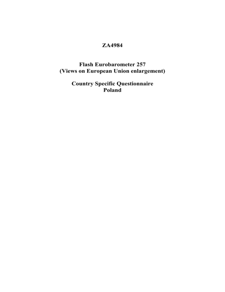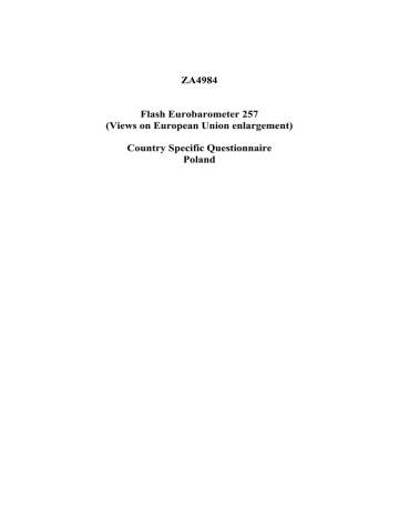 ZA4984 Flash Eurobarometer 257 (Views on European Union enlargement) Country Specific Questionnaire Poland FLASH 257 ‐ ENLARGEMENT W 1989, reżimy państw Europy Centralno‐Wschodniej związane ze Związkiem Radzieckim upadły i w wielu krajach miały miejsce znaczące zmiany polityczne. Te wydarzenia są obecnie znane pod ogólną nazwą “upadku żelaznej kurtyny” lub “upadku muru berlińskiego”. W 2004 roku osiem krajów Europy Centralno‐Wschodniej przyłączyło się do Unii Europejskiej, a następnie w 2007 roku przyłączyła się Bułgaria i Rumunia. Chcielibyśmy poznać Pana(i) opinię na temat tych dwóch wydarzeń, upadku Żelaznej Kurtyny dwadzieścia lat temu oraz integracji krajów Europy Centralno‐Wschodniej z Unią Europejską. Q1. Mając na uwadze zmiany, które nastąpiły po “upadku żelaznej kurtyny” w 1989 roku, czy zgodził(a)by się Pan(i), czy też nie zgodził(a) z następującymi stwierdzeniami? ‐ Zgadza się .............................................................................................1 ‐ Nie zgadza się ......................................................................................2 ‐ [Nie wie/brak odpowiedzi] ..................................................................9 a) Te zmiany przyniosły każdemu w Europie więcej wolności ..........................................................1 2 9 b) Te zmiany spowodowały wyższy standard życia w Centralnej i Wschodniej Europie...................1 2 9 c) Te zmiany stworzyły nowe możliwości tylko dla młodej generacji................................................1 2 9 d) Te zmiany przyczyniły się do zniknięcia granic i pozwoliły na swobodny przepływ ludzi wewnątrz Europy ....................................................................................................................................1 2 9 e) Te zmiany były ważne tylko dla krajów Centralnej i Wschodniej Europy......................................1 2 9 f) Te zmiany zaoferowały dobre możliwości biznesowe dla firm z Europy Zachodniej w Centralnej i Wschodniej Europie ...............................................................................................................1 2 9 Q2. A teraz chciał(a)bym poprosić Pana(ią), aby ocenił(a) Pan(i) ogólnie wpływ tych zmian. Czy zgodził(a)by się Pan(i), czy też nie zgodził(a) z następującymi stwierdzeniami? ‐ Zgadza się .............................................................................................1 ‐ Nie zgadza się ......................................................................................2 ‐ [Nie wie/brak odpowiedzi] ..................................................................9 a) Jakość życia w krajach Centralnej i Wschodniej Europy znacząco poprawiła się od 1989 roku....1 2 9 b) Sytuacja, która dominowała w krajach Centralnej i Wschodniej Europy przed 1989 rokiem była lepsza niż ta obecna ...............................................................................................................1 2 9 c) Te zmiany spowodowały, że życie w naszym kraju stało się bardziej niebezpieczne....................1 2 9 Q3. Odnośnie konsekwencji integracji Centralnej i Wschodniej Europy z Unią Europejską, czy zgodził(a)by się Pan(i), czy też nie zgodził(a) z następującymi stwierdzeniami? ‐ Zgadza się .............................................................................................1 ‐ Nie zgadza się .......................................................................................2 ‐ [Nie wie/brak odpowiedzi] ..................................................................9 a) Pomogło to zachować bezpieczeństwo i stabilność w całej Europie ............................................1 2 9 b) Stworzyło to problemy, z powodu istnienia zbyt różnych kultur i wartości wśród różnych krajów Unii Europejskiej ....................................................................................................................1 2 9 c) Doprowadziło to do rozprzestrzenienia wartości demokratycznych i skonsolidowało ochronę praw człowieka w całej Europie ......................................................................................................1 2 9 d) Przyczyniło się do utraty pracy w naszym kraju ............................................................................1 2 9 e) Zwiększyło wagę Unii Europejskiej w światowej polityce ............................................................1 2 9 f) Obniżyło standard socjalny Europie jako całości ...........................................................................1 2 9 g) Zwiększyło dobrobyt i gospodarczą konkurencyjność Europy jako całości...................................1 2 9 h) Zwiększyło poczucie niebezpieczeństwa w Europie jako całości .................................................1 2 9 i) Zwiększyło bezpieczeństwo Europy umożliwiając postęp w walce przeciwko zorganizowanej przestępczości oraz nielegalnej emigracji ..............................................................................1 2 9 j) Doprowadziło do wzrostu i modernizacji w gospodarkach krajów Centralnej i Wschodniej Europy ... ...............................................................................................................................................1 2 9 k) Doprowadziło do tego, że kraje Zachodniej Europy dokonały ogromnych finansowych transferów , aby pomóc tym krajom w modernizacji .................................................................................1 2 9 l) Zwiększyło to możliwości ludzi w zakresie swobodnego przemieszczania się i podróżowania wewnątrz Unii Europejskiej....................................................................................................1 2 9 m) Spowodowało, że Unia Europejska jest trudniejsza do zarządzania ...........................................1 2 9 Q4A. W przypadku, 
