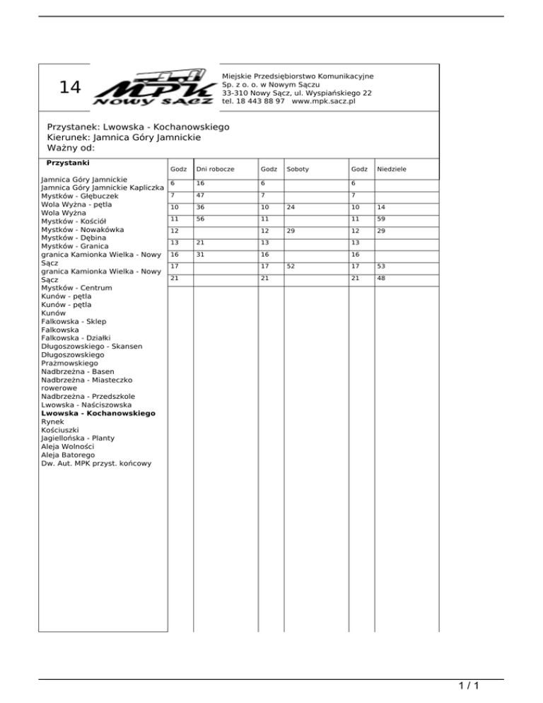 Miejskie Przedsiębiorstwo Komunikacyjne Sp. z o. o. w Nowym Sączu 33-310 Nowy Sącz, ul. Wyspiańskiego 22 tel. 18 443 88 97 www.mpk.sacz.pl 14 Przystanek: Lwowska - Kochanowskiego Kierunek: Jamnica Góry Jamnickie Ważny od: Przystanki Jamnica Góry Jamnickie Jamnica Góry Jamnickie Kapliczka Mystków - Głębuczek Wola Wyżna - pętla Wola Wyżna Mystków - Kościół Mystków - Nowakówka Mystków - Dębina Mystków - Granica granica Kamionka Wielka - Nowy Sącz granica Kamionka Wielka - Nowy Sącz Mystków - Centrum Kunów - pętla Kunów - pętla Kunów Falkowska - Sklep Falkowska Falkowska - Działki Długoszowskiego - Skansen Długoszowskiego Prażmowskiego Nadbrzeżna - Basen Nadbrzeżna - Miasteczko rowerowe Nadbrzeżna - Przedszkole Lwowska - Naściszowska Lwowska - Kochanowskiego Rynek Kościuszki Jagiellońska - Planty Aleja Wolności Aleja Batorego Dw. Aut. MPK przyst. końcowy Godz Dni robocze Godz 6 16 6 7 47 7 10 36 10 11 56 11 12 12 Soboty Godz 6 7 24 29 10 14 11 59 12 29 13 21 13 13 16 31 16 16 17 17 21 21 Niedziele 52 17 53 21 48 1/1 Powered by TCPDF (www.tcpdf.org)