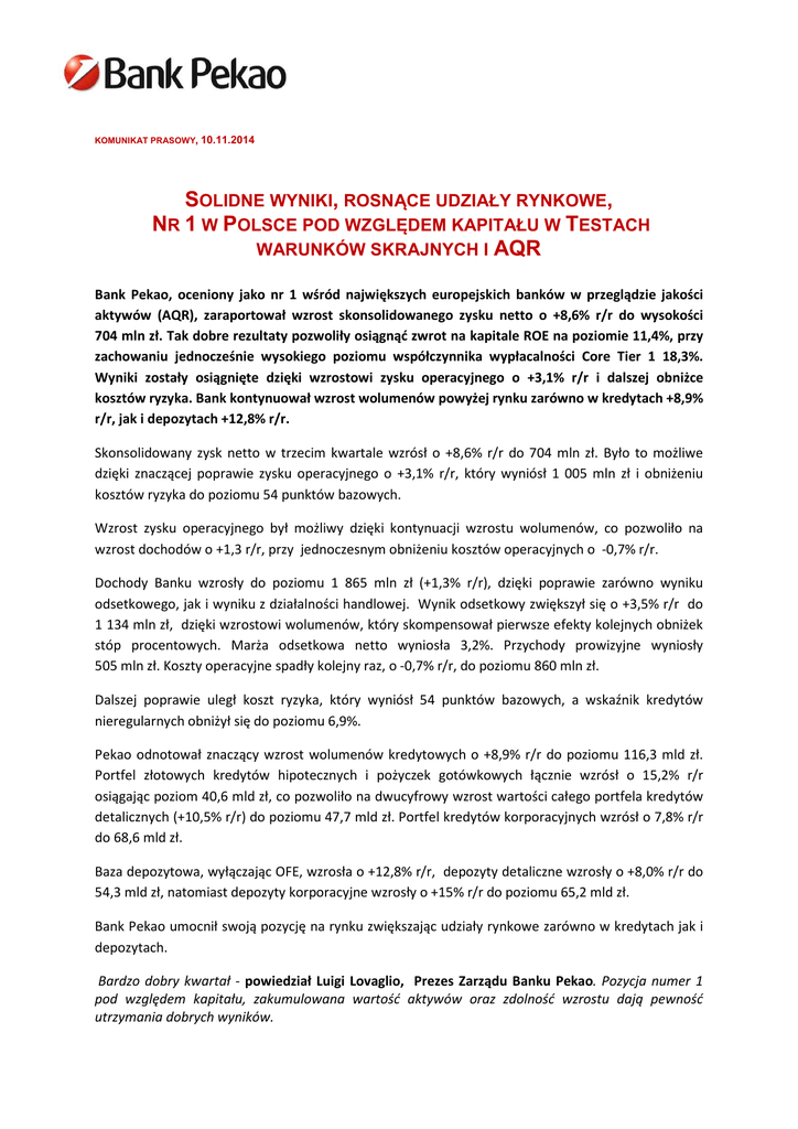 KOMUNIKAT PRASOWY, 10.11.2014 SOLIDNE WYNIKI, ROSNĄCE UDZIAŁY RYNKOWE, NR 1 W POLSCE POD WZGLĘDEM KAPITAŁU W TESTACH WARUNKÓW SKRAJNYCH I AQR Bank Pekao, oceniony jako nr 1 wśród największych europejskich banków w przeglądzie jakości aktywów (AQR), zaraportował wzrost skonsolidowanego zysku netto o +8,6% r/r do wysokości 704 mln zł. Tak dobre rezultaty pozwoliły osiągnąć zwrot na kapitale ROE na poziomie 11,4%, przy zachowaniu jednocześnie wysokiego poziomu współczynnika wypłacalności Core Tier 1 18,3%. Wyniki zostały osiągnięte dzięki wzrostowi zysku operacyjnego o +3,1% r/r i dalszej obniżce kosztów ryzyka. Bank kontynuował wzrost wolumenów powyżej rynku zarówno w kredytach +8,9% r/r, jak i depozytach +12,8% r/r. Skonsolidowany zysk netto w trzecim kwartale wzrósł o +8,6% r/r do 704 mln zł. Było to możliwe dzięki znaczącej poprawie zysku operacyjnego o +3,1% r/r, który wyniósł 1 005 mln zł i obniżeniu kosztów ryzyka do poziomu 54 punktów bazowych. Wzrost zysku operacyjnego był możliwy dzięki kontynuacji wzrostu wolumenów, co pozwoliło na wzrost dochodów o +1,3 r/r, przy jednoczesnym obniżeniu kosztów operacyjnych o -0,7% r/r. Dochody Banku wzrosły do poziomu 1 865 mln zł (+1,3% r/r), dzięki poprawie zarówno wyniku odsetkowego, jak i wyniku z działalności handlowej. Wynik odsetkowy zwiększył się o +3,5% r/r do 1 134 mln zł, dzięki wzrostowi wolumenów, który skompensował pierwsze efekty kolejnych obniżek stóp procentowych. Marża odsetkowa netto wyniosła 3,2%. Przychody prowizyjne wyniosły 505 mln zł. Koszty operacyjne spadły kolejny raz, o -0,7% r/r, do poziomu 860 mln zł. Dalszej poprawie uległ koszt ryzyka, który wyniósł 54 punktów bazowych, a wskaźnik kredytów nieregularnych obniżył się do poziomu 6,9%. Pekao odnotował znaczący wzrost wolumenów kredytowych o +8,9% r/r do poziomu 116,3 mld zł. Portfel złotowych kredytów hipotecznych i pożyczek gotówkowych łącznie wzrósł o 15,2% r/r osiągając poziom 40,6 mld zł, co pozwoliło na dwucyfrowy wzrost wartości całego portfela kredytów detalicznych (+10,5% r/r) do poziomu 47,7 mld zł. Portfel kredytów korporacyjnych wzrósł o 7,8% r/r do 68,6 mld zł. Baza depozytowa, wyłączając OFE, wzrosła o +12,8% r/r, depozyty detaliczne wzrosły o +8,0% r/r do 54,3 mld zł, natomiast depozyty korporacyjne wzrosły o +15% r/r do poziomu 65,2 mld zł. Bank Pekao umocnił swoją pozycję na rynku zwiększając udziały rynkowe zarówno w kredytach jak i depozytach. Bardzo dobry kwartał - powiedział Luigi Lovaglio, Prezes Zarządu Banku Pekao. Pozycja numer 1 pod względem kapitału, zakumulowana wartość aktywów oraz zdolność wzrostu dają pewność utrzymania dobrych wyników.