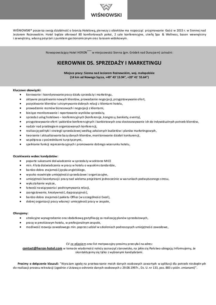 WIŚNIOWSKI® poszerza swoją działalność o branżę Hotelową, pierwszy z obiektów ma rozpocząć przyjmowanie Goś ci w 2015 r. w Siennej nad Jeziorem Rożnowski m. Hotel będzie oferowa ł 80 komfortowych pokoi , 2 sale konferencyjne, s trefę Spa & Wellness, basen wewnętrzny i zewnętrzny, własną przys tań z punktem gas tronomi cznym ora z ta rasem widokowym. Nowopows ta jący Hotel HERON**** w miejscowości Sienna (gm. Gródek nad Duna jcem) za trudni : KIEROWNIK DS. SPRZEDAŻY I MARKETINGU Miejsce pracy: Sienna nad Jeziorem Rożnowskim, woj. małopolskie (14 km od Nowego Sącza, +49° 43' 13.94", +20° 41' 55.64") Kluczowe obowiązki: kierowanie i koordynowanie pra cy działu sprzeda ży i ma rketingu, aktywne pozyski wanie nowych klientów, prowadzenie negocja cji, przygotowywanie ofert, pozyskiwanie klientów i utrzymywa nie dobrych relacji z klienta mi hotelu, prowadzenie rozmów biznesowych i negocja cji z klienta mi, bieżące monitorowanie i raportowanie wyników sprzeda ży, sprzeda ż usług hotelowo – konferencyjnych (konferencje, kongres y, bankiety, eventy), przygotowywanie ofert i pakietów konferencyjnych i bankietowych oraz dostosowywanie i ch do indywidualnych potrzeb klientów, nadzór nad przebiegiem organizowanych konferencji, realiza cję poli tyki i stra tegii sprzeda żowej według założonych budżetów i planów ma rketingowych, tworzenie i aktualizowanie ba zy danych klientów, moni torowanie działań konkurencji , ws półpra ca z poś rednika mi turys tycznymi , spełnianie funkcji reprezenta cyjnych i promowanie dobrego wizerunku hotelu, Oczekiwania wobec kandydatów: popa rte sukcesami doś wiadczenie w sprzeda ży w sektorze MICE mi n. 4 la ta doświadczenia w pra cy w hotelu o wys oki m s tanda rdzie, ba rdzo dobra zna jomoś ć języka angielskiego, wysoko rozwini ęte umiejętnoś ci sprzeda żowe i organi za cyjne, umiejętnoś ć koordyna cji i pra cy nad wieloma projektami jednocześnie w wa runkach podwyższonego s tresu, wyks zta łcenie wyżs ze, ła twość na wiązywania i podtrzymywania rela cji, zaa nga żowanie, kreatywnoś ć, dyspozycyjnoś ć, ba rdzo dobra zna jomoś ć pakietu Offi ce (w s zczególnoś ci Excel ), dobrej organiza cji pra cy własnej i umiejętność pra cy w zespole, Oferujemy: a trakcyjne wynagrodzenie ora z doda tkową gra tyfi ka cję za realizację planów sprzedażowych, pra cę w presti żowym hotelu, w profesjonalnym zespole, możliwoś ć rozwoju za wodowego min. poprzez udział w s zkoleniach podnoszących umiejętnoś ci zawodowe, CV ze zdjęciem oraz list motywa cyjny prosimy przes yła ć na adres : [email protected] w tema cie wiadomoś ci należy zazna czyć s tanowisko, na jakie si ę Pańs two ubiega ją. Informujemy, że skontaktujemy się tyl ko z wybranymi kandyda tami . Prosimy o dołączenie klauzuli: "Wyra żam zgodę na przetwa rzanie moi ch danych osobowych za wa rtych w aplika cji dla potrzeb niezbędn ych do realizacji procesu rekruta cji (zgodnie z Us tawą o ochronie danych osobowych z 29.08.1997r., Dz. U. nr 133, poz. 883 z późn. zmianami)".