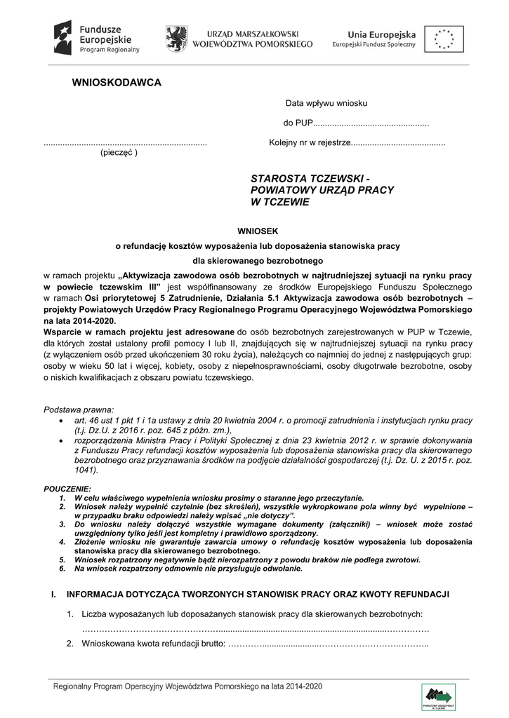 WNIOSKODAWCA Data wpływu wniosku do PUP................................................. ..................................................................... (pieczęć ) Kolejny nr w rejestrze........................................ STAROSTA TCZEWSKI POWIATOWY URZĄD PRACY W TCZEWIE WNIOSEK o refundację kosztów wyposażenia lub doposażenia stanowiska pracy dla skierowanego bezrobotnego w ramach projektu „Aktywizacja zawodowa osób bezrobotnych w najtrudniejszej sytuacji na rynku pracy w powiecie tczewskim III” jest współfinansowany ze środków Europejskiego Funduszu Społecznego w ramach Osi priorytetowej 5 Zatrudnienie, Działania 5.1 Aktywizacja zawodowa osób bezrobotnych – projekty Powiatowych Urzędów Pracy Regionalnego Programu Operacyjnego Województwa Pomorskiego na lata 2014-2020. Wsparcie w ramach projektu jest adresowane do osób bezrobotnych zarejestrowanych w PUP w Tczewie, dla których został ustalony profil pomocy I lub II, znajdujących się w najtrudniejszej sytuacji na rynku pracy (z wyłączeniem osób przed ukończeniem 30 roku życia), należących co najmniej do jednej z następujących grup: osoby w wieku 50 lat i więcej, kobiety, osoby z niepełnosprawnościami, osoby długotrwale bezrobotne, osoby o niskich kwalifikacjach z obszaru powiatu tczewskiego. Podstawa prawna: art. 46 ust 1 pkt 1 i 1a ustawy z dnia 20 kwietnia 2004 r. o promocji zatrudnienia i instytucjach rynku pracy (t.j. Dz.U. z 2016 r. poz. 645 z późn. zm.), rozporządzenia Ministra Pracy i Polityki Społecznej z dnia 23 kwietnia 2012 r. w sprawie dokonywania z Funduszu Pracy refundacji kosztów wyposażenia lub doposażenia stanowiska pracy dla skierowanego bezrobotnego oraz przyznawania środków na podjęcie działalności gospodarczej (t.j. Dz. U. z 2015 r. poz. 1041). POUCZENIE: 1. W celu właściwego wypełnienia wniosku prosimy o staranne jego przeczytanie. 2. Wniosek należy wypełnić czytelnie (bez skreśleń), wszystkie wykropkowane pola winny być wypełnione – w przypadku braku odpowiedzi należy wpisać „nie dotyczy”. 3. Do wniosku należy dołączyć wszystkie wymagane dokumenty (załączniki) – wniosek może zostać uwzględniony tylko jeśli jest kompletny i prawidłowo sporządzony. 4. Złożenie wniosku nie gwarantuje zawarcia umowy o refundację kosztów wyposażenia lub doposażenia stanowiska pracy dla skierowanego bezrobotnego. 5. Wniosek rozpatrzony negatywnie bądź nierozpatrzony z powodu braków nie podlega zwrotowi. 6. Na wniosek rozpatrzony odmownie nie przysługuje odwołanie. I. INFORMACJA DOTYCZĄCA TWORZONYCH STANOWISK PRACY ORAZ KWOTY REFUNDACJI 1. Liczba wyposażanych lub doposażanych stanowisk pracy dla skierowanych bezrobotnych: ………………………………………….......................................................................…………… 2. Wnioskowana kwota refundacji brutto: …………........................……………………….……….. II. DANE DOTYCZĄCE WNIOSKODAWCY Nazwa Wnioskodawcy lub w przypadku osoby fizycznej imię, nazwisko i PESEL: 1. ..................................................................................................................................................... ..................................................................................................................................................... Adres siedziby albo adres miejsca zamieszkania: 2. ….………………………………………………………………...............................………………….. ..................................................................................................................................................... Data rozpoczęcia prowadzenia działalności: 3. ..................................................................................................................................................... 4. Numer REGON: ...................................................................................................................... 5. Numer NIP: ............................................................................................................................. 6. Nazwa banku i numer konta podmiotu: ………...……….......................………………………... 7. Nr telefonu: ……………………………………………………........................…………………….. 8. Forma prawna prowadzonej działalności: (zaznaczyć x) 1. Przedsiębiorstwo państwowe 2. Jednoosobowa spółka Skarbu Państwa 3. Spółka, w której jednostka samorządu terytorialnego posiada 100% akcji lub udziałów 4. Spółka akcyjna albo spółka z ograniczoną odpowiedzialnością, w stosunku, do których Skarb Państwa, jednostka samorządu terytorialnego oraz państwa lub komunalna jednostka organizacyjna są podmiotami dominującymi w rozumieniu przepisów ustawy z dnia 21 sierpnia 1997 r. – Prawo o publicznym obrocie papierami wartościowymi 5. Przedsiębiorca prywatny, w tym wspólnik spółki cywilnej, osoba fizyczna prowadząca działalność gospodarczą oraz przedsiębiorca nienależący do kategorii wymienionych wyżej 6. Inny (podać, jaki) 9. Wielkość przedsiębiorcy (zaznaczyć x) 1. Mikroprzedsiębiorca – przedsiębiorstwo zatrudniające mniej niż 10 osób i którego obroty roczne lub roczna suma bilansowa nie przekracza 2 mln euro 2. Przedsiębiorca mały - przedsiębiorstwo zatrudniające mniej niż 50 osób i którego obroty roczne lub roczna suma bilansowa nie przekracza 10 mln euro 3. Przedsiębiorca średni - przedsiębiorstwo zatrudniające mniej niż 250 osób i którego obroty roczne nie przekraczają 50 mln euro lub roczna suma bilansowa nie przekracza 43 mln euro 4. Inny przedsiębiorca 10. Forma opodatkowania 1. Karta podatkowa 2. Ryczałt od przychodów ewidencjonowanych 3. Zasady ogólne - (podać stawkę) 4. Pełna księgowość - (podać stawkę) (zaznaczyć x) III. DANE DOTYCZĄCE PRO