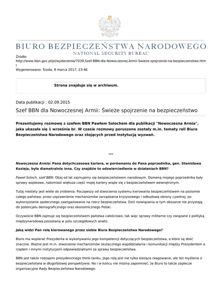 Źródło: http://www.bbn.gov.pl/pl/wydarzenia/7039,Szef-BBN-dla-Nowoczesnej-Armii-Swieze-spojrzenie-na-bezpieczenstwo.htm l Wygenerowano: Środa, 8 marca 2017, 23:46 Strona znajduje się w archiwum. Data publikacji : 02.09.2015 Szef BBN dla Nowoczesnej Armii: Świeże spojrzenie na bezpieczeństwo Prezentujemy rozmowę z szefem BBN Pawłem Solochem dla publikacji "Nowoczesna Armia", jaka ukazała się 1 września br. W czasie rozmowy poruszone zostały m.in. tematy roli Biura Bezpieczeństwa Narodowego oraz stojących przed instytucją wyzwań. *** Nowoczesna Armia: Pana dotychczasowa kariera, w porównaniu do Pana poprzednika, gen. Stanisława Kozieja, była diametralnie inna. Czy znajdzie to odzwierciedlenie w działaniach BBN? Paweł Soloch, szef BBN: Obaj od lat zajmujemy się bezpieczeństwem narodowym. Domeną mojego poprzednika były sprawy wojskowe, natomiast większa część mojej kariery wiąże się z bezpieczeństwem wewnętrznym. Tutaj niestety jest wiele do zrobienia. Począwszy od stworzenia systemu kierowania bezpieczeństwem na poziomie całego państwa, przez usprawnienie mechanizmów zarządzania kryzysowego i odbudowę obrony cywilnej, po wykorzystanie społecznego zaangażowanie na rzecz bezpieczeństwa. Dziś rozwiązania w tym obszarze nie przystają do potencjału demograficznego oraz ekonomicznego Polski. Oczywiście BBN zajmuje się bezpieczeństwem państwa całościowo, tak więc sprawy militarne czy związane z polityką międzynarodową pozostaną w polu szczegółowych analiz. Jaką widzi Pan rolę kierowanego przez siebie Biura Bezpieczeństwa Narodowego? Biuro ma wspierać Prezydenta w wykonywaniu jego kompetencji dotyczących bezpieczeństwa, a które są dość znaczne. Ważne jest m.in. stworzenie mechanizmów skutecznego współdziałania i komunikacji między Prezydentem a rządem i innymi instytucjami odpowiedzialnymi za sprawy bezpieczeństwa. BBN jest także rodzajem prezydenckiego think-tanku. Jego rolą jest nie tylko bieżące reagowanie, ale też myślenie o bezpieczeństwie w długofalowej perspektywie. No i w końcu nie można zapomnieć, że Biuro to także zaplecze organizacyjne Rady Bezpieczeństwa Narodowego. Czy będzie Pan kontynuował działania poprzedniego składu BBN, który był aktywny w dziedzinie współtworzenia doktryn bezpieczeństwa i obronności Polski? Pewne elementy kontynuacji są oczywiście konieczne. W tym m.in. wspomniany udział BBN w przygotowywaniu dokumentów strategicznych dotyczących bezpieczeństwa, a które są wydawane bądź zatwierdzane przez Prezydenta. Jednak jestem też zdania, że świeże spojrzenie na kompetencje i rolę instytucji pozwala dostrzec potencjał, który wcześniej był niedostrzegany i niewykorzystywany. Mogę zapewnić, że BBN z pewnością będzie aktywne i widoczne w pracach nad zwiększaniem bezpieczeństwa państwa. Generuj PDF Drukuj Powiadom znajomego Tweetnij