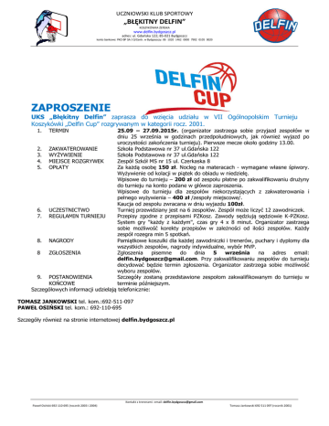 UCZNIOWSKI KLUB SPORTOWY „BŁĘKITNY DELFIN” KOSZYKÓWKA ŻEŃSKA www.delfin.bydgoszcz.pl adres: ul. Gdańska 122; 85-021 Bydgoszcz konto bankowe: PKO BP SA I O/Centr. w Bydgoszczy: 06 1020 1462 0000 7902 0105 0020 ZAPROSZENIE UKS „Błękitny Delfin” zaprasza do wzięcia udziału w VII Ogólnopolskim Turnieju Koszykówki „Delfin Cup” rozgrywanym w kategorii rocz. 2001. 1. TERMIN 25.09 – 27.09.2015r. (organizator zastrzega sobie przyjazd zespołów w dniu 25 września w godzinach przedpołudniowych, jak również wyjazd po uroczystości zakończenia turnieju). Pierwsze mecze około godziny 13.00. 2. ZAKWATEROWANIE Szkoła Podstawowa nr 37 ul.Gdańska 122 3. WYŻYWIENIE Szkoła Podstawowa nr 37 ul.Gdańska 122 4. MIEJSCE ROZGRYWEK Zespół Szkół MS nr 15 ul. Czerkaska 8 5. OPŁATY Za każdą osobę 150 zł. Nocleg na materacach - wymagane własne śpiwory. Wyżywienie od kolacji w piątek do obiadu w niedzielę. Wpisowe do turnieju – 200 zł od zespołu płatne po zakwalifikowaniu drużyny do turnieju na konto podane w główce zaproszenia. Wpisowe do turnieju dla zespołów niekorzystających z zakwaterowania i pełnego wyżywienia – 400 zł /zespoły miejscowe/. Kaucja od zespołu zwracana w dniu wyjazdu 100zł. 6. UCZESTNICTWO Turniej przewidziany jest na 6 zespołów. Zespół może liczyć 12 zawodniczek. 7. REGULAMIN TURNIEJU Przepisy zgodne z przepisami PZKosz. Zawody sędziują sędziowie K-PZKosz. System gry "każdy z każdym", czas gry 4 x 8 minut. Organizator zastrzega sobie możliwość korekty przepisów w zależności od ilości zespołów. Każdy zespół rozegra min 5 spotkań. 8. NAGRODY Pamiątkowe koszulki dla każdej zawodniczki i trenerów, puchary i dyplomy dla wszystkich zespołów, nagrody indywidualne, wybór MVP. 8 ZGŁOSZENIA Zgłoszenia pisemne do dnia 5 września na adres email: [email protected]. Przy zakwalifikowaniu zespołów do turnieju decydować będzie termin zgłoszenia. Organizator zastrzega sobie możliwość wyboru zespołów. 9. POSTANOWIENIA Szczegóły zostaną przedstawione zespołom zakwalifikowanym do turnieju w KOŃCOWE terminie późniejszym. Szczegółowych informacji udzielają telefonicznie: TOMASZ JANKOWSKI tel. kom.:692-511-097 PAWEŁ OSIŃSKI tel. kom.: 692-110-695 Szczegóły również na stronie internetowej delfin.bydgoszcz.pl Kontakt z trenerami: email: [email protected] Paweł Osiński 692 110 695 (rocznik 2003 i 2004) Tomasz Jankowski 692 511 097 (rocznik 2001)
