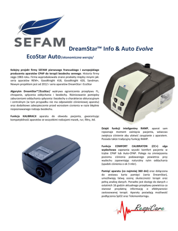 DreamStar™ Info & Auto Evolve EcoStar Auto/ekonomiczna wersja/ Kolejny projekt firmy SEFAM pierwszego francuskiego i europejskiego producenta aparatów CPAP do terapii bezdechu sennego. Historia firmy sięga 1983 roku. Firma wyprodukowała znane produkty między innymi jak: seria aparatów REM+, GoodKnight 418, GoodKnight 420, Sandman. Nowym projektem jest od 2012 r seria aparatów DreamStar i EcoStar Algorytm DreamStar™/EcoStar/ wykrywa ograniczenia przepływu FL, chrapanie, spłycenia oddychania i bezdechy. Różnicowanie pomiędzy zaburzeniami oddychania spłycenia i bezdechy o charakterze obturacyjnym i centralnym (w tym przypadku nie ma odpowiedzi ciśnieniowej aparatu) oraz dodatkowe zabezpieczenie przed wzrostem cisnienia w razie błędnie rozpoznawanego rodzaju bezdechu. Funkcja KALIBRACJI aparatu do obwodu pacjenta, gwarantując kompatybilność aparatów ze wszystkimi rodzajami masek, rur, filtry, itd. Dzięki funkcji inteligentny RAMP, aparat sam rzpoznaje moment zaśnięcia pacjenta, wówczas zwiększa ciśnienie aby ułatwić zasypianie z aparatem. Posiada także tradycyjny funkcję RAMP. Funkcja COMFORT CALIBRATON (CC+) ulga wydechowa zapewnia wysoki komfort pacjenta w trybie CPAP lub Auto-CPAP. Polega na zmniejszeniu poziomu ciśnienia podawanego powietrza przy wydechu zapewniając naturalny rytm oddychania (spadek ciśnienia o ok 3 mbr). Pamięć aparatu (co najmniej 360 dni) oraz dołączona do zestawu karta pamięci (seria DreamStar), umożliwiają łatwą ocenę skuteczności terapii oraz pełną analizę danych. Ponadto jest dostęp do danych z ostatnich 16 godzin aktualnego przepływu powietrza co stanowi przydatną informację o efektywności zastosowanej terapii. Aparaty posiadają możliwość podłączenia SpO2 oraz Telemonitoringu. Oprogramowanie DreamStar™ Analyze jest w języku polskim, przyjazne dla użytkownika, pozwala na łatwe pobieranie i drukowanie danych terapii. Czytelny raport ułatwia analizowanie zapisu przebiegu leczenia. Dane z aparatu mogą być pobierane przez kabel USB lub dołączoną do zestawu kartę pamięci. Aparaty DreamStar™ Info i Auto lub bilevel wraz z wbudowanym nawilżaczem gwarantują komfort oddychania. Nawilżacz wraz z podgrzewaczem wkomponowany został z tyłu urządzenia. Zbiornik na wodę oraz filtr powietrza jest łatwy do wyjęcia i czyszczenia. Charakteryzują się małym rozmiarem oraz niskim poziomem hałasu (26 dB). ŁATWOŚĆ STOSOWANIA • Czytelny podświetlany wyświetlacz, dane o efektywności terapii pokazane są na wyświetlaczu aparatu (ciśnienie, AHI -centralny i obturacyjny, przecieki z maski, itd.) • Automatyczne przypomnienia dla Pacjenta (czyszczenie filtra, wizyta lekarska, przegląd) • Duże podświetlane przyciski • Komunikaty w języku polskim • Możliwość zasilania z zewnętrznego akumulatora (np.: z gniazda zapalniczki samochodowej) • Wgrywanie danych terapii poprzez kartę DreamStar • Funkcja rampowania - narastania ciśnienia ułatwiająca zasypianie DANE TECHNICZNE • Wymiary 20x23x12 • Waga 1,5 kg razem z nawilżaczem i zasilaczem seria Dream Star Waga 750 gram – seria EcoStar • Napięcie zasilania 100 – 240 V AC • Możliwość podłączenia zewnętrznego przez kabel 12 V (gniazdko samochodowe) • Automatyczna kompensacja przecieku • Ciśnienie: 4 – 20 cm H2O Czas rampowania (narastania): 0 – 45 min Pamięć : 365 dni Pobór mocy: max 30W • Poziom hałasu: < 26 dBA DYSTRYBUTOR W POLSCE: RespiCare ul. Leszno 34/36, 01 – 199 Warszawa tel/fax 22 400 07 07, kom: 692 495 196 email: [email protected] www.respicare.pl