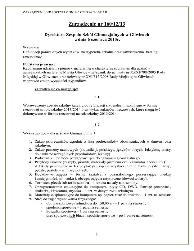 ZARZĄDZENIE NR 160/12/13 Z DNIA 6 CZERWCA 2013 R Zarządzenie nr 160/12/13 Dyrektora Zespołu Szkół Gimnazjalnych w Gliwicach z dnia 6 czerwca 2013r. W sprawie: Refundacji poniesionych wydatków na stypendia szkolne oraz zatwierdzenia katalogu rzeczowego. Podstawa prawna : Regulaminu udzielania pomocy materialnej o charakterze socjalnym dla uczniów zamieszkałych na terenie Miasta Gliwice – załącznik do uchwały nr XXXI/790/2005 Rady Miejskiej w Gliwicach oraz uchwały nr XVI/513/2008 Rady Miejskiej w Gliwicach w sprawie zmian wysokości stypendiów. zarządza się co następuje: §1 Wprowadzony zostaje szkolny katalog do refundacji stypendium szkolnego w formie rzeczowej na rok szkolny 2013/2014 oraz wykaz zakupów rzeczowych, które mogą być dokonywane w formie rzeczowej na rok szkolny 2013/2014. §2 Wykaz zakupów dla uczniów Gimnazjum nr 1: 1. Zakup podręczników zgodnie z listą podręczników obowiązujących w danym roku szkolnym. 2. Zakup pomocy naukowych (słowniki j. polskiego, języków obcych, leksykon, atlasy do nauki poszczególnych przedmiotów, lektury). 3. Podręczniki i pomoce przygotowujące do egzaminu gimnazjalnego. 4. Przybory szkolne (zeszyty, piórnik, materiały piśmiennicze, kalkulator, teczki, itp.). Artykuły papiernicze na lekcje plastyki, zajęcia artystyczne m.in. bloki, brystol, farby, pędzle, pastele – w miarę potrzeb. 5. Dodatkowe zajęcia – formy kształcenia pozaszkolnego poszerzające wiedzę i umiejętności, np. nauka j. obcego, zajęcia artystyczne (dowód wpłaty). 6. Tornister, plecak lub torba szkolna – 1 sztuka na cały rok szkolny. 7. Oprogramowanie edukacyjne do komputera, płyty CD, DWD. Pamięć przenośna, drukarka, klawiatura, myszka – 1 szt. w danym roku szkolnym. 8. Materiały eksploatacyjne do komputera np. papier, tusz do drukarki – 1 szt. na semestr 9. Strój do zajęć wychowania fizycznego: - obuwie sportowe (refundacja do 150,00 zł) – 1 para na semestr; - spodenki sportowe – 1 para na semestr; - koszulka sportowa – 1 para na semestr; - dres sportowy lub bluza i spodnie sportowe – po 1 parze na semestr. 1 ZARZĄDZENIE NR 160/12/13 Z DNIA 6 CZERWCA 2013 R §3 Wykaz zakupów dla słuchaczy Gimnazjum dla Dorosłych: 1. Zakup podręczników zgodnie z listą podręczników obowiązujących w danym roku szkolnym. 2. Zakup pomocy naukowych (słowniki j. polskiego, języków obcych, leksykon, lektury) 3. Przybory szkolne (zeszyty, piórnik, materiały piśmiennicze, kalkulator, teczki, itp.) 4. Dodatkowe zajęcia – formy kształcenia pozaszkolnego poszerzające wiedzę i umiejętności, np. nauka j. obcego, zajęcia artystyczne (dowód wpłaty). 5. Tornister, plecak lub torba szkolna – 1 sztuka na cały rok szkolny. 6. Oprogramowanie edukacyjne do komputera, płyty CD, DWD. Pamięć przenośna, drukarka, klawiatura, myszka – 1 szt. w danym roku szkolnym. 7. Materiały eksploatacyjne do komputera np. papier, tusz do drukarki -1 szt. na semestr. 8. Zgodnie z ustawą o systemie oświaty oraz opinią Radców Prawnych (koszty poniesione na bilety za dojazd do szkoły, mogą być rozliczone tylko dla uczniów pobierających naukę poza miejscem zamieszkania, czyli dla uczniów uczących się poza Gliwicami). §4 Refundacja wszystkich kosztów nastąpi po przedstawieniu imiennych faktur i rachunków potwierdzających poniesienie wydatków, w kwocie nie wyższej niż wysokość przyznanego stypendium szkolnego. §5 Zarządzenie wchodzi z dniem podpisania. 2