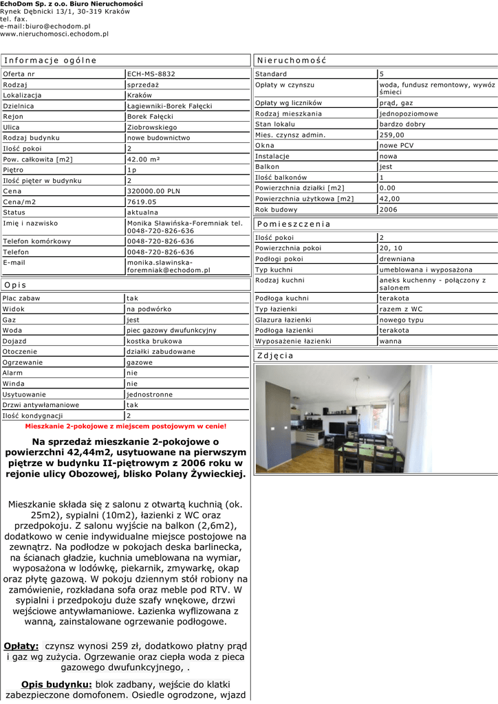 EchoDom Sp. z o.o. Biuro Nieruchomości Rynek Dębnicki 13/1, 30-319 Kraków tel. fax. e-mail:[email protected] www.nieruchomosci.echodom.pl Informacje ogólne Nieruchomość Oferta nr ECH-MS-8832 Standard 5 Rodzaj sprzedaż Opłaty w czynszu Lokalizacja Kraków woda, fundusz remontowy, wywóz śmieci Dzielnica Łagiewniki-Borek Fałęcki Opłaty wg liczników prąd, gaz Borek Fałęcki Rodzaj mieszkania jednopoziomowe Ulica Ziobrowskiego Stan lokalu bardzo dobry Rodzaj budynku nowe budownictwo Mies. czynsz admin. 259,00 2 Okna nowe PCV 42.00 m² Instalacje nowa 1p Balkon jest 2 Ilość balkonów 1 Cena 320000.00 PLN Powierzchnia działki [m2] 0.00 Cena/m2 7619.05 Powierzchnia użytkowa [m2] 42,00 Status aktualna Rok budowy 2006 Imię i nazwisko Monika Sławińska-Foremniak tel. 0048-720-826-636 Pomieszczenia Telefon komórkowy 0048-720-826-636 Rejon Ilość pokoi Pow. całkowita [m2] Piętro Ilość pięter w budynku Telefon 0048-720-826-636 E-mail [email protected] Opis Ilość pokoi 2 Powierzchnia pokoi 20, 10 Podłogi pokoi drewniana Typ kuchni umeblowana i wyposażona Rodzaj kuchni aneks kuchenny - połączony z salonem Plac zabaw tak Podłoga kuchni terakota Widok na podwórko Typ łazienki razem z WC Gaz jest Glazura łazienki nowego typu Woda piec gazowy dwufunkcyjny Podłoga łazienki terakota Dojazd kostka brukowa Wyposażenie łazienki wanna Otoczenie działki zabudowane Ogrzewanie gazowe Alarm nie Winda nie Usytuowanie jednostronne Drzwi antywłamaniowe tak Ilość kondygnacji 2 Mieszkanie 2-pokojowe z miejscem postojowym w cenie! Na sprzedaż mieszkanie 2-pokojowe o powierzchni 42,44m2, usytuowane na pierwszym piętrze w budynku II-piętrowym z 2006 roku w rejonie ulicy Obozowej, blisko Polany Żywieckiej. Mieszkanie składa się z salonu z otwartą kuchnią (ok. 25m2), sypialni (10m2), łazienki z WC oraz przedpokoju. Z salonu wyjście na balkon (2,6m2), dodatkowo w cenie indywidualne miejsce postojowe na zewnątrz. Na podłodze w pokojach deska barlinecka, na ścianach gładzie, kuchnia umeblowana na wymiar, wyposażona w lodówkę, piekarnik, zmywarkę, okap oraz płytę gazową. W pokoju dziennym stół robiony na zamówienie, rozkładana sofa oraz meble pod RTV. W sypialni i przedpokoju duże szafy wnękowe, drzwi wejściowe antywłamaniowe. Łazienka wyflizowana z wanną, zainstalowane ogrzewanie podłogowe. Opłaty: czynsz wynosi 259 zł, dodatkowo płatny prąd i gaz wg zużycia. Ogrzewanie oraz ciepła woda z pieca gazowego dwufunkcyjnego, . Opis budynku: blok zadbany, wejście do klatki zabezpieczone domofonem. Osiedle ogrodzone, wjazd Zdjęcia przez bramę na pilota, miejsca postojowe ogólnodostępne. Opis lokalizacji: cicha i spokojna okolica, wokół dużo zieleni, otoczenie zabudowy jedno i wielorodzinnej, z niezbędną infrastrukturą handlową, usługową i komunikacyjną, w pobliżu znajduje się sklep Groszek, fryzjer, szkoła podstawowa, przedszkole. Nieco dalej jest Lidl, Point, Biedronka, kino i centrum handlowe Zakopianka. Polecam! Więcej ofert na EchoDom.pl! BIURO NIERUCHOMOŚCI EchoDom Sp. z o.o.- szeroki wybór ofert. Kompleksowa obsługa przy sprzedaży, wynajmie nieruchomości. Atrakcyjne propozycje kredytowe, sporządzane wedle potrzeb Klientów. ZAPEWNIAMY PROFESJONALIZM I BEZPIECZEŃSTWO ZAWIERANYCH TRANSAKCJI! © Wszelkie prawa zastrzeżone - EchoDom