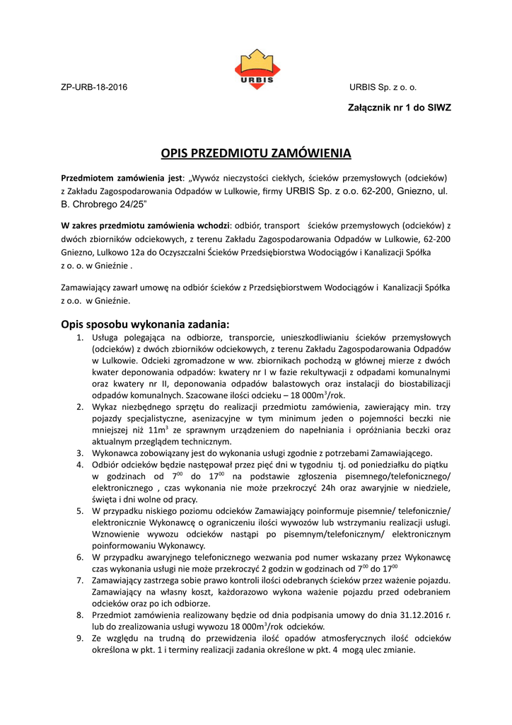 ZP-URB-18-2016 URBIS Sp. z o. o. Załącznik nr 1 do SIWZ OPIS PRZEDMIOTU ZAMÓWIENIA Przedmiotem zamówienia jest: „Wywóz nieczystości ciekłych, ścieków przemysłowych (odcieków) z Zakładu Zagospodarowania Odpadów w Lulkowie, firmy URBIS Sp. z o.o. 62-200, Gniezno, ul. B. Chrobrego 24/25” W zakres przedmiotu zamówienia wchodzi: odbiór, transport ścieków przemysłowych (odcieków) z dwóch zbiorników odciekowych, z terenu Zakładu Zagospodarowania Odpadów w Lulkowie, 62-200 Gniezno, Lulkowo 12a do Oczyszczalni Ścieków Przedsiębiorstwa Wodociągów i Kanalizacji Spółka z o. o. w Gnieźnie . Zamawiający zawarł umowę na odbiór ścieków z Przedsiębiorstwem Wodociągów i Kanalizacji Spółka z o.o. w Gnieźnie. Opis sposobu wykonania zadania: 1. Usługa polegająca na odbiorze, transporcie, unieszkodliwianiu ścieków przemysłowych (odcieków) z dwóch zbiorników odciekowych, z terenu Zakładu Zagospodarowania Odpadów w Lulkowie. Odcieki zgromadzone w ww. zbiornikach pochodzą w głównej mierze z dwóch kwater deponowania odpadów: kwatery nr I w fazie rekultywacji z odpadami komunalnymi oraz kwatery nr II, deponowania odpadów balastowych oraz instalacji do biostabilizacji odpadów komunalnych. Szacowane ilości odcieku – 18 000m3/rok. 2. Wykaz niezbędnego sprzętu do realizacji przedmiotu zamówienia, zawierający min. trzy pojazdy specjalistyczne, asenizacyjne w tym minimum jeden o pojemności beczki nie mniejszej niż 11m3 ze sprawnym urządzeniem do napełniania i opróżniania beczki oraz aktualnym przeglądem technicznym. 3. Wykonawca zobowiązany jest do wykonania usługi zgodnie z potrzebami Zamawiającego. 4. Odbiór odcieków będzie następował przez pięć dni w tygodniu tj. od poniedziałku do piątku w godzinach od 700 do 1700 na podstawie zgłoszenia pisemnego/telefonicznego/ elektronicznego , czas wykonania nie może przekroczyć 24h oraz awaryjnie w niedziele, święta i dni wolne od pracy. 5. W przypadku niskiego poziomu odcieków Zamawiający poinformuje pisemnie/ telefonicznie/ elektronicznie Wykonawcę o ograniczeniu ilości wywozów lub wstrzymaniu realizacji usługi. Wznowienie wywozu odcieków nastąpi po pisemnym/telefonicznym/ elektronicznym poinformowaniu Wykonawcy. 6. W przypadku awaryjnego telefonicznego wezwania pod numer wskazany przez Wykonawcę czas wykonania usługi nie może przekroczyć 2 godzin w godzinach od 7 00 do 1700 7. Zamawiający zastrzega sobie prawo kontroli ilości odebranych ścieków przez ważenie pojazdu. Zamawiający na własny koszt, każdorazowo wykona ważenie pojazdu przed odebraniem odcieków oraz po ich odbiorze. 8. Przedmiot zamówienia realizowany będzie od dnia podpisania umowy do dnia 31.12.2016 r. lub do zrealizowania usługi wywozu 18 000m3/rok odcieków. 9. Ze względu na trudną do przewidzenia ilość opadów atmosferycznych ilość odcieków określona w pkt. 1 i terminy realizacji zadania określone w pkt. 4 mogą ulec zmianie. 10. Zamawiający zastrzega sobie prawo do niezrealizowania umowy w całości. 11. Wykonawca zobowiązany jest po upływie miesiąca, w ciągu 7 dni dostarczyć z Oczyszczalni Ścieków PWiK Gniezno potwierdzenie ilości dowiezionych odcieków. 12. W przypadku rozbieżności powyżej 5% w ilości pomiędzy masą netto ważenia pojazdu, a masą ścieków dostarczonych do Oczyszczalni Ścieków Wykonawca na fakturze wykaże niższą ilość odcieków. 13.W przypadku rozbieżności do 5%, Wykonawca obciąży Zamawiającego za ilość odcieków wykazaną zgodnie z miesięcznym zestawieniem odbioru nieczystości ciekłych z Oczyszczalni Ścieków – załącznik nr 9 do SIWZ. 13. Ilości w Mg będą przeliczone na ilość w m3 w stosunku 1:1. 14. Podstawą do przyjęcia przez Zamawiającego faktury jest dołączenie następujących dokumentów: a) pisemne potwierdzenia ilości odebranych odcieków z Oczyszczalni zgodnie z pkt. 12, b) miesięczne zestawienie wywozu nieczystości ciekłych - załącznik nr 9 do SIWZ. wystawiony przez Wykonawcę i potwierdzony przez przedstawiciela Oczyszczalni Ścieków i Zamawiającego, c) dokumenty ważenia pojazdu zgodnie z pkt. 6,