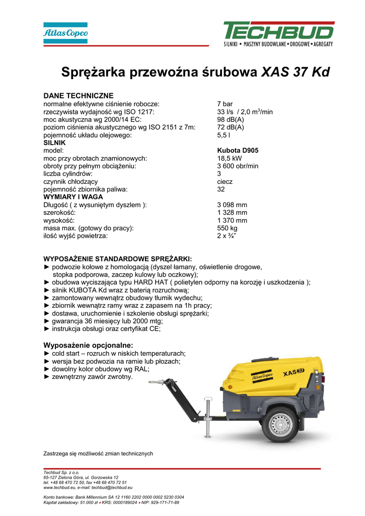 Sprężarka przewoźna śrubowa XAS 37 Kd DANE TECHNICZNE normalne efektywne ciśnienie robocze: rzeczywista wydajność wg ISO 1217: moc akustyczna wg 2000/14 EC: poziom ciśnienia akustycznego wg ISO 2151 z 7m: pojemność układu olejowego: SILNIK model: moc przy obrotach znamionowych: obroty przy pełnym obciążeniu: liczba cylindrów: czynnik chłodzący pojemność zbiornika paliwa: WYMIARY I WAGA Długość ( z wysuniętym dyszlem ): szerokość: wysokość: masa max. (gotowy do pracy): ilość wyjść powietrza: 7 bar 33 l/s / 2,0 m3/min 98 dB(A) 72 dB(A) 5,5 l Kubota D905 18,5 kW 3 600 obr/min 3 ciecz 32 3 098 mm 1 328 mm 1 370 mm 550 kg 2 x ¾” WYPOSAŻENIE STANDARDOWE SPRĘŻARKI: ► podwozie kołowe z homologacją (dyszel łamany, oświetlenie drogowe, stopka podporowa, zaczep kulowy lub oczkowy); ► obudowa wyciszająca typu HARD HAT ( polietylen odporny na korozję i uszkodzenia ); ► silnik KUBOTA Kd wraz z baterią rozruchową; ► zamontowany wewnątrz obudowy tłumik wydechu; ► zbiornik wewnątrz ramy wraz z zapasem na 1h pracy; ► dostawa, uruchomienie i szkolenie obsługi sprężarki; ► gwarancja 36 miesięcy lub 2000 mtg; ► instrukcja obsługi oraz certyfikat CE; Wyposażenie opcjonalne: ► cold start – rozruch w niskich temperaturach; ► wersja bez podwozia na ramie lub płozach; ► dowolny kolor obudowy wg RAL; ► zewnętrzny zawór zwrotny. Zastrzega się możliwość zmian technicznych Techbud Sp. z o.o. 65-127 Zielona Góra, ul. Gorzowska 12 tel. +48 68 470 72 50, fax +48 68 470 72 51 www.techbud.eu, e-mail: [email protected] Konto bankowe: Bank Millennium SA 12 1160 2202 0000 0002 5230 0304 Kapitał zakładowy: 51.000 zł KRS: 0000189024 NIP: 929-171-71-89