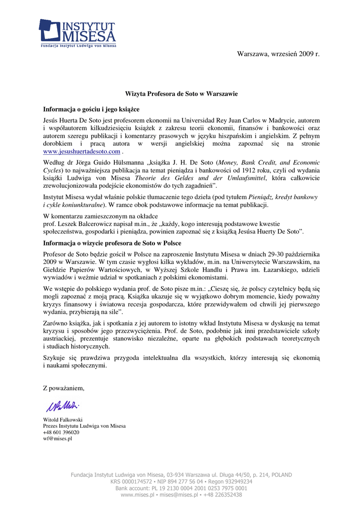 Warszawa, wrzesień 2009 r. Wizyta Profesora de Soto w Warszawie Informacja o gościu i jego książce Jesús Huerta De Soto jest profesorem ekonomii na Universidad Rey Juan Carlos w Madrycie, autorem i współautorem kilkudziesięciu książek z zakresu teorii ekonomii, finansów i bankowości oraz autorem szeregu publikacji i komentarzy prasowych w języku hiszpańskim i angielskim. Z pełnym dorobkiem i pracą autora w wersji angielskiej można zapoznać się na stronie www.jesushuertadesoto.com . Według dr Jörga Guido Hülsmanna „książka J. H. De Soto (Money, Bank Credit, and Economic Cycles) to najważniejsza publikacja na temat pieniądza i bankowości od 1912 roku, czyli od wydania książki Ludwiga von Misesa Theorie des Geldes und der Umlaufsmittel, która całkowicie zrewolucjonizowała podejście ekonomistów do tych zagadnień”. Instytut Misesa wydał właśnie polskie tłumaczenie tego dzieła (pod tytułem Pieniądz, kredyt bankowy i cykle koniunkturalne). W ramce obok podstawowe informacje na temat publikacji. W komentarzu zamieszczonym na okładce prof. Leszek Balcerowicz napisał m.in., że „każdy, kogo interesują podstawowe kwestie społeczeństwa, gospodarki i pieniądza, powinien zapoznać się z książką Jesúsa Huerty De Soto”. Informacja o wizycie profesora de Soto w Polsce Profesor de Soto będzie gościł w Polsce na zaproszenie Instytutu Misesa w dniach 29-30 października 2009 w Warszawie. W tym czasie wygłosi kilka wykładów, m.in. na Uniwersytecie Warszawskim, na Giełdzie Papierów Wartościowych, w Wyższej Szkole Handlu i Prawa im. Łazarskiego, udzieli wywiadów i weźmie udział w spotkaniach z polskimi ekonomistami. We wstępie do polskiego wydania prof. de Soto pisze m.in.: „Cieszę się, że polscy czytelnicy będą się mogli zapoznać z moją pracą. Książka ukazuje się w wyjątkowo dobrym momencie, kiedy poważny kryzys finansowy i światowa recesja gospodarcza, które przewidywałem od chwili jej pierwszego wydania, przybierają na sile”. Zarówno książka, jak i spotkania z jej autorem to istotny wkład Instytutu Misesa w dyskusję na temat kryzysu i sposobów jego przezwyciężenia. Prof. de Soto, podobnie jak inni przedstawiciele szkoły austriackiej, prezentuje stanowisko niezależne, oparte na głębokich podstawach teoretycznych i studiach historycznych. Szykuje się prawdziwa przygoda intelektualna dla wszystkich, którzy interesują się ekonomią i naukami społecznymi. Z poważaniem, Witold Falkowski Prezes Instytutu Ludwiga von Misesa +48 601 396020 [email protected] Fundacja Instytut Ludwiga von Misesa, 03-934 Warszawa ul. Długa 44/50, p. 214, POLAND KRS 0000174572 ▪ NIP 894 277 56 04 ▪ Regon 932949234 Bank account: PL 19 2130 0004 2001 0253 7975 0001 www.mises.pl ▪ [email protected] ▪ +48 226352438 Program wizyty profesora J. H. de Soto w Warszawie 29–30 października 2009 Czwartek 29.10.2009 10.00–11.30 Szkoła Główna Gospodarstwa Wiejskiego, Nowoursynowska 166 b. VI s. D-22 The Controversy over the Financial Crisis and the Theory of Crises (Kontrowersje wokół kryzysu finansowego i teorii kryzysów) 13.00–14.30 Giełda Papierów Wartościowych, Książęca 4 The Theory of Dynamic Efficiency (Teoria efektywności dynamicznej) 16.30–18.00 Warszawski Dom Ekonomisty (PTE), Nowy Świat 49 Money, Bank Credit, and Economic Cycles (Pieniądz, kredyt bankowy i cykle koniunkturalne) 18.30–20.00 Uniwersytet Warszawski, kampus główny (stary BUW), Krakowskie Przedmieście 26/28 The Essence of the Austrian School (Istota teorii austriackiej szkoły ekonomii) 20.15–22.15 Jazzownia Liberalna, Rynek Starego Miasta (róg Jezuickiej), Hospitality – by invitation only (Spotkanie dla zaproszonych gości) Piątek 30.10.2009 15.00–16.30 Wyższa Szkoła Handlu i Prawa im. R. Łazarskiego, Świeradowska 43 The Current Economic Crisis (Kryzys gospodarczy) Harmonogram wizyty może ulec zmianie. Szczegółowe informacje: Marcin Kamiński, koordynator wizyty, tel. 517 151 142, mail: [email protected] Fundacja Instytut Ludwiga von Misesa, 03-934 Warszawa ul. Długa 44/50, p. 214, POLAND KRS 0000174572 ▪ NIP 894 277 56 04 ▪ Regon 932949234 Bank account: PL 19 2130 0004 2001 0253 7975 0001 www.mises.pl ▪ [email protected] ▪ +48 226352438 Money, Bank Credit, and Economic Cycles Pieniądz, kredyt koniunkturalne bankowy i cykle POLSKIE WYDANIE KSIĄŻKI Jesus Huerta de Soto, Money, Bank Credit, and Economic Cycles Oryginał dostępny na: http://mises.org/books/desoto.pdf Każdy, kogo interesują podstawowe kwestie społeczeństwa, gospodarki i pieniądza, powinien zapoznać się z książką Jesúsa Huerty De Soto – prof. Leszek Balcerowicz Tłumaczenie z angielskiego: Grzegorz Łuczkiewicz Redakcja naukowa: prof. Witold Kwaśnicki, dr Rafał Wojciechowski, dr Mateusz Machaj 680 stron, indeksy, oprawa twarda Rok wydania: 2009. Publikacja dotowana przez Narodowy Bank Polski Wydawca: Instytut Ludwiga von Misesa, Warszawa Fundacja Instytut Ludwiga von Misesa, 03-934 Warszawa ul. Długa 44/50, p. 214, POLAND KRS 0000174572 ▪ NIP 894 277 56 04 ▪ Regon 932949234 Bank account: PL 19 2130 0004 2001 0253 7975 0001 www.mises.pl ▪ [email protected] ▪ +48 226352438