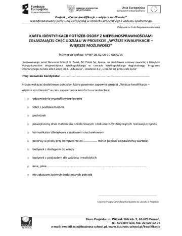 Projekt „Wyższe kwalifikacje – większe możliwości” współfinansowany przez Unię Europejską w ramach Europejskiego Funduszu Społecznego Załącznik nr 8 do Regulaminu rekrutacji KARTA IDENTYFIKACJI POTRZEB OSOBY Z NIEPEŁNOSPRAWNOŚCIAMI ZGŁASZAJĄCEJ CHĘĆ UDZIAŁU W PROJEKCIE „WYŻSZE KWALIFIKACJE – WIĘKSZE MOŻLIWOŚCI” Numer projektu: RPWP.08.02.00-30-0050/15 realizowanego przez Business School H. Polak, M. Polak Sp. Jawna, na podstawie umowy zawartej z Urzędem Marszałkowskim Województwa Wielkopolskiego w ramach Wielkopolskiego Regionalnego Programu Operacyjnego na lata 2014-2020 Oś 8. „Edukacja”, Działanie 8.2 „Uczenie się przez całe życie” Imię i nazwisko Kandydata: ....................................................................... ……………………………... Proszę wskazać dodatkowe potrzeby, które powinien zapewnić projekt „Wyższe kwalifikacje – większe możliwości” w celu zapewnienia komfortu uczestnictwa: o odpowiednio wyprofilowane krzesło o fotel z podłokietnikami o podnóżek o powiększony druk materiałów szkoleniowych i dokumentów dotyczących realizacji projektu o komunikator dźwiękowy z zestawem słuchawkowym o przerwy w pracy przy komputerze co ……………… minut (wpisać odpowiednią wartość) o budynek z dostępem do windy o budynek z podjazdem dla wózków inwalidzkich o inne, jakie………………………………………………………………………………………………………………… o nie zgłaszam żadnych dodatkowych potrzeb ….....…………..…..…………………………………………………………………. Czytelny Podpis Kandydata/Kandydatki do udziału w Projekcie Biuro Projektu: ul. Wilczak 16A lok. 9, 61-623 Poznań, tel. 570-897-633, fax. 22 620-62-76 e-mail: [email protected], www.business-school.pl/kwalifikacje