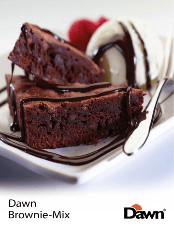 Dawn Brownie-Mix Dawn Brownie-Mix Klasyczny produkt w amerykańskim stylu prawdziwe Brownie. Dawn Foods używa wysokiej jakości składników aby to dostarczyć łatwy w użyciu produkt do przygotowania pysznego ciasta Brownie. Receptura podstawowa (na 1 blachę 60x20cm) 1500 g Dawn Brownie-Mix 279003 400 g Woda 1900 g Suma Mieszać płaskim mieszadłem przez 1 minutę na wolnych obrotach, 2-4 minuty na średnich obrotach. Można dodać 150 g orzechów i / lub Chocolate Chunks białe 279004 lub Chocolate Chunks ciemne 279005. Temperatura pieczenia:180 °C Czas pieczenia: 30-35 minut Czekoladowa polewa (na 1 blachę 60x20cm) 300 g Odporny na zapiekanie krem czekoladowy 100 g Czekolada lub polewa tłuszczowa Roztopić czekoladę, wymieszać z kremem czekoladowym i rozprowadzić na schłodzonym brownie. Wskazówka: Utrzymując czas pieczenia 30 minut Brownie nabierze typowy amerykański charakter. Zalecany rozmiar cięcia kawałków: 6,5 cm x 6,5 cm (27 szt.) Zalety mieszanki: • 100% mieszanki, tylko dodać wodę • Łatwy w użyciu • Autentyczna Amerykańska formuła • Wysoka zawartość kakao • Brak barwników i konserwantów • Odporny na zamrażanie i odmrażanie Dawn Brownie-Mix 279003, worek 12,5kg Chocolate Chunks Białe 279004, wiadro 3,75 kg Chocolate Chunks Ciemne 279005, wiadro 3,75 kg Dawn Foods Poland Sp. z o.o. Przepiórcza 6; 62-081 Przeźmierowo, t +48 61 814 22 63 f +48 61 814 22 63, [email protected], www.dawnfoods.pl