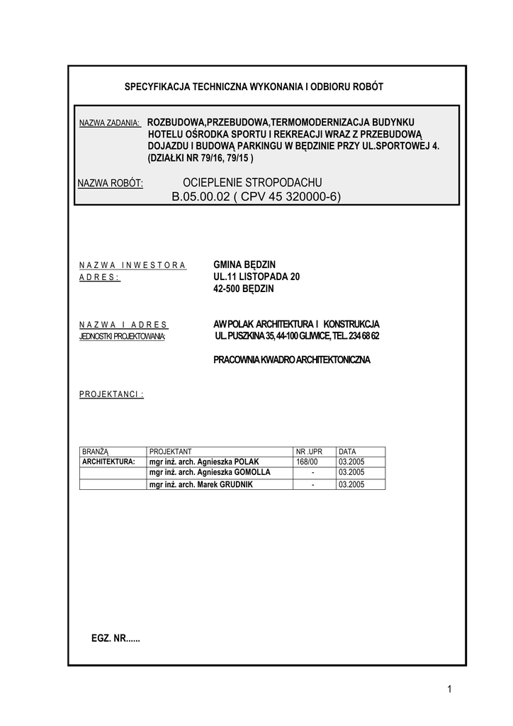 SPECYFIKACJA TECHNICZNA WYKONANIA I ODBIORU ROBÓT NAZWA ZADANIA: ROZBUDOWA,PRZEBUDOWA,TERMOMODERNIZACJA BUDYNKU HOTELU OŚRODKA SPORTU I REKREACJI WRAZ Z PRZEBUDOWĄ DOJAZDU I BUDOWĄ PARKINGU W BĘDZINIE PRZY UL.SPORTOWEJ 4. (DZIAŁKI NR 79/16, 79/15 ) OCIEPLENIE STROPODACHU B.05.00.02 ( CPV 45 320000-6) NAZWA ROBÓT: NAZWA INWESTORA ADRES: GMINA BĘDZIN UL.11 LISTOPADA 20 42-500 BĘDZIN NAZWA I ADRES JEDNOSTKI PROJEKTOWANIA: AW POLAK ARCHITEKTURA I KONSTRUKCJA UL. PUSZKINA 35, 44-100 GLIWICE, TEL. 234 68 62 PRACOWNIA KWADRO ARCHITEKTONICZNA P RO J EK T A N CI : BRANśĄ ARCHITEKTURA: PROJEKTANT NR .UPR DATA mgr inŜ. arch. Agnieszka POLAK mgr inŜ. arch. Agnieszka GOMOLLA mgr inŜ. arch. Marek GRUDNIK 168/00 - 03.2005 03.2005 03.2005 EGZ. NR...... 1 SPIS TREŚCI 1. WSTĘP 3 2. MATERIAŁY 3 3. SPRZĘT 5 4. TRANSPORT 6 5. WYKONANIE ROBÓT 6 6. KONTROLA JAKOŚCI ROBÓT 7 7. OBMIAR ROBÓT 7 8. ODBIÓR ROBÓT 7 9. PODSTAWA PŁATNOŚCI 8 10. PRZEPISY ZWIĄZANE 8 2 1. WSTĘP Przedmiot ST Przedmiotem niniejszej standardowej specyfikacji technicznej (ST) (standardowej) są wymagania dotyczące wykonania i odbioru izolacji termicznej stropodachów. Zakres stosowania ST Specyfikacja techniczna (ST) moŜe być podstawą opracowania szczegółowej specyfikacji technicznej (SST), która będzie stosowana jako dokument przetargowy i kontraktowy przy zlecaniu i realizacji robót wymienionych w pkt. 1.1. Odstępstwa od wymagań podanych w niniejszej specyfikacji mogą mieć miejsce tylko w przypadkach małych prostych robót i konstrukcji drugorzędnych o niewielkim znaczeniu, dla których istnieje pewność, Ŝe podstawowe wymagania będą spełnione przy zastosowaniu metod wykonania na podstawie doświadczenia i przy przestrzeganiu zasad sztuki budowlanej. Zakres robót objętych ST Roboty, których dotyczy specyfikacja, obejmują wszystkie czynności umoŜliwiające i mające na celu wykonanie izolacji termicznej stropodachu wentylowanego i stropodachu niewentylowanego. Określenia podstawowe Określenia podane w niniejszej ST są zgodne z obowiązującymi odpowiednimi normami oraz określeniami podanymi w ST B.00.00.00 „Wymagania ogólne” pkt 2.1.7. Ogólne wymagania dotyczące robót Wykonawca robót jest odpowiedzialny za jakość ich wykonania oraz za zgodność z dokumentacją projektową, ST i poleceniami Inspektora nadzoru. Ogólne wymagania dotyczące robót podano w ST B.00.00.00 „Wymagania ogólne” pkt 2.2. 2. MATERIAŁY Ogólne wymagania dotyczące materiałów, ich pozyskiwania i składowania podano w ST B.00.00.00„Wymagania ogólne” pkt 2.3. Ponadto materiały stosowane do wykonywania pokryć dachowych powinny mieć: – Aprobaty Techniczne lub być produkowane zgodnie z obowiązującymi normami, – Certyfikat lub Deklarację Zgodności z Aprobatą Techniczną lub z PN, – Certyfikat na znak bezpieczeństwa, – Certyfikat zgodności ze zharmonizowaną normą europejską wprowadzoną do zbioru norm polskich, – na opakowaniach powinien znajdować się termin przydatności do stosowania. Sposób transportu i składowania powinien być zgodny z warunkami i wymaganiami podanymi przez producenta. Wykonawca obowiązany jest posiadać na budowie pełną dokumentację dotyczącą składowanych na budowie materiałów przeznaczonych do wykonania pokryć dachowych. Rodzaje materiałów Wszelkie materiały do wykonania izolacji termicznych stropodachów powinny odpowiadać wymaganiom zawartym w normach polskich (PN-B-23116:1997 „wyroby do izolacji cieplnej w budownictwie. Filce, maty i płyty z wełny mineralnej” lub aprobatach technicznych ITB dopuszczających dany materiał do powszechnego stosowania w budownictwie. Mata z wełny mineralnej: Maty z wełny mineralnej grubości 20cm lub 2x10cm do ocieplenia stropodachu wentylowanego powinny odpowiadać parametrom: 3 współczynnik przewodzenia ciepła λobl. -0,041 [W/mK] obciąŜenie charakterystyczne cięŜarem własnym -0,20 kN/m3 klasyfikacja ogniowa - wyrób niepalny odchyłki wymiarowe: długość: +2 / -1% szerokość: ± 1,5% grubość: -5 mm Maty pakowane są w zafoliowane rolki z naniesioną nazwą i parametrami produktu. Rolki maty składuje się w zabezpieczonych, koniecznie zadaszonych miejscach oraz przy uwzględnieniu dodatkowych wymagań producenta. Jedynie w przypadku wykorzystania specjalnych opakowań do składowania bez zadaszenia zawierających 20 rolek, moŜna składować maty w miejscach otwartych. Twarde płyty z wełny mineralnej: SłuŜą do izolacji termicznej stropodachów pod bezpośrednie powłokowe pokrycia dachowe (w układzie izolacji jednowarstwowym lub dwuwarstwowym jako płyta wierzchnia), Płyty z wełny mineralnej grubości 150mm powinny odpowiadać następującym parametrom: współczynnik przewodzenia ciepła λobl -0,041 [W/mK] obciąŜenie charakterystyczne cięŜarem własnym -1,50 kN/m3 klasyfikacja ogniowa - wyrób niepalny napręŜenie ściskające przy 10% odkształceniu względnym ≥ 50 kPa wytrzymałość na rozciąganie prostopadłe do powierzchni ≥ 12 kPa stabilność wymiarów w określonych warunkach temperaturowych i wilgotnościowych ≤ 1 % krótkotrwała nasiąkliwość wodą metodą częściowego zanurzenia ≤ 1,0 kg/m2 siła ściskająca pod obciąŜeniem punktowym dającym odkształcenie 5mm dla gr. 80 - 200 mm ≤ 450 N napręŜenie ściskające pod obciąŜeniem pkt. dającym odkształcenie 5 mm dla gr. 80 - 200 mm ≥ 90 kPa odchyłki wymiarowe: długość: ± 3mm szerokość: ± 3mm grubość: ± 2mm prostokątność: < 5 mm/m płaskość: < 6 mm Płyty z twardej wełny mineralnej pakowane są w ofoliowane paczki zaopatrzone w nazwę i parametry produktu. Paczki naleŜy przechowywać w zabezpieczonych, zadaszonych miejscach. Folia paroizolacyjna. Folia stabilizowana o grubości 0.3mm, stosowana jako izolacja paroszczelna w konstrukcjach stropów i stropodachów. Folia powinna odpowiadać następującym parametrom: opór dyfuzyjny (dla gr. 0,2 mm) -0,035 [W/mK]