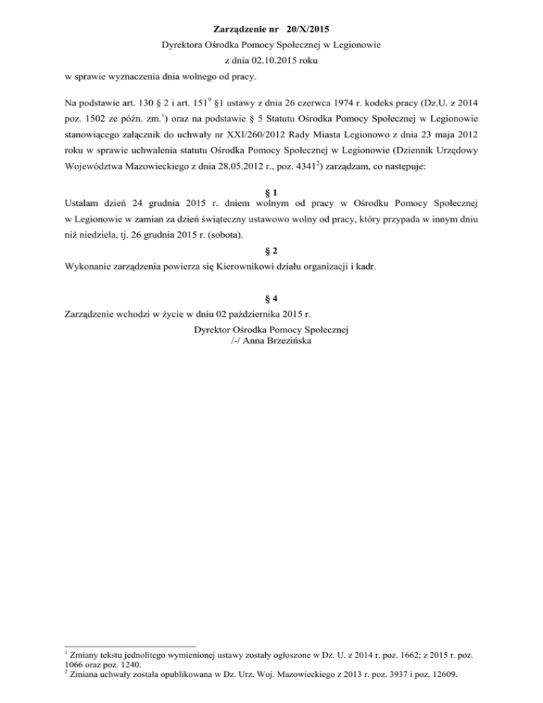Zarządzenie nr 20/X/2015 Dyrektora Ośrodka Pomocy Społecznej w Legionowie z dnia 02.10.2015 roku w sprawie wyznaczenia dnia wolnego od pracy. Na podstawie art. 130 § 2 i art. 1519 §1 ustawy z dnia 26 czerwca 1974 r. kodeks pracy (Dz.U. z 2014 poz. 1502 ze późn. zm.1) oraz na podstawie § 5 Statutu Ośrodka Pomocy Społecznej w Legionowie stanowiącego załącznik do uchwały nr XXI/260/2012 Rady Miasta Legionowo z dnia 23 maja 2012 roku w sprawie uchwalenia statutu Ośrodka Pomocy Społecznej w Legionowie (Dziennik Urzędowy Województwa Mazowieckiego z dnia 28.05.2012 r., poz. 43412) zarządzam, co następuje: §1 Ustalam dzień 24 grudnia 2015 r. dniem wolnym od pracy w Ośrodku Pomocy Społecznej w Legionowie w zamian za dzień świąteczny ustawowo wolny od pracy, który przypada w innym dniu niż niedziela, tj. 26 grudnia 2015 r. (sobota). §2 Wykonanie zarządzenia powierza się Kierownikowi działu organizacji i kadr. §4 Zarządzenie wchodzi w życie w dniu 02 października 2015 r. Dyrektor Ośrodka Pomocy Społecznej /-/ Anna Brzezińska 1 Zmiany tekstu jednolitego wymienionej ustawy zostały ogłoszone w Dz. U. z 2014 r. poz. 1662; z 2015 r. poz. 1066 oraz poz. 1240. 2 Zmiana uchwały została opublikowana w Dz. Urz. Woj. Mazowieckiego z 2013 r. poz. 3937 i poz. 12609.