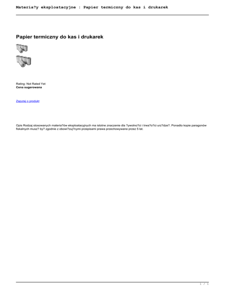 Materia?y eksploatacyjne : Papier termiczny do kas i drukarek Papier termiczny do kas i drukarek Rating: Not Rated Yet Cena sugerowana Zapytaj o produkt Opis Rodzaj stosowanych materia?ów eksploatacyjnych ma istotne znaczenie dla ?ywotno?ci i trwa?o?ci urz?dze?. Ponadto kopie paragonów fiskalnych musz? by? zgodnie z obowi?zuj?cymi przepisami prawa przechowywane przez 5 lat. 1 / 1 Powered by TCPDF (www.tcpdf.org)