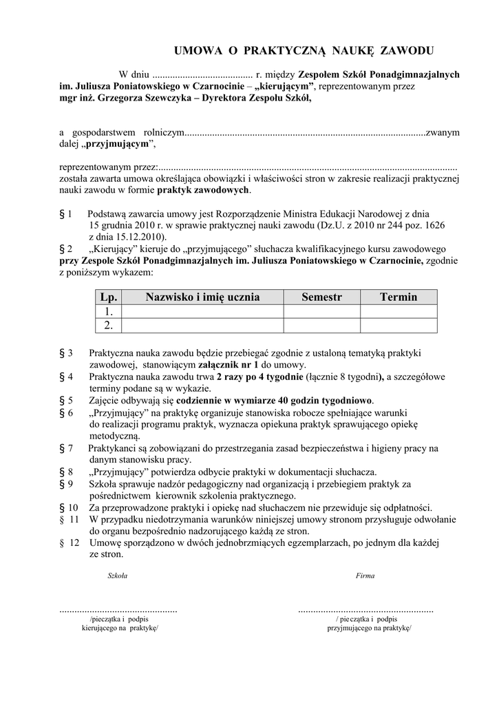 UMOWA O PRAKTYCZNĄ NAUKĘ ZAWODU W dniu ........................................ r. między Zespołem Szkół Ponadgimnazjalnych im. Juliusza Poniatowskiego w Czarnocinie – „kierującym”, reprezentowanym przez mgr inż. Grzegorza Szewczyka – Dyrektora Zespołu Szkół, a gospodarstwem rolniczym................................................................................................zwanym dalej „przyjmującym”, reprezentowanym przez:....................................................................................................................... została zawarta umowa określająca obowiązki i właściwości stron w zakresie realizacji praktycznej nauki zawodu w formie praktyk zawodowych. §1 Podstawą zawarcia umowy jest Rozporządzenie Ministra Edukacji Narodowej z dnia 15 grudnia 2010 r. w sprawie praktycznej nauki zawodu (Dz.U. z 2010 nr 244 poz. 1626 z dnia 15.12.2010). §2 „Kierujący” kieruje do „przyjmującego” słuchacza kwalifikacyjnego kursu zawodowego przy Zespole Szkół Ponadgimnazjalnych im. Juliusza Poniatowskiego w Czarnocinie, zgodnie z poniższym wykazem: Lp. 1. 2. Nazwisko i imię ucznia Semestr Termin §3 Praktyczna nauka zawodu będzie przebiegać zgodnie z ustaloną tematyką praktyki zawodowej, stanowiącym załącznik nr 1 do umowy. §4 Praktyczna nauka zawodu trwa 2 razy po 4 tygodnie (łącznie 8 tygodni), a szczegółowe terminy podane są w wykazie. §5 Zajęcie odbywają się codziennie w wymiarze 40 godzin tygodniowo. §6 „Przyjmujący” na praktykę organizuje stanowiska robocze spełniające warunki do realizacji programu praktyk, wyznacza opiekuna praktyk sprawującego opiekę metodyczną. §7 Praktykanci są zobowiązani do przestrzegania zasad bezpieczeństwa i higieny pracy na danym stanowisku pracy. §8 „Przyjmujący” potwierdza odbycie praktyki w dokumentacji słuchacza. §9 Szkoła sprawuje nadzór pedagogiczny nad organizacją i przebiegiem praktyk za pośrednictwem kierownik szkolenia praktycznego. § 10 Za przeprowadzone praktyki i opiekę nad słuchaczem nie przewiduje się odpłatności. § 11 W przypadku niedotrzymania warunków niniejszej umowy stronom przysługuje odwołanie do organu bezpośrednio nadzorującego każdą ze stron. § 12 Umowę sporządzono w dwóch jednobrzmiących egzemplarzach, po jednym dla każdej ze stron. Szkoła Firma ............................................... ...................................................... /pieczątka i podpis kierującego na praktykę/ / pie czątka i podpis przyjmującego na praktykę/ Załącznik nr 1 Program nauczania dla kształcenia w zawodzie technik rolnik (symbol cyfrowy 314207) organizowanego w formie kwalifikacyjnych kursów zawodowych obejmujących kwalifikacje: R.3 i R.16 Krajowego Ośrodka Wspierania Edukacji Zawodowej i Ustawicznej po modyfikacji – Czarnocin 2012 r. TEMATYKA PRAKTYKI ZAWODOWEJ Zawód: technik rolnik praktyka zawodowa śródroczna: symbol cyfrowy 314207 kwalifikacja 1, semestr -III - 4 tyg.(160 godz.) kwalifikacja 2, semestr - I – 4 tyg.(160 godz.) Cele ogólnego kształcenia praktycznego: W trakcie odbywania praktyki zawodowej uczeń powinien opanować umiejętności praktyczne potrzebne do prawidłowego wykonywania i organizowania prac w gospodarstwie rolniczym. Cele szczegółowe: zapoznać się z produkcją roślinną gospodarstwa, znać zasady przygotowania roli do siewu, analizować stosowanie nawozów organicznych i mineralnych w różnych sytuacjach, rozpoznawać i zwalczać podstawowe choroby, szkodniki i chwasty, rozpoznawać rośliny i ocenić skład botaniczny runi użytków zielonych, wykonywać zabiegi pielęgnacyjne na użytkach zielonych, zapoznać się z działem produkcji zwierzęcej, określać na żywych zwierzętach położenie ważniejszych kości, stawów i narządów, przygotowywać i zadawać paszę dla zwierząt gospodarskich, wykonywać zabiegi pielęgnacyjne u zwierząt gospodarskich, oceniać warunki zoohigieniczne pomieszczeń inwentarskich, wykonywać podstawowe czynności dotyczące techniki rolniczej (budowlane, stolarskie i mechaniczne), wykonywać czynności dotyczące obsługi ciągnika rolniczego, ocenić stan techniczny maszyn do uprawy roli, nawożenia, siewu, sadzenia i zbioru zielonek. Uwaga: Doboru zajęć należy dokonać w ramach możliwości gospodarstwa, mając na uwadze zrealizowanie w jak największym stopniu zakresu tematyki i celów kształcenia.