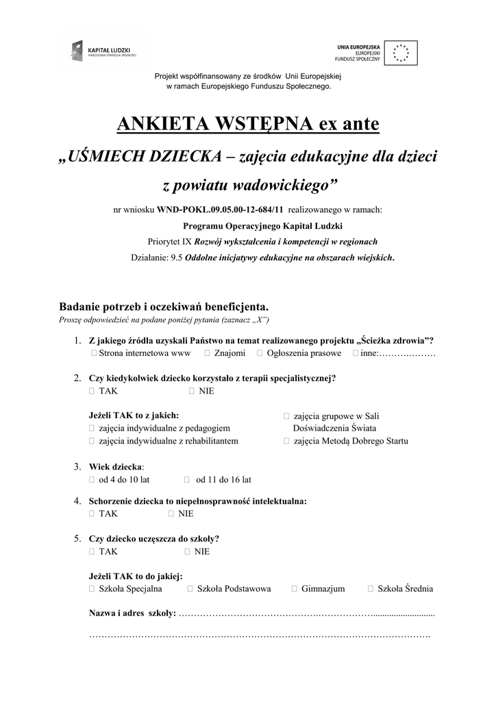 Projekt współfinansowany ze środków Unii Europejskiej w ramach Europejskiego Funduszu Społecznego. ANKIETA WSTĘPNA ex ante „UŚMIECH DZIECKA – zajęcia edukacyjne dla dzieci z powiatu wadowickiego” nr wniosku WND-POKL.09.05.00-12-684/11 realizowanego w ramach: Programu Operacyjnego Kapitał Ludzki Priorytet IX Rozwój wykształcenia i kompetencji w regionach Działanie: 9.5 Oddolne inicjatywy edukacyjne na obszarach wiejskich. Badanie potrzeb i oczekiwań beneficjenta. Proszę odpowiedzieć na podane poniżej pytania (zaznacz „X”) 1. Z jakiego źródła uzyskali Państwo na temat realizowanego projektu „Ścieżka zdrowia”? Strona internetowa www Znajomi Ogłoszenia prasowe inne:……….……… 2. Czy kiedykolwiek dziecko korzystało z terapii specjalistycznej? TAK NIE Jeżeli TAK to z jakich: zajęcia indywidualne z pedagogiem zajęcia indywidualne z rehabilitantem zajęcia grupowe w Sali Doświadczenia Świata zajęcia Metodą Dobrego Startu 3. Wiek dziecka: od 4 do 10 lat od 11 do 16 lat 4. Schorzenie dziecka to niepełnosprawność intelektualna: TAK NIE 5. Czy dziecko uczęszcza do szkoły? TAK Jeżeli TAK to do jakiej: Szkoła Specjalna NIE Szkoła Podstawowa Gimnazjum Szkoła Średnia Nazwa i adres szkoły: ……………………………………….………………........................... …………………………………………………………………………………………………. Projekt współfinansowany ze środków Unii Europejskiej w ramach Europejskiego Funduszu Społecznego. 6. Czego oczekujecie Państwo od udziału w projekcie? (istnieje możliwość zaznaczenia kilku najbardziej znaczących pozycji): Poprawa umiejętności pisania i czytania; Wzrost integracji wśród rówieśników; Nauka współpracy w grupie; Poprawa rozwoju umysłowego dziecka; Podniesienie poziomu samoakceptacji u dzieci i wzrost poczucia własnej wartości; wyrównanie braków edukacyjnych; rozwój emocjonalny, społeczny i poznawczy dziecka; podniesienie samooceny dziecka; Niczego nie oczekuję Inne (jakie?) ..…………………………………………………..…………………………… .…………………………………………………………………………….………………… Dziękujemy za wypełnienie ankiety!