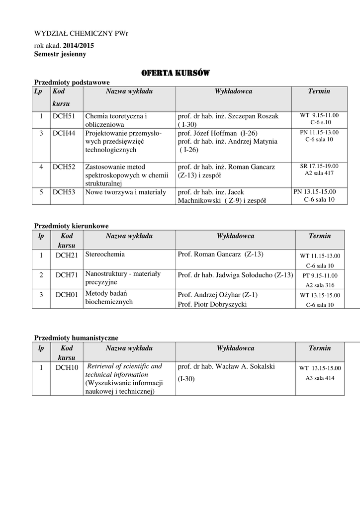 WYDZIAŁ CHEMICZNY PWr rok akad. 2014/2015 Semestr jesienny OFERTA KURSÓW Przedmioty podstawowe Lp Kod Nazwa wykładu Wykładowca Termin kursu 1 DCH51 3 DCH44 4 DCH52 5 DCH53 Chemia teoretyczna i obliczeniowa Projektowanie przemysłowych przedsięwzięć technologicznych prof. dr hab. inż. Szczepan Roszak ( I-30) prof. Józef Hoffman (I-26) prof. dr hab. inż. Andrzej Matynia ( I-26) WT 9.15-11.00 C-6 s.10 Zastosowanie metod spektroskopowych w chemii strukturalnej Nowe tworzywa i materiały prof. dr hab. inż. Roman Gancarz (Z-13) i zespół SR 17.15-19.00 A2 sala 417 Przedmioty kierunkowe lp Kod Nazwa wykładu kursu 1 DCH21 Stereochemia prof. dr hab. inz. Jacek Machnikowski ( Z-9) i zespół Wykładowca Prof. Roman Gancarz (Z-13) PN 11.15-13.00 C-6 sala 10 PN 13.15-15.00 C-6 sala 10 Termin WT 11.15-13.00 C-6 sala 10 2 3 DCH71 Nanostruktury - materiały precyzyjne Prof. dr hab. Jadwiga Sołoducho (Z-13) DCH01 Metody badań biochemicznych Prof. Andrzej Ożyhar (Z-1) Prof. Piotr Dobryszycki Przedmioty humanistyczne lp Kod Nazwa wykładu kursu 1 DCH10 Retrieval of scientific and technical information (Wyszukiwanie informacji naukowej i technicznej) PT 9.15-11.00 A2 sala 316 Wykładowca prof. dr hab. Wacław A. Sokalski (I-30) WT 13.15-15.00 C-6 sala 10 Termin WT 13.15-15.00 A3 sala 414 WYDZIAŁ CHEMICZNY PWr rok akad. 2014/2015 Semestr wiosenny OFERTA KURSÓW Przedmioty podstawowe Lp Kod Nazwa wykładu Wykładowca Termin kursu Prof. Grażyna Gryglewicz (Z-9) i zespół DCH54 Zaawansowane procesy i produkty technologii chemicznej Nanotechnologia 4 DCH28 Spektroskopia molekularna Dr hab. Józef Lipiński, prof. PWr 5 DCH69 BioChemBiot – problemy z pogranicza współczesnej biologii, chemii i biotechnologii Prof. Paweł Kafarski (Z-3) i zespół 1 DCH75 3 Prof. Marek Samoć i zespół (I-30) (I-30) Przedmioty kierunkowe lp Kod Nazwa wykładu kursu 1 DCH76 Nanofotonika 2 DCH03 Modelowanie równowag miedzyfazowych 3 DCH50 Polimery specjalne w biotechnologii Wykładowca Termin Prof. M. Samoć, Prof. A.Miniewicz Prof. Antoni Kozioł Prof. dr hab. Marek Bryjak Przedmioty humanistyczne lp Kod Nazwa wykładu Wykładowca kursu 1 DCH89 Uczelnia XXI wieku: jej Prof. Ludwik Komorowski dzieje, prawa i perspektywy Termin Seminaria lp 1 2 3 4 5 6 Kod Nazwa wykładu Prowadzący kursu DCH80 Seminarium interdyscypli- Prof. dr hab. Ludwik Komorowski (I-30) narne „Między chemią a biologią” DCH 87 Paszowe i nawozowe Prof. H.Górecki i zespół technologie nowej generacji DCH07 Seminarium sprawozdawcze Prof. Piotr Dobryszycki (Z-1) – Biotechnologia DCH40 Seminarium sprawozdawcze Prof. dr hab. Maria Cieślak-Golonka – Chemia (Z-4) Prof. dr hab. Andrzej Miniewicz (I-30) DCH08 Seminarium sprawozdawcze Prof. dr hab. inż. Antoni Kozioł (Z-11) - Inżynieria Chemiczna i Materiałowa DCH42 Seminarium sprawozdawcze Prof. dr hab. inż. Grażyna Gryglewicz (Z-9) – Technologia chemiczna Prof. dr hab. inż. Bogdan Szczygieł (I-26) Termin WYDZIAŁ CHEMICZNY rok akad. 2014/2015 Semestr jesienny OFERTA KURSÓW STUDIA DOKTORANCKIE INTERDYSCYPLINARNE Lp Kod kursu Nazwa wykładu 1 ISDK3 Nowoczesna krystalografia 2 ISDISI2 Seminarium interdyscyplinarne w zakresie materiałów funkcjonalnych właściwości fizykochemiczne i mechaniczne 15 h/sem 3 ISDK1 Materiały optyczne nowej generacji Wykładowca Termin prof. Ilona TurowskaTyrk CZ 13.15-15.00 038 C-13 prof. dr hab. Andrzej Miniewicz PN 9.15- 11.00 A2 sala 316 tygodnie nieparzyste prof.dr hab. Andrzej Miniewicz prof.dr hab.inz. Marek Samoć SR 9.15-11.00 A2 sala 417 WYDZIAŁ CHEMICZNY rok akad. 2014/2015 Semestr wiosenny Lp Kod kursu 2 ISDK2 Nazwa wykładu Materiały funkcjonalne dla technologii ochrony środowiska i magazynowania energii Wykładowca Termin prof. Jacek Machnikowski PN 13.15-15.00 F-3 sala 217 prof. Marek Bryjak. prof. Janusz Trawczyński