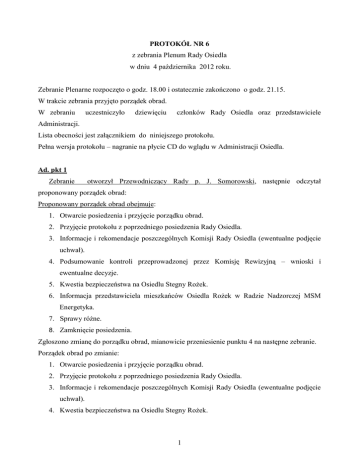 PROTOKÓŁ NR 6 z zebrania Plenum Rady Osiedla w dniu 4 października 2012 roku. Zebranie Plenarne rozpoczęto o godz. 18.00 i ostatecznie zakończono o godz. 21.15. W trakcie zebrania przyjęto porządek obrad. W zebraniu uczestniczyło dziewięciu członków Rady Osiedla oraz przedstawiciele Administracji. Lista obecności jest załącznikiem do niniejszego protokołu. Pełna wersja protokołu – nagranie na płycie CD do wglądu w Administracji Osiedla. Ad. pkt 1 Zebranie otworzył Przewodniczący Rady p. J. Somorowski, następnie odczytał proponowany porządek obrad: Proponowany porządek obrad obejmuje: 1. Otwarcie posiedzenia i przyjęcie porządku obrad. 2. Przyjęcie protokołu z poprzedniego posiedzenia Rady Osiedla. 3. Informacje i rekomendacje poszczególnych Komisji Rady Osiedla (ewentualne podjęcie uchwał). 4. Podsumowanie kontroli przeprowadzonej przez Komisję Rewizyjną – wnioski i ewentualne decyzje. 5. Kwestia bezpieczeństwa na Osiedlu Stegny Rożek. 6. Informacja przedstawiciela mieszkańców Osiedla Rożek w Radzie Nadzorczej MSM Energetyka. 7. Sprawy różne. 8. Zamknięcie posiedzenia. Zgłoszono zmianę do porządku obrad, mianowicie przeniesienie punktu 4 na następne zebranie. Porządek obrad po zmianie: 1. Otwarcie posiedzenia i przyjęcie porządku obrad. 2. Przyjęcie protokołu z poprzedniego posiedzenia Rady Osiedla. 3. Informacje i rekomendacje poszczególnych Komisji Rady Osiedla (ewentualne podjęcie uchwał). 4. Kwestia bezpieczeństwa na Osiedlu Stegny Rożek. 1 5. Informacja przedstawiciela mieszkańców Osiedla Rożek w Radzie Nadzorczej MSM Energetyka. 6. Sprawy różne. 7. Zamknięcie posiedzenia. Porządek obrad po zmianie przyjęto jednogłośnie. Ad. pkt. 2 Protokół nr 4 Rady Osiedla z dnia 9.08.2012 r. z naniesioną poprawką przyjęto 6 głosami „za” przy 2 głosach „wstrzymujących się”. Głosowało 8 członków Rady Osiedla. Przyjęcie protokołu nr 5 RO z dnia 20.09.2012 r. przeniesiono na następne zebranie. Ad. pkt. 3 Przewodniczący Komisji Technicznej p. Piotr Czepułkowski powiedział, że ostatnie spotkanie Komisji odbyło się w składzie 2 –osobowym. Omawiano budżet robót ogólnoosiedlowych na 2013 r. - problem tkwi w ustaleniu wysokości tego budżetu. Przedstawiony przez Administrację projekt planu na roboty ogólnoosiedlowe na 2013 r. nie spełnił oczekiwań Komisji. W związku z powyższym Rada Osiedla oczekuje od Administracji przedłożenia wszystkich potrzeb w zakresie robót ogólnoosiedlowych (w porządku priorytetowym) oraz szacunkowe kwoty przedsięwzięć. Zaproponował również, aby Komisja Techniczna łącznie z Komisją S-E przeanalizowały przygotowane zestawienie potrzeb, a następnie przedstawiły je na spotkaniu z Radami DomówNieruchomości celem uzyskania stanowisk poszczególnych Rad D-N. Propozycja p. P. Czepułkowskiego uzyskała całkowite poparcie obecnych na zebraniu członków Rady Osiedla. Poza tym p. Czepułkowski w nawiązaniu do rozmowy z Kierownikiem Administracji p. M. Zdanowskim ws. położenia linii światłowodowej w naszych zasobach (propozycja Orange.) uważa, że wskazane byłoby spotkanie. Do udziału w spotkaniu zaproponował: p. J. Grzebielec, p. A. Nikończyka, p. P. Czepułkowskiego, p. T. Ozimkiewicza oraz p. W. Pietrzaka. Dodatkowo, pozyskanie referencji Orange w tym temacie, bądź informacji z innych Spółdzielni, w których Orange taką infrastrukturę położyła, byłoby pomocne w rozmowach – dodał p. T. Ozimkiewicz. 2 Kierownik Administracji p. M. Zdanowski zobowiązał się do podjęcia próby uzyskania takich referencji na temat tego typu rozwiązań z firmy Orange oraz do kontaktu z osiedlami, gdzie firma ta ewentualnie realizowała już takie projekty. Przewodniczący Komisji Rewizyjnej p. M. Burdun poinformował, że Komisja jest w trakcie kontroli dokumentów związanych z wyborem kontrahentów. Po jej zakończeniu przedstawi raport i zalecenia – stąd przesunięcie punktu 4 porządku obrad na następne zebranie. Również – powiedział p. M. Burdun – w imieniu KR przygotowałem odpowiedź na pismo (25.09.2012 r.) Kierownika p. M. Zdanowskiego w sprawie podziału pożytków. Pan J. Grzebielec dodał, że Rada Osiedla w dalszym ciągu nie otrzymała opinii prawnej dokumentów podziałowych , na którą powołuje się p. Zdanowski w piśmie z dnia 25.09.2012 r. Zarząd Spółdzielni wielokrotnie był proszony o przedstawienie wiążącej opinii w tym zakresie i oprócz swojego stanowiska w tej sprawie, opinii takiej do dnia dzisiejszego nie dostarczył do rady Osiedla Stegny Rożek. Czytając wprost uchwałę podziałową nr 2 RN z dnia 6.02.2001 r. wraz z załączonym i zaakceptowanym przez oba osiedla protokołem w sprawie zasad podziału (zał. Nr 3 do przedmiotowej Uchwały RN), zdaniem Rady Osiedla pożytki nigdy nie powinny być dzielone pomiędzy Osiedlami Stegny Północ oraz Stegny Rożek, a usilnie forsowana przez Zarząd Spółdzielni interpretacja tej Uchwały, niezgodna z zapisem protokołu w sprawie podziału oraz wyrażoną w nim wolą sygnatariuszy jest niezrozumiała i nie znajduje wsparcia w istniejących dokumentach.. Zatem Rada Osiedla oczekuje od Kierownika Administracji respektowania rzeczywistego brzmienia uchwały RN w tej sprawie. interpretacji uchwały. Pan M. Zdanowski wyjaśnił, że w piśmie powołuje się na uchwałę nr 2 RN z dnia 6.02.2001 r., która jest podstawą podziału pożytków. Informuje również, że podjęta przez Radę Osiedla uchwała nr 20 z dnia 17.11.2011 r. w sprawie natychmiastowego zaprzestania przekazywania pożytków Osiedlu Stegny Północ została uznana za bezzasadną na zebraniu Rady Nadzorczej w dniu 20.12.2011 r. (w oparciu o opinię prawną). Jestem zobowiązany – powiedział p. Zdanowski - do respektowania poleceń Zarządu i działania zgodnie z uchwałami RN. Reasumując, p. J. Somorowski powiedział, że Rada Osiedla oczekuje przedstawienia konkretnej opinii prawnej takiej in