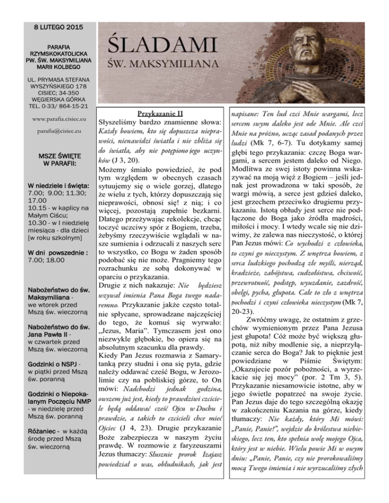 8 LUTEGO 2015 PARAFIA RZYMSKOKATOLICKA 3:ő:0$.6<0,/,$1$ MARII KOLBEGO UL. PRYMASA STEFANA :<6=<ļ6.,(*2 CISIEC; 34-350 :ė*,(56.$*Ð5.$ TEL. 0-33/ 864-15-21 www.parafia.cisiec.eu 6á\V]HOLĞP\ EDUG]R ]QDPLHQQH VáRZD [email protected] 06=(ő:,ė7( W PARAFII: (J 3, 20). 0RĪHP\ ĞPLDáR SRZLHG]LHü ĪH SRG W\P Z]JOĊGHP Z REHFQ\FK F]DVDFK :QLHG]LHOHLŒZLĘWD V\WXXMHP\ VLĊ R ZLHOH JRU]HM GODWHJR 7.00; 9.00; 11.30; ĪHZLHOX]W\FKNWyU]\GRSXV]F]DMąVLĊ 17.00 QLHSUDZRĞFL REQRVL VLĊ ] QLą L FR 10.15 - w kaplicy na ZLĊFHM SR]RVWDMą ]XSHáQLH EH]NDUQL 0Dâ\P&LŒFX 'ODWHJRSU]HĪ\ZDMąFUHNROHNFMHFKFąF 10.30 - Z,QLHG]LHOĘ PLHVLĉFD- dla dzieci WRF]\üXF]FLZ\VSyU]%RJLHPWU]HED ĪHE\ĞP\ U]HF]\ZLĞFLH ZJOąGDOL Z QD [w roku szkolnym] sze sumienia i odrzucali z naszych serc W dni powszednie : WRZV]\VWNRFR%RJXZĪDGHQVSRVyE 7.00; 18.00 SRGREDüVLĊQLHPRĪH3UDJQLHP\WHJR UR]UDFKXQNX ]H VREą GRNRQ\ZDü Z oparciu o przykazania. Drugie z nich nakazuje: 1DERŮHĽVWZRGRŒZ Maksymiliana we wtorek przed 3U]\ND]DQLH MDNĪH F]ĊVWR WRWDO 0V]ĉŒZZLHF]RUQĉ QLH VSá\FDQH VSURZDG]DQH QDMF]ĊĞFLHM GR WHJR ĪH NRPXĞ VLĊ Z\UZDáR 1DERŮHĽVWZRGRŒZ Ä-H]XV 0DULD´ 7\PF]DVHP MHVW RQR -DQD3DZâD,,QLH]Z\NOH JáĊERNLH ER RSLHUD VLĊ QD w czwartek przed 0V]ĉŒZZLHF]RUQĉ absolutnym szacunku dla prawdy. Godzinki o NSPJ ZSLĉWNLSU]HG0V]ĉ ŒZSRUDQQĉ Godzinki o NiepokaODQ\P3RF]ĘFLX103 - ZQLHG]LHOĘSU]HG 0V]ĉŒZSRUDQQĉ 5yŮDQLHF- ZNDŮGĉ ŒURGĘSU]HG0V]ĉ ŒZZLHF]RUQĉ Kiedy Pan Jezus rozmawia z SamaryWDQNąSU]\VWXGQLLRQDVLĊS\WDJG]LH QDOHĪ\RGGDZDüF]HĞü%RJXZ-HUR]R OLPLH F]\ QD SREOLVNLHM JyU]H WR 2Q PyZL (J 4, 23). Drugie przykazanie %RĪH ]DEH]SLHF]D Z QDV]\P Ī\FLX SUDZGĊ : UR]PRZLH ] IDU\]HXV]DPL -H]XVWáXPDF]\ (Mk 7, 6-7). Tu dotykamy samej JáĊELWHJRSU]\ND]DQLD F]F]Ċ%RJDZDU gami, a sercem jestem daleko od Niego. Modlitwa ze swej istoty powinna wska]\ZDüQDPRMąZLĊĨ]%RJLHP± MHĞOLMHG QDN MHVW SURZDG]RQD Z WDNL VSRVyE ĪH ZDUJL PyZLą D VHUFH MHVW JG]LHĞ GDOHNR jest grzechem przeciwko drugiemu przyND]DQLX,VWRWąREáXG\MHVWVHUFHQLHSRG áąF]RQH GR %RJD MDNR ĨUyGáD PąGURĞFL PLáRĞFLLPRF\,ZWHG\ZFDOHVLĊQLHG]L ZLP\ĪH]DOHZDQDVQLHF]\VWRĞüRNWyUHM 3DQ-H]XVPyZL (Mk 7, 20-23). =ZUyüP\XZDJĊĪHRVWDWQLP]JU]H FKyZ Z\PLHQLRQ\P SU]H] 3DQD -H]XVD MHVWJáXSRWD&yĪPRĪHE\üZLĊNV]ąJáX SRWą QLĪ QLE\ PRGOHQLH VLĊ D QLHSU]\áą F]DQLHVHUFDGR%RJD"-DNWRSLĊNQLHMHVW SRZLHG]LDQH Z 3LĞPLH ĝZLĊW\P Ä2ND]XMHFLH SR]yU SRERĪQRĞFL D Z\U]H NDFLH VLĊ MHM PRF\´ SRU 7P Przykazanie niesamowicie istotne, aby w MHJR ĞZLHWOH SRSDWU]Hü QD VZRMH Ī\FLH 3DQ-H]XVGDMHGRWHJRV]F]HJyOQąRND]MĊ Z ]DNRĔF]HQLX .D]DQLD QD JyU]H NLHG\ WáXPDF]\ S t r. 2 Ks. Kazimierz SKWIERAWSKI Str. 3 321,('=,$á(.- 9 LUTEGO 3,Ĉ7(.- 13 LUTEGO 700 - =D-y]HID0DŒODQNĘZUŒPLHUFL 700 - =D6WDQLVâDZDL)UDQFLV]NĘ7DOLN 1800 - =D)UDQFLV]ND0RW\NĘ]ŮRQĉ:LNWRULĉ 1800 =D:RMFLHFKD0RW\NĘ]ŮRQD.DWDU]\Qĉ *************************************** ***************************************** WTOREK - 10 LUTEGO 700 =D-y]HID%HGQDU]DZURF]QŒPLHUFL 1800 - =D0DUWĘL7RPDV]D%HUHNZURF]QŒPLHUFL *************************************** SOBOTA ² 14 LUTEGO 700 =D-y]HID0RW\NĘ]ŮRQĉ6WHIDQLĉ =D$QQĘ*RâXFKZUŒPLHUFL =D-DQXV]D']LHUŮDZVNLHJRZURF]QXURG]LQ ***************************************** 1800 - ő52'$- 11 LUTEGO 700 - =D.DUROD0RW\NĘ]ŮRQĉ$QQĉLWU]HPDFyUNDPL NIEDZIELA - 15 LUTEGO 1600 :LQWHQFML$SRVWROVWZD'REUHMőPLHUFL 700 - 1800 - =D0DULDQD.ĉNRODZURF]QŒPLHUFL 900 ']LĘNF]\QQDZURF]QXURG]LQ-DQLQ\]SURŒEĉR %RŮHEâRJRVâDZLHĽVWZR *************************************** CZWARTEK - 12 LUTEGO 700 =D&HF\OLĘ%HGQDU]ZUŒPLHUFL]URG]LFDPL 2V]F]ĘŒOLZĉRSHUDFMĘ =D%DUEDUĘL6WDQLVâDZD3LHF]DUND- RGFyUNL +DOLQ\]G]LHýPL 1800 =D.DUROD']LHG]LFD]ŮRQĉ+HOHQĉ 1015 - Za + Andrzeja Talika 1130 - =D.D]LPLHUĘ.XSF]DN]PĘŮHP.DUROHPLV\ nem Antonim 1700 - 2]GURZLHL%RŮHEâRJRVâDZLHĽVWZRGOD7HUHV\%HG narz z okazji 50 roczn. urodzin 2*á26=(1,$'86=3$67(56.,( ']Lœ QLHG]LHOD ]Z\NâD 3DQ -H]XV FRSHZLHQ F]DV XVXZDâ VLę QD RGOXG]LH DE\ VLę PRGOLý0\WDNůHSRWU]HEXMHP\WDNLFKFKZLOE\ZVSRNRMX]DVWDQRZLýVLęQDGUR]ZLĊ ]DQLHPSUREOHPyZFRG]LHQQRœFLLQDZLĊ]DýJâęERNĊUHODFMę]%RJLHP8G]LDâZOLWXU JLL HXFKDU\VW\F]QHM VNâDQLD QDV GR Z\FLV]HQLD L PRGOLWZ\ 8ZLHOELDMP\ REHFQHJR SR œUyGQDV-H]XVD&KU\VWXVDNWyU\G]LHOLâ]QDPLWUXG\OXG]NLHMHJ]\VWHQFML we wtorek - 10 lutego - ZVSRPQLHQLHœZ6FKRODVW\NL- dziewicy ZœURGę- 11 lutego - ZVSRPQLHQLH103]/RXUGHV-HVWWRŒZLDWRZ\']LHľ&KRUHJR ZVRERWę- 14 lutego - œZLęWRŒZLęW\FK&\U\ODL0HWRGHJR- SDWURQyZ(XURS\ : SU]\V]âĊ QLHG]LHOę SU]\SDGD RVWDWQLD QLHG]LHOD SU]HG WHJRURF]Q\P RNUHVHP :LHONLHJR 3RVWX 5R]SRF]\QDP\ QDERůHľVWZR F]WHUG]LHVWRJRG]LQQH =DSUDV]DP\ GR DGRUDFML 1DMœZLęWV]HJR 6DNUD mentu. :\UDůDP\ VHUGHF]QH SRG]LęNRZDQLH ]D WURVNę R F]\VWRœý NRœFLRâD ]D ]âRůHQLH RILDU\ ]â SDUDILDQRP VSU]ĊWDMĊF\P NRœFLyâ Z VRERWę VW\F]QLD .LQG]H6WDľFR%DUEDU]H/DOLN]D RILDUę ]â $QQLH=DZDGD.DWDU]\QLH3\WODU]=RILLáDVXWza RILDUę]â Marii Lalik 7URVNęRF]\VWRœýNRœFLRâDSRZLHU]DP\ZVRERWęOXWHJR>RJRG]@SDUDILDQRP+DOLQLH6LHGODN$QQLH3âXůHN$QWR QLQLH*RâXFK0DâJRU]DFLH*U]HJRU]HN.U\VW\QLH7DOLN%DUEDU]H0DFKDâD*DEULHOL.DEDFLN8UV]XOL:RUHN'RURFLH7DOLN0DULanowi Pietrasinie S t r. 4 3,Ĉ7(.- 20 LUTEGO 321,('=,$á(.- 16 LUTEGO 70 0 - =D0LFKDâD%HGQDU]D 70 0 - 180 0 - =D0DULĘ6DORPRQLEUDWD:âDG\VâDZD7DOLND Za + Marka Dziedzica z rodzicami =D6WDQLVâDZD1RZRELOVNLHJR =D-DQD6]F]RWNĘ 18 0 0 - =D*HQRZHIĘ.XURZVNĉ]PĘŮHP-y]HIHP *************************************** WTOREK - 17 LUTEGO 70 0 - ***************************************** SOBOTA ² 21 LUTEGO =D:âDG\VâDZDŭ\UND =D=G]LVâDZD&]RSHN =D:HURQLNĘ%ODXW =D&]HVâDZD6âRZLND 70 0 1800 - 2]GURZLHL%RŮHEâRJRVâDZLHĽVWZRGOD(Z\L-D QXV]DZUŒOXEX ************************************** 1800 - ']LĘNF]\QQDZUXURG]LQ.D]LPLHU\*U]\ZDN] SURŒEĉR%RŮHEâRJRVâDZLHĽVWZR ő52'$- 18 LUTEGO - ő52'$323,(/&2:$ ***************************************** 70 0 - =D$QQĘ']LHG]LF NIEDZIELA - 22 LUTEGO 160 0 =D=\JPXQWD5\SLH