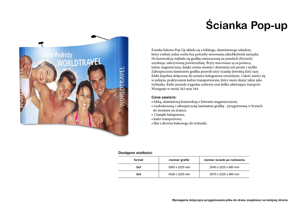 Âcianka Pop-up Ścianka łukowa Pop Up składa się z lekkiego, aluminiowego szkieletu, który rozłoży jedna osoba bez potrzeby stosowania jakichkolwiek narzędzi. Na konstrukcję nakłada się grafikę umieszczoną na panelach (brytach) uzyskując zakrzywioną powierzchnię. Bryty mocowane są za pomocą taśmy magnetycznej, dzięki czemu montaż i demontaż jest prosty i szybki. Zabezpieczona laminatem grafika pozwoli użyć ściankę dowolną ilość razy. Efekt dopełnia dołączone do zestawu halogenowe oświetlenie. Całość mieści się w jednym, praktycznym kufrze transportowym, który może służyć także jako trybunka. Kufer posiada wygodne uchwyty oraz kółka ułatwiające transport. Występuje w wersji 3x3 oraz 3x4. Cena zawiera: • lekką, aluminiową konstrukcję z listwami magnetycznymi, • wydrukowaną i zabezpieczoną laminatem grafikę - przygotowaną w brytach do montażu na ściance, • 2 lampki halogenowe, • kufer transportowy, • blat z drewna bukowego do trybunki. Dost´pne wielkoÊci format rozmiar grafiki rozmiar Êcianki po rozło˝eniu 3x3 3365 x 2225 mm 2540 x 2225 x 685 mm 3x4 4038 x 2225 mm 3070 x 2225 x 960 mm Wymagania dotyczàce przygotowania pliku do druku znajdziesz na kolejnej stronie Âcianka Pop-up 3x3 3365 mm PANEL 5 PANEL 4 PANEL 3 224 PANEL 2 2225 mm PANEL 1 224 rozmiar grafiki grafika widoczna od przodu 673 673 673 673 673 Przy projektowaniu grafiki prosimy o zwrócenie uwagi aby: Do druku przyjmujemy pliki w formacie TIFF: • na panelach bocznych nie było istotnych elementów (panele zawijane są do tyłu i elementy staną się niewidoczne od przodu) • litery nie znajdowały się na liniach łączenia paneli • w rozmiarze netto 3365 x 2225 mm bez spadów (w skali 1:1) • przygotowane w trybie CMYK, bez dołączonych profili • zapisane bez warstw, z kompresją LZW (TIFF) • rozdzielczość 150 dpi Pomoc Jeżeli masz jakiekolwiek pytania dotyczące przygotowania plików skontaktuj się z nami pisząc na adres [email protected]. Nasi specjaliści pomogą Ci rozwiać wszelkie wątpliwości. Âcianka Pop-up 3x4 4038 mm PANEL 6 PANEL 5 PANEL 4 PANEL 3 224 PANEL 2 2225 mm PANEL 1 224 rozmiar grafiki grafika widoczna od przodu 673 673 673 673 673 673 Przy projektowaniu grafiki prosimy o zwrócenie uwagi aby: Do druku przyjmujemy pliki w formacie TIFF: • na panelach bocznych nie było istotnych elementów (panele zawijane są do tyłu i elementy staną się niewidoczne od przodu) • litery nie znajdowały się na liniach łączenia paneli • w rozmiarze netto 4038 x 2225 mm bez spadów (w skali 1:1) • przygotowane w trybie CMYK, bez dołączonych profili • zapisane bez warstw, z kompresją LZW (TIFF) • rozdzielczość 150 dpi Pomoc Jeżeli masz jakiekolwiek pytania dotyczące przygotowania plików skontaktuj się z nami pisząc na adres [email protected]. Nasi specjaliści pomogą Ci rozwiać wszelkie wątpliwości.