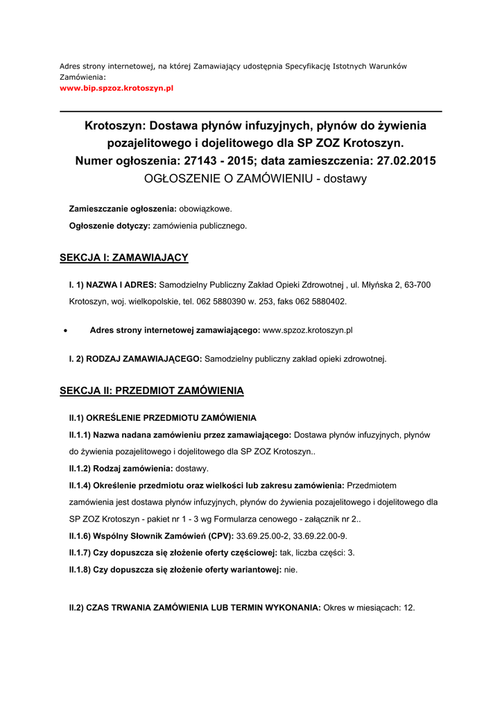 Adres strony internetowej, na której Zamawiający udostępnia Specyfikację Istotnych Warunków Zamówienia: www.bip.spzoz.krotoszyn.pl Krotoszyn: Dostawa płynów infuzyjnych, płynów do żywienia pozajelitowego i dojelitowego dla SP ZOZ Krotoszyn. Numer ogłoszenia: 27143 - 2015; data zamieszczenia: 27.02.2015 OGŁOSZENIE O ZAMÓWIENIU - dostawy Zamieszczanie ogłoszenia: obowiązkowe. Ogłoszenie dotyczy: zamówienia publicznego. SEKCJA I: ZAMAWIAJĄCY I. 1) NAZWA I ADRES: Samodzielny Publiczny Zakład Opieki Zdrowotnej , ul. Młyńska 2, 63-700 Krotoszyn, woj. wielkopolskie, tel. 062 5880390 w. 253, faks 062 5880402. • Adres strony internetowej zamawiającego: www.spzoz.krotoszyn.pl I. 2) RODZAJ ZAMAWIAJĄCEGO: Samodzielny publiczny zakład opieki zdrowotnej. SEKCJA II: PRZEDMIOT ZAMÓWIENIA II.1) OKREŚLENIE PRZEDMIOTU ZAMÓWIENIA II.1.1) Nazwa nadana zamówieniu przez zamawiającego: Dostawa płynów infuzyjnych, płynów do żywienia pozajelitowego i dojelitowego dla SP ZOZ Krotoszyn.. II.1.2) Rodzaj zamówienia: dostawy. II.1.4) Określenie przedmiotu oraz wielkości lub zakresu zamówienia: Przedmiotem zamówienia jest dostawa płynów infuzyjnych, płynów do żywienia pozajelitowego i dojelitowego dla SP ZOZ Krotoszyn - pakiet nr 1 - 3 wg Formularza cenowego - załącznik nr 2.. II.1.6) Wspólny Słownik Zamówień (CPV): 33.69.25.00-2, 33.69.22.00-9. II.1.7) Czy dopuszcza się złożenie oferty częściowej: tak, liczba części: 3. II.1.8) Czy dopuszcza się złożenie oferty wariantowej: nie. II.2) CZAS TRWANIA ZAMÓWIENIA LUB TERMIN WYKONANIA: Okres w miesiącach: 12. SEKCJA III: INFORMACJE O CHARAKTERZE PRAWNYM, EKONOMICZNYM, FINANSOWYM I TECHNICZNYM III.1) WADIUM Informacja na temat wadium: nie dotyczy III.2) ZALICZKI III.4) INFORMACJA O OŚWIADCZENIACH LUB DOKUMENTACH, JAKIE MAJĄ DOSTARCZYĆ WYKONAWCY W CELU POTWIERDZENIA SPEŁNIANIA WARUNKÓW UDZIAŁU W POSTĘPOWANIU ORAZ NIEPODLEGANIA WYKLUCZENIU NA PODSTAWIE ART. 24 UST. 1 USTAWY III.4.1) W zakresie wykazania spełniania przez wykonawcę warunków, o których mowa w art. 22 ust. 1 ustawy, oprócz oświadczenia o spełnianiu warunków udziału w postępowaniu należy przedłożyć: III.4.2) W zakresie potwierdzenia niepodlegania wykluczeniu na podstawie art. 24 ust. 1 ustawy, należy przedłożyć: • oświadczenie o braku podstaw do wykluczenia; • aktualny odpis z właściwego rejestru lub z centralnej ewidencji i informacji o działalności gospodarczej, jeżeli odrębne przepisy wymagają wpisu do rejestru lub ewidencji, w celu wykazania braku podstaw do wykluczenia w oparciu o art. 24 ust. 1 pkt 2 ustawy, wystawiony nie wcześniej niż 6 miesięcy przed upływem terminu składania wniosków o dopuszczenie do udziału w postępowaniu o udzielenie zamówienia albo składania ofert; III.4.3) Dokumenty podmiotów zagranicznych Jeżeli wykonawca ma siedzibę lub miejsce zamieszkania poza terytorium Rzeczypospolitej Polskiej, przedkłada: III.4.3.1) dokument wystawiony w kraju, w którym ma siedzibę lub miejsce zamieszkania potwierdzający, że: • nie otwarto jego likwidacji ani nie ogłoszono upadłości - wystawiony nie wcześniej niż 6 miesięcy przed upływem terminu składania wniosków o dopuszczenie do udziału w postępowaniu o udzielenie zamówienia albo składania ofert; III.4.4) Dokumenty dotyczące przynależności do tej samej grupy kapitałowej • lista podmiotów należących do tej samej grupy kapitałowej w rozumieniu ustawy z dnia 16 lutego 2007 r. o ochronie konkurencji i konsumentów albo informacji o tym, że nie należy do grupy kapitałowej; III.6) INNE DOKUMENTY Inne dokumenty niewymienione w pkt III.4) albo w pkt III.5) Oferta winna zawierać wszystkie dokumenty i oświadczenia wymienione w rozdziale VI niniejszej SIWZ oraz : a. Formularz ofertowy podpisany przez osobę upoważnioną do składania oświadczenia woli w imieniu wykonawcy z wykorzystaniem wzoru - załącznik nr 1. b. Formularz cenowy podpisany przez osobę upoważnioną do składania oświadczenia woli w imieniu wykonawcy z wykorzystaniem wzoru - załącznik nr 2. Do oferty należy dołączyć wypełnione Formularze cenowe również w formie elektronicznej (plik.xls) z niezablokowanymi formułami. Formularze cenowe w formie pliku.xls umieszczone są i dostępne do ściągnięcia na stronie internetowej Zamawiającego www.bip.spzoz.krotoszyn.pl . W przypadku podpisania oferty oraz poświadczenia za zgodność z oryginałem kopii dokumentów przez osobę niewymienioną w dokumencie rejestracyjnym (ewidencyjnym) Wykonawcy, należy do oferty dołączyć stosowne pełnomocnictwo (oryginał lub kopia poświadczona za zgodność z oryginałem przez notariusza). SEKCJA IV: PROCEDURA IV.1) TRYB UDZIELENIA ZAMÓWIENIA IV.1.1) Tryb udzielenia zamówienia: przetarg nieograniczony. IV.2) KRYTERIA OCENY OFERT IV.2.1) Kryteria oceny ofert: cena oraz inne kryteria związane z przedmiotem zamówienia: • 1 - Cena - 95 • 2 - Termin płatności - 5 IV.3) ZMIANA UMOWY przewiduje się istotne zmiany postanowień zawartej umowy w stosunku do treści oferty, na podstawie której dokonano wyboru wykonawcy: Dopuszczalne zmiany postanowień umowy oraz określenie warunków zmian § 6 Projektu umowy: Strony ustalają możliwość zmiany cen wynikających z okoliczności, których nie można było przewidzieć w chwili zawarcia niniejszej umowy. Za okoliczność taką uważa się : ustawową zmianę stawek podatku VAT. 3. W przypadku ustawowej zmiany stawki podatku VAT na przedmiot niniejszego zamówienia, jej zmiana następuje z mocy prawa, bez konieczności podpisywania oddzielnego aneksu do umowy. § 13 Projektu umowy:2. Strony dopuszczają zmiany umowy w zakresie: - nazwy produktu przy zachowaniu jego parametrów, - sposobu konfekcjonowania, - liczby opakowań, - wprowadzenia do sprzedaży przez wykonawcę produktu zmodyfikowanego / udoskonalonego, - zmiany liczby badań objętych zapotrzebowaniem Zamawiającego, - przedłużenia terminu r