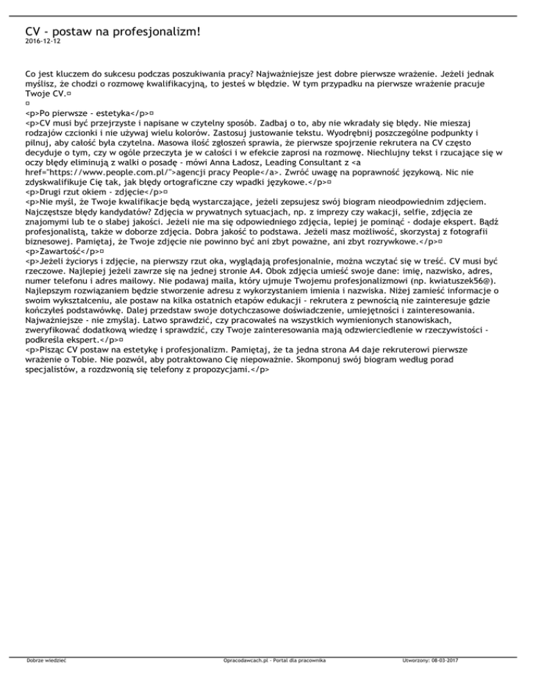 CV - postaw na profesjonalizm! 2016-12-12 Co jest kluczem do sukcesu podczas poszukiwania pracy? Najważniejsze jest dobre pierwsze wrażenie. Jeżeli jednak myślisz, że chodzi o rozmowę kwalifikacyjną, to jesteś w błędzie. W tym przypadku na pierwsze wrażenie pracuje Twoje CV. <p>Po pierwsze - estetyka</p> <p>CV musi być przejrzyste i napisane w czytelny sposób. Zadbaj o to, aby nie wkradały się błędy. Nie mieszaj rodzajów czcionki i nie używaj wielu kolorów. Zastosuj justowanie tekstu. Wyodrębnij poszczególne podpunkty i pilnuj, aby całość była czytelna. Masowa ilość zgłoszeń sprawia, że pierwsze spojrzenie rekrutera na CV często decyduje o tym, czy w ogóle przeczyta je w całości i w efekcie zaprosi na rozmowę. Niechlujny tekst i rzucające się w oczy błędy eliminują z walki o posadę - mówi Anna Ładosz, Leading Consultant z <a href="https://www.people.com.pl/">agencji pracy People</a>. Zwróć uwagę na poprawność językową. Nic nie zdyskwalifikuje Cię tak, jak błędy ortograficzne czy wpadki językowe.</p> <p>Drugi rzut okiem - zdjęcie</p> <p>Nie myśl, że Twoje kwalifikacje będą wystarczające, jeżeli zepsujesz swój biogram nieodpowiednim zdjęciem. Najczęstsze błędy kandydatów? Zdjęcia w prywatnych sytuacjach, np. z imprezy czy wakacji, selfie, zdjęcia ze znajomymi lub te o słabej jakości. Jeżeli nie ma się odpowiedniego zdjęcia, lepiej je pominąć - dodaje ekspert. Bądź profesjonalistą, także w doborze zdjęcia. Dobra jakość to podstawa. Jeżeli masz możliwość, skorzystaj z fotografii biznesowej. Pamiętaj, że Twoje zdjęcie nie powinno być ani zbyt poważne, ani zbyt rozrywkowe.</p> <p>Zawartość</p> <p>Jeżeli życiorys i zdjęcie, na pierwszy rzut oka, wyglądają profesjonalnie, można wczytać się w treść. CV musi być rzeczowe. Najlepiej jeżeli zawrze się na jednej stronie A4. Obok zdjęcia umieść swoje dane: imię, nazwisko, adres, numer telefonu i adres mailowy. Nie podawaj maila, który ujmuje Twojemu profesjonalizmowi (np. kwiatuszek56@). Najlepszym rozwiązaniem będzie stworzenie adresu z wykorzystaniem imienia i nazwiska. Niżej zamieść informacje o swoim wykształceniu, ale postaw na kilka ostatnich etapów edukacji - rekrutera z pewnością nie zainteresuje gdzie kończyłeś podstawówkę. Dalej przedstaw swoje dotychczasowe doświadczenie, umiejętności i zainteresowania. Najważniejsze - nie zmyślaj. Łatwo sprawdzić, czy pracowałeś na wszystkich wymienionych stanowiskach, zweryfikować dodatkową wiedzę i sprawdzić, czy Twoje zainteresowania mają odzwierciedlenie w rzeczywistości podkreśla ekspert.</p> <p>Pisząc CV postaw na estetykę i profesjonalizm. Pamiętaj, że ta jedna strona A4 daje rekruterowi pierwsze wrażenie o Tobie. Nie pozwól, aby potraktowano Cię niepoważnie. Skomponuj swój biogram według porad specjalistów, a rozdzwonią się telefony z propozycjami.</p> Dobrze wiedzieć Opracodawcach.pl - Portal dla pracownika Utworzony: 08-03-2017