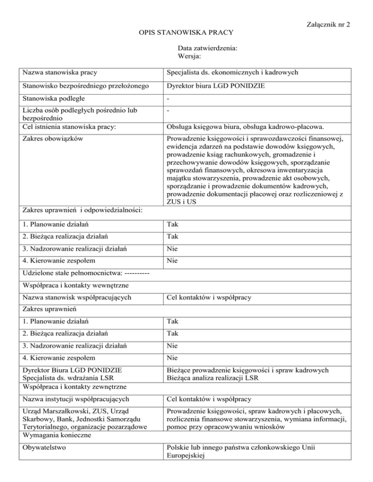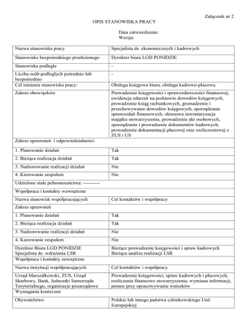 Załącznik nr 2 OPIS STANOWISKA PRACY Data zatwierdzenia: Wersja: Nazwa stanowiska pracy Specjalista ds. ekonomicznych i kadrowych Stanowisko bezpośredniego przełożonego Dyrektor biura LGD PONIDZIE Stanowiska podległe - Liczba osób podległych pośrednio lub bezpośrednio Cel istnienia stanowiska pracy: - Zakres obowiązków Prowadzenie księgowości i sprawozdawczości finansowej, ewidencja zdarzeń na podstawie dowodów księgowych, prowadzenie ksiąg rachunkowych, gromadzenie i przechowywanie dowodów księgowych, sporządzanie sprawozdań finansowych, okresowa inwentaryzacja majątku stowarzyszenia, prowadzenie akt osobowych, sporządzanie i prowadzenie dokumentów kadrowych, prowadzenie dokumentacji płacowej oraz rozliczeniowej z ZUS i US Obsługa księgowa biura, obsługa kadrowo-płacowa. Zakres uprawnień i odpowiedzialności: 1. Planowanie działań Tak 2. Bieżąca realizacja działań Tak 3. Nadzorowanie realizacji działań Nie 4. Kierowanie zespołem Nie Udzielone stałe pełnomocnictwa: ---------Współpraca i kontakty wewnętrzne Nazwa stanowisk współpracujących Cel kontaktów i współpracy Zakres uprawnień 1. Planowanie działań Tak 2. Bieżąca realizacja działań Tak 3. Nadzorowanie realizacji działań Nie 4. Kierowanie zespołem Nie Dyrektor Biura LGD PONIDZIE Specjalista ds. wdrażania LSR Współpraca i kontakty zewnętrzne Bieżące prowadzenie księgowości i spraw kadrowych Bieżąca analiza realizacji LSR Nazwa instytucji współpracujących Cel kontaktów i współpracy Urząd Marszałkowski, ZUS, Urząd Skarbowy, Bank, Jednostki Samorządu Terytorialnego, organizacje pozarządowe Wymagania konieczne Prowadzenie księgowości, spraw kadrowych i płacowych, rozliczenia finansowe stowarzyszenia, wymiana informacji, pomoc przy opracowywaniu wniosków Obywatelstwo Polskie lub innego państwa członkowskiego Unii Europejskiej Wykształcenie Wyższe ekonomiczne lub średnie ekonomiczne, Doświadczenie zawodowe (Okres w latach i w jakiej dziedzinie) Znajomość obsługi komputera 3 lata praktyki zawodowej w tym 1 rok przy obsłudze księgowej firmy lub organizacji pozarządowej Edytor tekstu, arkusz kalkulacyjny, Znajomość przepisów Prawo podatkowe, Ustawa o Rachunkowości, niekaralność stan zdrowia pozwalający na zatrudnienie na stanowisku Wymagania pożądane Znajomość przepisów Predyspozycje osobowościowe Doświadczenie Kodeksu Postępowania Administracyjnego, Ustawy Prawo o Stowarzyszeniach, Ustaw i rozporządzeń w zakresie działania „wsparcie dla rozwoju lokalnego w ramach inicjatywy LEADER” asertywność , łatwość podejmowania decyzji, łatwość nawiązywania kontaktów, wysoka kultura osobista, dokładność, terminowość, komunikatywność, skrupulatność, cierpliwość doświadczenie w pozyskiwaniu funduszy, Kursy i szkolenia niezbędne na stanowisku, certyfikaty Dodatkowe kompetencje kursy i szkolenia w zakresie księgowości, kursy i szkolenia w zakresie funduszy unijnych, znajomość języków obcych j. niemiecki, francuski lub angielski Inne umiejętności Umiejętność logicznego myślenia, umiejętność archiwizowania dokumentów Wymiar czasu pracy: system pracy - 4 godzinny, jednozmianowy Powierzony sprzęt 1. Zestaw komputerowy z oprogramowaniem: pakiet biurowy MS Office ………………………………….. data i podpis pracownika ………………………………….. data i podpis przełożonego