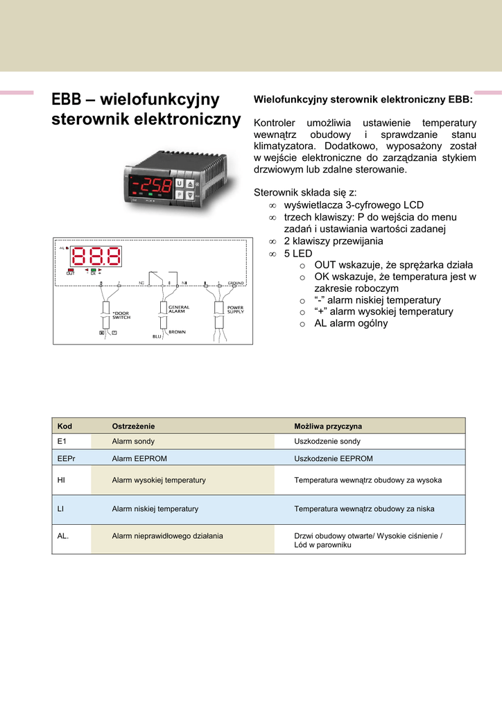EBB – wielofunkcyjny sterownik elektroniczny Wielofunkcyjny sterownik elektroniczny EBB: Kontroler umoŜliwia ustawienie temperatury wewnątrz obudowy i sprawdzanie stanu klimatyzatora. Dodatkowo, wyposaŜony został w wejście elektroniczne do zarządzania stykiem drzwiowym lub zdalne sterowanie. Sterownik składa się z: • wyświetlacza 3-cyfrowego LCD • trzech klawiszy: P do wejścia do menu zadań i ustawiania wartości zadanej • 2 klawiszy przewijania • 5 LED o OUT wskazuje, Ŝe spręŜarka działa o OK wskazuje, Ŝe temperatura jest w zakresie roboczym o “-” alarm niskiej temperatury o “+” alarm wysokiej temperatury o AL alarm ogólny Kod OstrzeŜenie MoŜliwa przyczyna E1 Alarm sondy Uszkodzenie sondy EEPr Alarm EEPROM Uszkodzenie EEPROM HI Alarm wysokiej temperatury Temperatura wewnątrz obudowy za wysoka LI Alarm niskiej temperatury Temperatura wewnątrz obudowy za niska AL. Alarm nieprawidłowego działania Drzwi obudowy otwarte/ Wysokie ciśnienie / Lód w parowniku