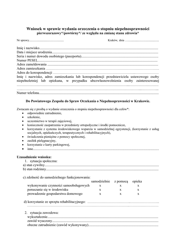 Wniosek w sprawie wydania orzeczenia o stopniu niepełnosprawności pierwszorazowy*/powtórny*/ ze względu na zmianę stanu zdrowia* Nr sprawy............................................... Kraków, dnia ….......................................... Imię i nazwisko...................................................................................................................................... Data i miejsce urodzenia........................................................................................................................ Seria i numer dowodu osobistego (paszportu)....................................................................................... Numer PESEL....................................................................................................................................... Adres zameldowania ............................................................................................................................. Adres zamieszkania ……………………………………………………………………………………………………. Adres do korespondencji ………………………………………………………………………...…………………… Imię i nazwisko, adres zamieszkania lub korespondencji przedstawiciela ustawowego osoby niepełnoletniej lub opiekuna, w przypadku ubezwłasnowolnienia osoby zainteresowanej …………………………………………………………………………………...…………….……… …..………………………………………………………………………………………...…………... Numer telefonu....................................................................................................................................... Do Powiatowego Zespołu do Spraw Orzekania o Niepełnosprawności w Krakowie. Zwracam się z prośbą o wydanie orzeczenia o stopniu niepełnosprawności dla celów*: odpowiednie zatrudnienie, szkolenie, uczestnictwo w terapii zajęciowej, konieczność zaopatrzenia w przedmioty ortopedyczne i środki pomocnicze, korzystanie z systemu środowiskowego wsparcia w samodzielnej egzystencji, (korzystanie z usług socjalnych, opiekuńczych, terapeutycznych i rehabilitacyjnych), świadczenia pieniężne z pomocy społecznej, zasiłek pielęgnacyjny, korzystanie z karty parkingowej, inne........................................................................................................................................................... Uzasadnienie wniosku: 1. sytuacja społeczna: a) stan cywilny................................................................................................................................. b) stan rodzinny............................................................................................................................... c) zdolność do samodzielnego funkcjonowania: wykonywanie czynności samoobsługowych poruszanie się w środowisku prowadzenie gospodarstwa domowego samodzielnie x x x z pomocą x x x opieka x x x d) korzystanie ze sprzętu rehabilitacyjnego: ……………………………………..………………………... …………………………………………………………………………………………..………………………… 2. sytuacja zawodowa: wykształcenie............................................................................................................................. zawód wyuczony........................................................................................................................ obecne zatrudnienie (zawód wykonywany)............................................................................... Zgodnie z § 15 ust. 1 Rozporządzenia Ministra Gospodarki, Pracy i Polityki Społecznej z dnia 15 lipca 2003r. w sprawie orzekania o niepełnosprawności i stopniu niepełnosprawności (Dz. U. z 2003 r., Nr 139, poz. 1328 z późn. zm.) osoba niepełnosprawna posiadająca orzeczenie o stopniu niepełnosprawności wydane na czas określony i starająca się o jego kontynuację, może złożyć wniosek o ponowne ustalenie stopnia niepełnosprawności, nie wcześniej niż 30 dni przed upływem ważności posiadanego orzeczenia. Zgodnie z § 35 rozporządzenia Ministra Gospodarki, Pracy i Polityki Społecznej z dnia 15 lipca 2003 r. w sprawie orzekania o niepełnosprawności i stopniu niepełnosprawności (Dz. U. z 2003 r. Nr 139, poz. 1328), starosta wystawia legitymację osoby niepełnosprawnej. W celu uzyskania legitymacji osoby niepełnosprawnej z wpisanym symbolem przyczyny niepełnosprawności konieczne jest złożenie stosownego wniosku. Oświadczam, że: 1. pobieram / nie pobieram* świadczenia z ubezpieczenia społecznego, jakie: a) emerytura b) renta ZUS/ KRUS* z tytułu…………………………………................………………..…… c) inne……………………………………………………………………………………..……... od kiedy...................................................................................................................................... 2. aktualnie toczy się / nie toczy się* w mojej sprawie postępowaniem przed innym organem orzeczniczym, podać jakim........................................................................................................ 3. składałem / nie składałem* uprzednio wniosku o ustalenie stopnia niepełnosprawności: jeśli tak, to kiedy......................................................................................................................... z jakim skutkiem......................................................................................................................... 4. mogę / nie mogę* samodzielnie przybyć na posiedzenie składu orzekającego 5. w razie stwierdzonej przez zespół orzekający konieczności wykonania badań dodatkowych, konsultacji specjalistycznych lub o