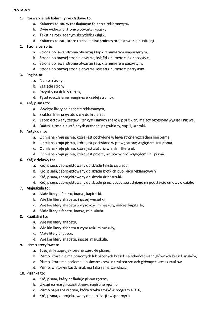 ZESTAW 1 1. Rozwarcie lub kolumny rozkładowe to: a. Kolumny tekstu w rozkładanym folderze reklamowym, b. Dwie widoczne stronice otwartej książki, c. Tekst na rozkładanym skrzydełku książki, d. Kolumny tekstu, które trzeba ułożyć podczas projektowania publikacji. 2. Strona verso to: a. Strona po lewej stronie otwartej książki z numerem nieparzystym, b. Strona po prawej stronie otwartej książki z numerem nieparzystym, c. Strona po lewej stronie otwartej książki z numerem parzystym, d. Strona po prawej stronie otwartej książki z numerem parzystym. 3. Pagina to: a. Numer strony, b. Zagięcie strony, c. Przypisy na dole stronicy, d. Tytuł rozdziału na marginesie każdej stronicy. 4. Krój pisma to: a. Wycięte litery na banerze reklamowym, b. Szablon liter przygotowany do krojenia, c. Zaprojektowany zestaw liter cyfr i innych znaków pisarskich, mający określony wygląd i nazwę, d. Rodzaj pisma o określonych cechach: pogrubiony, wąski, szeroki. 5. Antykwa to: a. Odmiana kroju pisma, które jest pochylone w lewą stronę względem linii pisma, b. Odmiana kroju pisma, które jest pochylone w prawą stronę względem linii pisma, c. Odmiana kroju pisma, które jest złożona wielkimi literami, d. Odmiana kroju pisma, które jest proste, nie pochylone względem linii pisma. 6. Krój dziełowy to: a. Krój pisma, zaprojektowany do składu tekstu ciągłego, b. Krój pisma, zaprojektowany do składu krótkich publikacji reklamowych, c. Krój pisma, zaprojektowany do składu dzieł sztuki, d. Krój pisma, zaprojektowany do składu przez osoby zatrudnione na podstawie umowy o dzieło. 7. Majuskuła to: a. Małe litery alfabetu, inaczej kapitaliki, b. Wielkie litery alfabetu, inaczej wersaliki, c. Wielkie litery alfabetu o wysokości minuskuły, inaczej kapitaliki, d. Małe litery alfabetu, inaczej minuskuła. 8. Kapitaliki to: a. Wielkie litery alfabetu, b. Wielkie litery alfabetu o wysokości minuskuły, c. Małe litery alfabetu, d. Wielkie litery alfabetu, inaczej majuskuła. 9. Pismo szeryfowe to: a. Specjalnie zaprojektowane szerokie pismo, b. Pismo, które nie ma poziomych lub skośnych kresek na zakończeniach głównych kresek znaków, c. Pismo, które ma poziome lub skośne kreski na zakończeniach głównych kresek znaków, d. Pismo, w którym każdy znak ma taką samą szerokość. 10. Pisanka to: a. Krój pisma, który naśladuje pismo ręczne, b. Uwagi na marginesach strony, napisane ręcznie, c. Pismo napisane ręcznie, które trzeba złożyć w programie DTP, d. Krój pisma, zaprojektowany do publikacji świątecznych. 11. Wysokość x to: a. Wysokość pisma, która nie jest określona, b. Wysokość tekstu, którą trzeba obliczyć, żeby tekst zmieścił się na stronie, c. Wysokość liter majuskułowych, d. Wysokość liter minuskułowych. 12. Wydłużenie górne to: a. Elementy liter, które przekraczają wysokość x i linię podstawową pisma poniżej tej linii, b. Elementy liter, które przekraczają wysokość x i linię podstawową pisma powyżej tej linii, c. Tekst, który jest podniesiony względem podstawowej linii pisma, d. Tekst, który jest za nisko na stronie i należy go podnieść wyżej. 13. Stopień pisma to: a. Długość wiersza pisma, b. Wysokość kolumny tekstu na stronie, c. Wielkość pisma, podawana w punktach typograficznych, d. Wielkość pisma, mierzona bez wydłużeń górnych i dolnych, podawana w punktach typograficznych. 14. Światło międzyliterowe to: a. Odległość między znakami tekstu, b. Tekst o dużej odległości między znakami, c. Pismo bardzo cienkie, które w tekście ciągłym wydaje się jasne, d. Ciemny tekst na jasnym tle. 15. Kerning to: a. Zwiększanie odległości między wszystkimi znakami tekstu, b. Zmniejszanie odległości między wszystkimi znakami tekstu, c. Zmiana odległości między parami znaków tekstu, d. Zmiana odległości między wszystkimi znakami tekstu. 16. Łamanie tekstu to: a. Tekst napisany ukośnie, b. Przenoszenie liter do następnego wiersza tekstu, c. Dzielenie szerokiej kolumny tekstu na węższe łamy na stronie, d. Umieszczenie tekstu w kolumnie lub jej łamach na stronie. 17. Formatowanie, skład tekstu to: a. Przenoszenie tekstu na następną stronę, b. Nadawanie odpowiedniego wyglądu tekstu: wielkość, pogrubienie, kolor, rodzaju czcionki, c. Dzielenie tekstu na akapity, d. Zamiana tekstu akapitowego na tekst ozdobny. 18. Szerokość łamu to: a. Szerokość kolumny tekstu, b. Szerokość całego tekstu na stronie, c. Szerokość pojedynczego łamu na stronie, d. Szerokość wszystkich łamów na stronie. 19. Justowaniem tekstu nie jest: a. Wyrównanie tekstu do obu stron łamu, b. Układ tekstu, którego lewa i prawa krawędź tworzą równą, pionową linię, c. Wyrównanie obustronne, d. Wyrównanie tekstu do środka, gdzie jego obie krawędzie tworzą nieregularny kształt. 20. Do tekstu wyrównanego lewostronnie nie pasuje określenie: a. Wszystkie odstępy między wyrazami są takie same, b. Wszystkie odstępy między wyrazami są inne, c. Prawa krawędź tekstu jest nieregularna, d. Taki układ nazywa się chorągiewką z prawej.