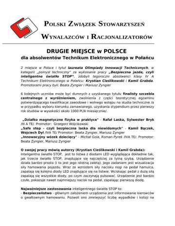 POLSKI ZWIĄZEK STOWARZYSZEŃ WYNALAZCÓW I RACJONALIZATORÓW DRUGIE MIEJSCE w POLSCE dla absolwentów Technikum Elektronicznego w Połańcu 2 miejsce w Polsce i tytuł laureata Olimpiady Innowacji Technicznych, w kategorii „pomysł techniczny” za wykonanie pracy „Bezpieczna jazda, czyli inteligentne światło STOP”, zdobyli tegoroczni absolwenci klasy IV A Technikum Elektronicznego w Połańcu: Krystian Cieślikowski i Kamil Grabda. Promotorami pracy byli: Beata Zyngier i Mariusz Zyngier 6 kolejnych uczniów może być dumnych z uzyskanego tytułu finalisty szczebla centralnego z wyróżnieniem, zwolnienia z części teoretycznej egzaminu potwierdzającego kwalifikacje zawodowe i wolnego wstępu na studia techniczne /a w przypadku wyboru kierunku zamawianego, uzyskania stypendium przez pierwszy rok studiów w wysokości około 1000 PLN miesięcznie/. „Działko magnetyczne fizyka w praktyce" - Rafał Laska, Sylwester Bryk /III A TE/. Promotor: Grzegorz Wójcikowski „Safe step - czyli bezpieczna laska dla niewidomych" - Kamil Bączek, Wojciech Dyl /IVA TE/ Promotor: Beata Zyngier, Mariusz Zyngier „Innowacyjny wózek dziecięcy" - Michał Gola, Roman Pyrek /IVA TE/. Promotor: Beata Zyngier, Mariusz Zyngier O swojej pracy mówią autorzy (Krystian Cieślikowski i Kamil Grabda): Inteligentna światło STOP, jest to listwa z diodami LED wyglądająca dokładnie tak, jak trzecie światło STOP, znajdujące się najczęściej za tylną szybą. Urządzenie działa bardzo prosto (i to jest jego istotną zaletą). Jego zadaniem jest wizualizacja siły hamowania pojazdu. Wraz ze wzrostem siły nacisku nogi na pedał hamulca, zapalają się kolejno diody LED znajdujące się na listwie. Wciskając pedał z dużą siłą zapalają się wszystkie diody, po czym zaczynają pulsować. Urządzenie jest bardzo czułe, pokazuje nawet najmniejszy nacisk na pedał, zapalając pierwszą diodę. Najważniejsze zastosowania inteligentnego światła STOP to: - Bezpieczeństwo - głównym założeniem urządzenia jest informowanie kierowców o gwałtownym hamowaniu. Pozwoli ono zmniejszyć liczbę wypadków i kolizji na drogach. Gdy poprzedzający samochód nagle się zatrzyma, możesz dostatecznie szybko zareagować i często uniknąć wypadku bądź kolizji. - Ekologia - w dzisiejszych czasach, gdy ceny paliw są wysokie, wielu kierowców stosuje metodę ECO - driving'u, by zmniejszyć zużycie paliwa. Zmniejszamy tym samym ilość emitowanych spalin, które są szkodliwe dla środowiska. Urządzenie pozwoli na zastosowanie jednej z zasad jazdy ECO: "Bądź przewidujący – unikaj zbędnych przyspieszeń i hamowań." Wprowadzenie światła umożliwi unikanie zbędnego hamowania. Gdy pojazd przed nami minimalnie wciska pedał hamulca, normalne światło zaświeca się tak, jak w przypadku silnego wciśnięcia pedału (gwałtowne hamowanie). Inteligentne światło STOP ma za zadanie to zmienić, bowiem gdy kierowca zechce delikatnie zahamować, światło dokładnie o tym poinformuje. Co zyskaliśmy dzięki tej pracy? mówią autorzy Krystian Cieślikowski i Kamil Grabda: „Dużo czasu pochłonęło przewertowanie ogromnej ilości literatury, lecz gdy nasza praca zadziałała po raz pierwszy wiedzieliśmy że ten czas nie poszedł „na marne” . Rozszerzyliśmy wiedzę nabytą w szkole, m.in. programowanie mikrokontrolerów AVR w języku BASCOM, wytrawianie płytek drukowanych oraz zdobyliśmy nowe doświadczenie które z pewnością przyda nam się na studiach i w przyszłej pracy bądź codziennym życiu.” Zgodnie z regulaminem konkursu, KATEGORIA POMYSŁ TECHNICZNY obejmuje prace, w których wprowadzono istotne zmiany w stosunku do aktualnie istniejących rozstrzygnięć technicznych, w użytkowanych do tej pory urządzeniach, maszynach, wyrobach i sposobach wytwarzania. Zaproponowane przez ucznia rozwiązanie powinno wnosić oryginalne zmiany do istniejącego stanu techniki, m.in., poprzez zwiększenie użyteczności wyrobu, jego walorów funkcyjnych, istotne obniżenie kosztów jego wytwarzania lub eksploatacji. Wszelkie prace w tej kategorii powinny nosić znamiona wynalazku, albo wzoru użytkowego lub wzoru przemysłowego . Praca została doceniona przez ekspertów z Polskiego Związku Stowarzyszeń Wynalazców i Racjonalizatorów oraz Wojewódzkich i Regionalnych Klubów Techniki i Racjonalizacji, Stowarzyszenia Naukowo Technicznych NOT. Niezwykle przychylne opinie o pracy wydała Policja, serwisy z branży motoryzacyjnej (w tym serwis firmowy SCANIA). Podobne konstrukcje istnieją na rynku i są montowane w najnowszych modelach samochodów wyższej klasy. Rozwiązanie młodych techników z Połańca wprowadza wiele istotnych modyfikacji technicznych (przez co zostało docenione w kategorii pomysł techniczny) oraz jest tanie w produkcji.
