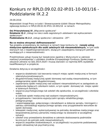 Konkurs nr RPLD.09.02.02-IP.01-10-001/16 Poddziałanie IX.2.2 29.09.2016 Wojewódzki Urząd Pracy w Łodzi i Stowarzyszenie Łódzki Obszar Metropolitalny ogłaszają konkurs nr RPLD.09.02.02-IP.01-10-001/16 w ramach: Osi Priorytetowej IX „Włączenie społeczne" Działanie IX.2 „Usługi na rzecz osób zagrożonych ubóstwem lub wykluczeniem społecznym" Poddziałania IX.2.2 „Usługi społeczne i zdrowotne - ZIT". Na co można otrzymać dofinansowanie? Typ projektu przewidziany do realizacji w ramach tego konkursu to: rozwój usług medyczno-opiekuńczych dla osób zależnych lub niesamodzielnych, w tym osób starszych lub z niepełnosprawnościami, służących zaspokojeniu rosnących potrzeb wynikających z niesamodzielności. Przedmiotowe usługi muszą być świadczone zgodnie z Wytycznymi w zakresie realizacji przedsięwzięć z udziałem środków Europejskiego Funduszu Społecznego w obszarze zdrowia na lata 2014-2020 i muszą stanowić co najmniej 60% wydatków kwalifikowanych w projekcie. Działania dotyczą w szczególności: • wsparcia działalności lub tworzenia nowych miejsc opieki medycznej w formach zdeinstytucjonalizowanych; • długoterminowej medycznej opieki domowej nad osobą niesamodzielną, w tym pielęgniarskiej opieki długoterminowej; • zapewniania opieki medycznej nad osobami niesamodzielnymi w zastępstwie za opiekunów będących członkami rodzin, w tym opieki domowej lub miejsc opieki w dziennych formach; • wsparcia psychologicznego lub szkoleń dla opiekunów, w szczególności członków rodzin, w zakresie opieki medycznej nad osobami niesamodzielnymi; • przygotowania i tworzenia wypożyczalni sprzętu rehabilitacyjnego, pielęgnacyjnego i wspomagającego, połączonego z doradztwem w doborze sprzętu, treningami z zakresu samoobsługi wypożyczonego sprzętu oraz przygotowanie warunków do opieki domowej; • teleopieki medycznej, wykorzystywanej na potrzeby doradztwa medycznego oraz bezpośredniej pomocy personelu medycznego na wezwanie w szczególnej sytuacji; • szkoleń oraz prowadzenia doradztwa w zakresie dostosowania podmiotów leczniczych do potrzeb osób niesamodzielnych; • wsparcia zespołów środowiskowych, w szczególności na poziomie podstawowej opieki zdrowotnej lub psychiatrycznej. Dodatkowo możliwa jest realizacja usług medyczno-opiekuńczych dla osób zależnych lub niesamodzielnych, w tym osób starszych lub z niepełnosprawnościami, służących zaspokojeniu rosnących potrzeb wynikających z niesamodzielności świadczonych zgodnie z Wytycznymi w zakresie realizacji przedsięwzięć w obszarze włączenia społecznego i zwalczania ubóstwa z wykorzystaniem środków Europejskiego Funduszu Społecznego i Europejskiego Funduszu Rozwoju Regionalnego na lata 2014-2020 to jest: • usług opiekuńczych, • usług asystenckich, • usług w postaci mieszkań wspomaganych. Ogólna pula środków na dofinansowanie: Kwota przeznaczona na dofinansowanie projektów w konkursie wynosi 23 976 672,00 PLN. Maksymalny poziom dofinansowania wydatków kwalifikowalnych w projekcie wynosi 90,00%. Kto może otrzymać dofinansowanie? 1. Instytucje pomocy i integracji społecznej, 2. Jednostki samorządu terytorialnego i ich jednostki organizacyjne, związki, porozumienia i stowarzyszenia JST, 3. Organizacje pozarządowe i podmioty ekonomii społecznej, statutowo świadczące usługi na rzecz osób zagrożonych wykluczeniem społecznym, 4. Podmioty wymienione w art. 3 ust. 3 ustawy o działalności pożytku publicznego i wolontariacie, statutowo świadczące usługi na rzecz osób zagrożonych wykluczeniem społecznym, 5. Podmioty lecznicze. Wnioskodawcą lub partnerem realizującym działania z zakresu deinstytucjonalizacji form opieki, zgodnie z Wytycznymi w zakresie realizacji przedsięwzięć z udziałem środków EFS w obszarze zdrowia na lata 2014-2020 może być wyłącznie podmiot wskazany w art. 4 bądź podmiot wykonujący działalność leczniczą zgodnie z art. 5 ustawy z dnia 15 kwietnia 2011 r. o działalności leczniczej, który posiada wpis do Rejestru Podmiotów Wykonujących Działalność Leczniczą. Grupa docelowa: W ramach konkursu wsparciem mogą być objęte tylko poniższe grupy docelowe: • osoby niesamodzielne; • otoczenie osób niesamodzielnych w szczególności opiekunowie faktyczni oraz rodziny osób niesamodzielnych; • podmioty lecznicze w zakresie szkoleń i prowadzonego doradztwa w celu dostosowania ich do potrzeb osób niesamodzielnych. Uwaga! Zgodnie ze szczegółowym kryterium dostępu nr 12 uczestnikami projektu mogą być: • osoby zamieszkałe w rozumieniu przepisów Kodeksu Cywilnego, na obszarze ŁOM, tj.: Miasto Łódź i powiaty: brzeziński, łódzki wschodni, pabianicki oraz zgierski. • podmioty posiadające jednostkę organizacyjną na obszarze ŁOM, tj.: Miasto Łódź i powiaty: brzeziński, łódzki wschodni, pabianicki oraz zgierski Termin składania wniosków: Wnioski o dofinansowanie można składać w terminie od 31 października 2016 r. do 21 listopada 2016 roku . Termin ogłoszenia wyników: Planowany termin rozstrzygnięcia konkursu: kwiecień 2017 r. Sposób składania wniosków: Wnioski o dofinansowanie realizacji projektów należy składać w formie papierowej (1 egzemplarz) oraz formie elektronicznej (w formacie xls lub xlsx) zgodnie z formularzem stanowiącym załącznik nr 1 do Regulaminu konkursu. Miejsce składania wniosków: • za pośrednictwem operatora pocztowego na adres: Wojewódzki Urząd Pracy w Łodzi ul. Wólczańska 49, 90-608 Łódź • osobiście lub przez posłańca w Punkcie Informacyjnym ul. Wólczańska 49, 90-608 Łódź Pokój 1.03, 1.04, I piętro Środki odwoławcze przysługujące składającemu wniosek: Procedurę odwoławczą w perspektywie finansowej 2014-2020 reguluje Rozdział 15. Procedura odwoławcza, ustawy z dnia 11 lipca 2014 r. o zasadach realizacji programów w zakresie polityki spójności finansowanych w perspektywie finansow
