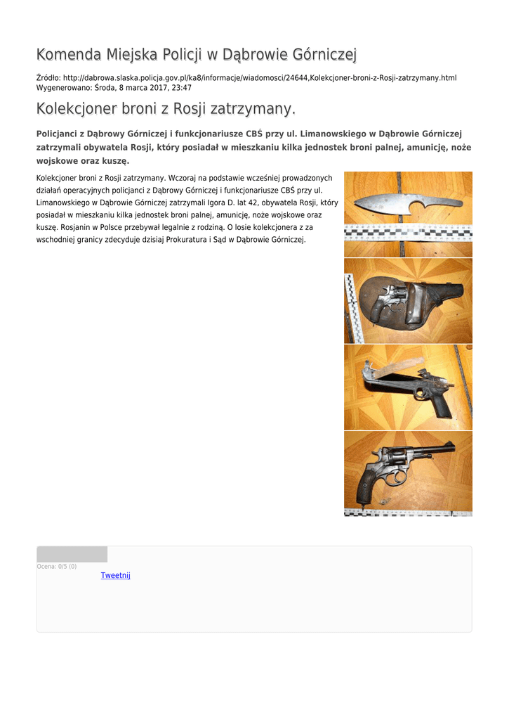 Komenda Miejska Policji w Dąbrowie Górniczej Źródło: http://dabrowa.slaska.policja.gov.pl/ka8/informacje/wiadomosci/24644,Kolekcjoner-broni-z-Rosji-zatrzymany.html Wygenerowano: Środa, 8 marca 2017, 23:47 Kolekcjoner broni z Rosji zatrzymany. Policjanci z Dąbrowy Górniczej i funkcjonariusze CBŚ przy ul. Limanowskiego w Dąbrowie Górniczej zatrzymali obywatela Rosji, który posiadał w mieszkaniu kilka jednostek broni palnej, amunicję, noże wojskowe oraz kuszę. Kolekcjoner broni z Rosji zatrzymany. Wczoraj na podstawie wcześniej prowadzonych działań operacyjnych policjanci z Dąbrowy Górniczej i funkcjonariusze CBŚ przy ul. Limanowskiego w Dąbrowie Górniczej zatrzymali Igora D. lat 42, obywatela Rosji, który posiadał w mieszkaniu kilka jednostek broni palnej, amunicję, noże wojskowe oraz kuszę. Rosjanin w Polsce przebywał legalnie z rodziną. O losie kolekcjonera z za wschodniej granicy zdecyduje dzisiaj Prokuratura i Sąd w Dąbrowie Górniczej. Ocena: 0/5 (0) Tweetnij