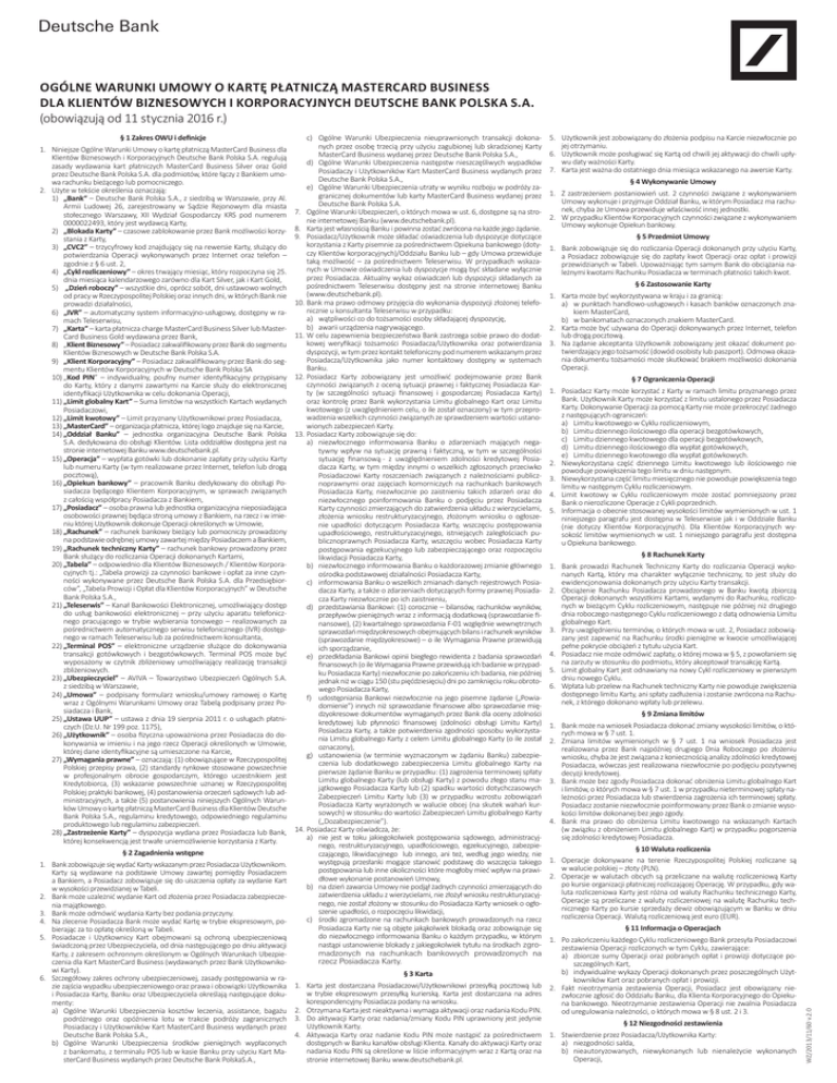 Deutsche Bank OGÓLNE WARUNKI UMOWY O KARTĘ PŁATNICZĄ MASTERCARD BUSINESS DLA KLIENTÓW BIZNESOWYCH I KORPORACYJNYCH DEUTSCHE BANK POLSKA S.A. (obowiązują od 11 stycznia 2016 r.) § 2 Zagadnienia wstępne 1. Bank zobowiązuje się wydać Karty wskazanym przez Posiadacza Użytkownikom. Karty są wydawane na podstawie Umowy zawartej pomiędzy Posiadaczem a Bankiem, a Posiadacz zobowiązuje się do uiszczenia opłaty za wydanie Kart w wysokości przewidzianej w Tabeli. 2. Bank może uzależnić wydanie Kart od złożenia przez Posiadacza zabezpieczenia majątkowego. 3. Bank może odmówić wydania Karty bez podania przyczyny. 4. Na zlecenie Posiadacza Bank może wydać Kartę w trybie ekspresowym, pobierając za to opłatę określoną w Tabeli. 5. Posiadacze i Użytkownicy Kart obejmowani są ochroną ubezpieczeniową świadczoną przez Ubezpieczyciela, od dnia następującego po dniu aktywacji Karty, z zakresem ochronnym określonym w Ogólnych Warunkach Ubezpieczenia dla Kart MasterCard Business (wydawanych przez Bank Użytkownikowi Karty). 6. Szczegółowy zakres ochrony ubezpieczeniowej, zasady postępowania w razie zajścia wypadku ubezpieczeniowego oraz prawa i obowiązki Użytkownika i Posiadacza Karty, Banku oraz Ubezpieczyciela określają następujące dokumenty: a) Ogólne Warunki Ubezpieczenia kosztów leczenia, assistance, bagażu podróżnego oraz opóźnienia lotu w trakcie podróży zagranicznych Posiadaczy i Użytkowników Kart MasterCard Business wydanych przez Deutsche Bank Polska S.A., b) Ogólne Warunki Ubezpieczenia środków pieniężnych wypłaconych z bankomatu, z terminalu POS lub w kasie Banku przy użyciu Kart MasterCard Business wydanych przez Deutsche Bank PolskaS.A., c) Ogólne Warunki Ubezpieczenia nieuprawnionych transakcji dokonanych przez osobę trzecią przy użyciu zagubionej lub skradzionej Karty MasterCard Business wydanej przez Deutsche Bank Polska S.A., d) Ogólne Warunki Ubezpieczenia następstw nieszczęśliwych wypadków Posiadaczy i Użytkowników Kart MasterCard Business wydanych przez Deutsche Bank Polska S.A., e) Ogólne Warunki Ubezpieczenia utraty w wyniku rozboju w podróży zagranicznej dokumentów lub karty MasterCard Business wydanej przez Deutsche Bank Polska S.A. 7. Ogólne Warunki Ubezpieczeń, o których mowa w ust. 6, dostępne są na stronie internetowej Banku (www.deutschebank.pl). 8. Karta jest własnością Banku i powinna zostać zwrócona na każde jego żądanie. 9. Posiadacz/Użytkownik może składać oświadczenia lub dyspozycje dotyczące korzystania z Karty pisemnie za pośrednictwem Opiekuna bankowego (dotyczy Klientów korporacyjnych)/Oddziału Banku lub – gdy Umowa przewiduje taką możliwość – za pośrednictwem Teleserwisu. W przypadkach wskazanych w Umowie oświadczenia lub dyspozycje mogą być składane wyłącznie przez Posiadacza. Aktualny wykaz oświadczeń lub dyspozycji składanych za pośrednictwem Teleserwisu dostępny jest na stronie internetowej Banku (www.deutschebank.pl). 10.Bank ma prawo odmowy przyjęcia do wykonania dyspozycji złożonej telefonicznie u konsultanta Teleserwisu w przypadku: a) wątpliwości co do tożsamości osoby składającej dyspozycję, b) awarii urządzenia nagrywającego. 11.W celu zapewnienia bezpieczeństwa Bank zastrzega sobie prawo do dodatkowej weryfikacji tożsamości Posiadacza/Użytkownika oraz potwierdzania dyspozycji, w tym przez kontakt telefoniczny pod numerem wskazanym przez Posiadacza/Użytkownika jako numer kontaktowy dostępny w systemach Banku. 12.Posiadacz Karty zobowiązany jest umożliwić podejmowanie przez Bank czynności związanych z oceną sytuacji prawnej i faktycznej Posiadacza Karty (w szczególności sytuacji finansowej i gospodarczej Posiadacza Karty) oraz kontrolę przez Bank wykorzystania Limitu globalnego Kart oraz Limitu kwotowego (z uwzględnieniem celu, o ile został oznaczony) w tym przeprowadzenia wszelkich czynności związanych ze sprawdzeniem wartości ustanowionych zabezpieczeń Karty. 13.Posiadacz Karty zobowiązuje się do: a) niezwłocznego informowania Banku o zdarzeniach mających negatywny wpływ na sytuację prawną i faktyczną, w tym w szczególności sytuację finansową - z uwzględnieniem zdolności kredytowej Posiadacza Karty, w tym między innymi o wszelkich zgłoszonych przeciwko Posiadaczowi Karty roszczeniach związanych z należnościami publicznoprawnymi oraz zajęciach komorniczych na rachunkach bankowych Posiadacza Karty, niezwłocznie po zaistnieniu takich zdarzeń oraz do niezwłocznego poinformowania Banku o podjęciu przez Posiadacza Karty czynności zmierzających do zatwierdzenia układu z wierzycielami, złożenia wniosku restrukturyzacyjnego, złożonym wniosku o ogłoszenie upadłości dotyczącym Posiadacza Karty, wszczęciu postępowania upadłościowego, restrukturyzacyjnego, istniejących zaległościach publicznoprawnych Posiadacza Karty, wszczęciu wobec Posiadacza Karty postępowania egzekucyjnego lub zabezpieczającego oraz rozpoczęciu likwidacji Posiadacza Karty, b) niezwłocznego informowania Banku o każdorazowej zmianie głównego ośrodka podstawowej działalności Posiadacza Karty, c) informowania Banku o wszelkich zmianach danych rejestrowych Posiadacza Karty, a także o zdarzeniach dotyczących formy prawnej Posiadacza Karty niezwłocznie po ich zaistnieniu, d) przedstawiania Bankowi: (1) corocznie – bilansów, rachunków wyników, przepływów pieniężnych wraz z informacją dodatkową (sprawozdanie finansowe), (2) kwartalnego sprawozdania F-01 względnie wewnętrznych sprawozdań międzyokresowych obejmujących bilans i rachunek wyników (sprawozdanie międzyokresowe) – o ile Wymagania Prawne przewidują ich sporządzanie, e) przedkładania Bankowi opinii biegłego rewidenta z badania sprawozdań finansowych (o ile Wymagania Prawne przewidują ich badanie w przypadku Posiadacza Karty) niezwłocznie po zakończeniu ich badania, nie później jednak niż w ciągu 150 (stu p