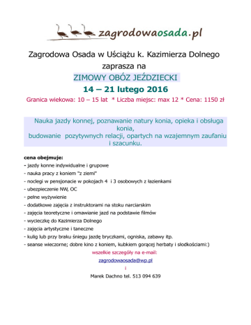 Zagrodowa Osada w Uściążu k. Kazimierza Dolnego zaprasza na ZIMOWY OBÓZ JEŹDZIECKI 14 – 21 lutego 2016 Granica wiekowa: 10 – 15 lat * Liczba miejsc: max 12 * Cena: 1150 zł Nauka jazdy konnej, poznawanie natury konia, opieka i obsługa konia, budowanie pozytywnych relacji, opartych na wzajemnym zaufaniu i szacunku. cena obejmuje: - jazdy konne indywidualne i grupowe - nauka pracy z koniem "z ziemi" - noclegi w pensjonacie w pokojach 4 i 3 osobowych z łazienkami - ubezpieczenie NW, OC - pełne wyżywienie - dodatkowe zajęcia z instruktorami na stoku narciarskim - zajęcia teoretyczne i omawianie jazd na podstawie filmów - wycieczkę do Kazimierza Dolnego - zajęcia artystyczne i taneczne - kulig lub przy braku śniegu jazdę bryczkami, ogniska, zabawy itp. - seanse wieczorne; dobre kino z koniem, kubkiem gorącej herbaty i słodkościami:) wszelkie szczegóły na e-mail: [email protected] i Marek Dachno tel. 513 094 639 KARTA ZGŁOSZENIA DZIECKA NA OBÓZ - imię i nazwisko dziecka:............................................................................................., -data i miejsce urodzenia dziecka:................................................................................., -miejscowość, kod pocztowy, ul. i nr domu:........................................................................................., -telefon domowy:............................................, -telefon kom. rodzica/opiekuna: ......................................................, -e-mail rodzica/opiekuna: …............................................................, -pesel dziecka :............................................................, (dane m.in. dla ubezpieczyciela) Oświadczenie rodzica/opiekuna: 1. Zgłaszając dziecko oświadczam, że zapoznałem/am się i akceptuję następujące ustalenia: - Uczestnik zobowiązany jest posiadać przy sobie aktualną legitymację szkolną, - Uczestnik ma obowiązek stosować się do regulaminu obowiązującego na obozie oraz poleceń kadry, - Organizator nie ponosi odpowiedzialności za sprzęt sportowy, przedmioty wartościowe i pieniądze Uczestnika. Istnieje możliwość oddania ich do depozytu Wychowawcy lub do recepcji ośrodka, - Rodzice / opiekunowie są odpowiedzialni materialnie za szkody wyrządzone przez Uczestnika. 2. Wyrażam zgodę na czynny udział dziecka w obozie tzn; w realizacji programu artystycznego a w szczególności rekreacji ruchowej, dojazdu na stok narciarski w Rąblowie (7 km) i wyjazdu na wycieczkę do Kazimierza Dolnego (6 km). 3. Wyrażam zgodę na przetwarzanie danych osobowych dziecka (tylko do celów związanych z prawidłową organizacją wypoczynku). Czytelny podpis rodzica / opiekuna:............................................... Uwaga: Prosimy o dostarczenie wraz z oświadczeniem rodzica/opiekuna zaświadczenia lekarskiego, że dziecko jest zdrowe i może uczestniczyć w obozie.