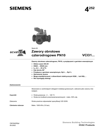 4 252 Seria 02 Zawory obrotowe czterodrogowe PN10 VCI31... Zawory obrotowe czterodrogowe, PN10, z przyłączami z gwintem wewnętrznym • • • • • • • • Żeliwo szare GG-25 DN20 ... DN40 mm kvs 6,3 ... 25 m3/h Kąt obrotu 90° Przyłącza z gwintem wewnętrznym, Rp¾ ... Rp1½ Sterowanie ręczne Mogą współpracować z siłownikami elektrycznymi SQK… lub SQL… Nie wymagają obsługi Zastosowanie Stosowane w zamkniętych obiegach instalacji grzewczych, zalecane jako zawory mieszające. Czynniki • Woda grzewcza: 2 ... 120 °C • Woda ze środkami przeciwzamarzaniowymi: maks. 50% obj. Zalecenie Woda powinna odpowiadać specyfikacji VDI 2035. Ciśnienie robocze Maks. 1000 kPa (10 bar). CM1N4252pl 09.2002 Siemens Building Technologies HVAC Products Zestawienie typów kvs DN Typ [cal] [mm] [m3/h] VCI31.20 VCI31.25 VCI31.32 VCI31.40 ¾ 1 1¼ 1½ 20 25 32 40 6,3 10 16 25 DN kvs Zamawianie = Średnica nominalna = Przepływ nominalny wg VDI2173 30 ∆pv100 = Maksymalna dopuszczalna różnica ciśnień na całkowicie otwartym zaworze Zawór, siłownik i łącznik (jeśli jest wymagany) należy zamawiać oddzielnie. Przy zamawianiu należy podać ilość, nazwę urządzenia i oznaczenie typu. Przykład: Dostawa ∆pv100 [kPa] 1 zawór obrotowy czterodrogowy VCI31.25, 1 siłownik SQL33.00 i 1 łącznik ASK32 Zawór, siłownik i łącznik pakowane są oddzielnie. Urządzenia współpracujące Zawory obrotowe VCI31… mogą być sterowane następującymi siłownikami elektrycznymi Landis & Staefa: Typ siłownika SQK33.00 SQL33.00 SQL33.03 SQK34.00 SQL83.00 SQK84.00 1) 2) 3) 4) Łącznik ASK32 1) 3) 3) 2) 4) 3) 2) 4) Łącznik ASK32 ASK32 ASK32 – ASK32 – Napięcie zasilania 230 V AC 24 AC V Czas przebiegu 90° 125 s 125 s 30 s 135 s 125 s 135 s Rodzaj sterowania Karta katalogowa N4506 3-stawne N4508 N4506 N4508 Może być wyposażony w 1 przełącznik pomocniczy ASC9.5 Może być wyposażony w 1 przełącznik pomocniczy ASC9.7 Może być wyposażony w 1 przełącznik pomocniczy ASC9.5 lub 1 parę przełączników pomocniczych ASC9.4 lub 1 potencjometr i 1 przełącznik pomocniczy ASZ7.4 Do bezpośredniego montażu (bez łącznika) na zaworach VCI31… serii 02 Łącznik ASK32 wymagany jest przy montażu siłowników SQK33.00, SQL33.00, SQL33.03 i SQL83.00 na zaworach VCI31… serii 01 i 02. Łącznik ASK32 składa się z krótkiego wspornika z wkrętami. Łącznik dostarczany jest z instrukcją montażu. 2/6 Siemens Building Technologies HVAC Products Zawory obrotowe czterodrogowe VCI31..., PN10 CM1N4252pl 09.2002 Budowa Montaż Montaż zaworu i siłownika jest prosty i może być wykonany bezpośrednio na miejscu. Dwie specjalne śruby w pokrywie obudowy służą do zamocowania łącznika i skali wskaźnika położenia. Zawór, siłownik i łącznik ASK32 (jeśli jest wymagany) pakowane są oddzielnie. − Siłowniki SQK34.00 i SQK84.00 nie wymagają łącznika. − Siłowniki SQK33.00, SQL33.00, SQL33.03 i SQL83.00 wymagają łącznika ASK32 Sterowanie ręczne Pokrętło sterowania ręcznego, skalę oraz element obrotowy można przestawić i dopasować do instalacji (kocioł z lewej lub prawej strony). Praca automatyczna Przed zamontowaniem siłownika SQK34.00 lub SQK84.00 należy usunąć pokrętło sterowania ręcznego. Skalę oraz element obrotowy można przestawić i dopasować do instalacji (kocioł z lewej lub prawej strony). Wymiarowanie 1 0.5 0.2 0.05 0.1 30 0.02 0.01 0.005 0.002 0.001 ∆pv100 [bar] 8.3 20 5.6 4.17 2.77 8 2.22 6 5 1.66 0) DN " (4 ) 1½ 32 "( 5) 1¼ (2 0) 1" (2 " ¾ 4 3 2 1.11 0.83 0.56 0,42 1 V100 [l/s] V100 [m³/h] 10 0,28 100 kPa 1 m3/h 30 40 50 60 80 100 ∆pv100 [kPa] 20 0.056 8 0.2 10 0.083 3 4 6 0.3 2 0.11 0.3 0.4 0.5 0.6 0.8 1 0.4 0.2 0.17 0.1 0.6 0.5 4232D01 0.8 = maks. pv100 = 1 bar ~ 10 m słupa wody = 0,278 kg/s wody o temperaturze 20 °C 3/6 Siemens Building Technologies HVAC Products Zawory obrotowe czterodrogowe VCI31..., PN10 CM1N4252pl 09.20021 Projektowanie Zawory VCI31… powinny być instalowane zgodnie z kierunkiem przepływu oznaczonym strzałkami na korpusie zaworu. W instalacjach, do których przedostaje się tlen, istnieje zwiększone niebezpieczeństwo wystąpienia korozji, a przez to zablokowania elementu obrotowego zaworu. Zasilanie z kotła od lewej Zasilanie z kotła od prawej • Zawory VCI31… są fabrycznie przygotowane do „zasilania z kotła od lewej” • W instalacjach z „zasilaniem z kotła od prawej”, skalę można obrócić o 180°, zgodnie z instrukcją montażu zaworów obrotowych VC... Montaż Położenie Dopuszczalne Położenie fabryczne: Element obrotowy ustawiony na „zasilanie z kotła od lewej”. Obrót w kierunku przeciwnym do zegarowego: otwieranie Obrót w kierunku zgodnym z zegarowym: zamykanie Nie dopuszczalne Pokrętło sterowania ręcznego ze skalą, wskaźnikiem położenia i znacznikiem położenia elementu obrotowego. Pozycja „0” = zasilanie z kotła całkowicie zamknięte. Zawór dostarczany jest z instrukcją montażu. Uruchomienie Podczas uruchamiania zaworu należy sprawdzić, czy położenie i zakres obrotu elementu obrotowego jest odpowiedni do danej instalacji (patrz „Projektowanie”). Położenie segmentu obrotowego zaworu wskazywane jest za pomocą: – pokrętła sterowania ręcznego i skali – rowka na trzpieniu zaworu, widocznego po zdjęciu pokrętła sterowania ręcznego Uwaga Przed wykonaniem prac serwisowych przy zaworze, siłowniku lub łączniku: wyłączyć pompę i źródło zasilania, zamknąć główny zawór odcinający, spuścić ciśnienie z instalacji i odczekać na jej ostygnięcie. W razie potrzeby odłączyć przewody elektryczne od zacisków. Zawór można ponownie uruchomić po założeniu pokrętła sterowania ręcznego lub prawidłowym zamocowaniu siłownika. 4/6 Siemens Building Technologies HVAC Products Zawory obrotowe czterodrogowe VCI31..., PN10 CM1N4252pl 09.2002 Dane techniczne Dane funkcjonalne Materiały Wymiary i waga Charakterystyka K
