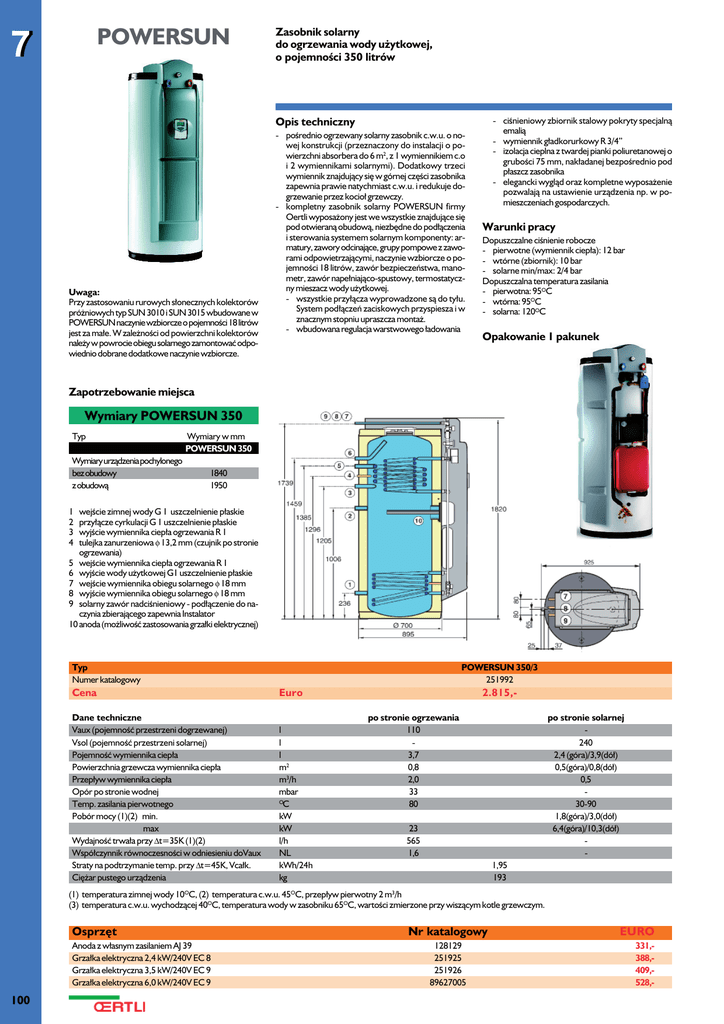 7 POWERSUN Zasobnik solarny do ogrzewania wody użytkowej, o pojemności 350 litrów - ciśnieniowy zbiornik stalowy pokryty specjalną emalią - wymiennik gładkorurkowy R 3/4” - izolacja cieplna z twardej pianki poliuretanowej o grubości 75 mm, nakładanej bezpośrednio pod płaszcz zasobnika - elegancki wygląd oraz kompletne wyposażenie pozwalają na ustawienie urządzenia np. w pomieszczeniach gospodarczych. Opis techniczny Uwaga: Przy zastosowaniu rurowych słonecznych kolektorów próżniowych typ SUN 3010 i SUN 3015 wbudowane w POWERSUN naczynie wzbiorcze o pojemności 18 litrów jest za małe. W zależności od powierzchni kolektorów należy w powrocie obiegu solarnego zamontować odpowiednio dobrane dodatkowe naczynie wzbiorcze. - pośrednio ogrzewany solarny zasobnik c.w.u. o nowej konstrukcji (przeznaczony do instalacji o powierzchni absorbera do 6 m2, z 1 wymiennikiem c.o i 2 wymiennikami solarnymi). Dodatkowy trzeci wymiennik znajdujący się w górnej części zasobnika zapewnia prawie natychmiast c.w.u. i redukuje dogrzewanie przez kocioł grzewczy. - kompletny zasobnik solarny POWERSUN firmy Oertli wyposażony jest we wszystkie znajdujące się pod otwieraną obudową, niezbędne do podłączenia i sterowania systemem solarnym komponenty: armatury, zawory odcinające, grupy pompowe z zaworami odpowietrzającymi, naczynie wzbiorcze o pojemności 18 litrów, zawór bezpieczeństwa, manometr, zawór napełniająco-spustowy, termostatyczny mieszacz wody użytkowej. - wszystkie przyłącza wyprowadzone są do tyłu. System podłączeń zaciskowych przyspiesza i w znacznym stopniu upraszcza montaż. - wbudowana regulacja warstwowego ładowania Warunki pracy Dopuszczalne ciśnienie robocze - pierwotne (wymiennik ciepła): 12 bar - wtórne (zbiornik): 10 bar - solarne min/max: 2/4 bar Dopuszczalna temperatura zasilania - pierwotna: 95OC - wtórna: 95OC - solarna: 120OC Opakowanie 1 pakunek Zapotrzebowanie miejsca Wymiary POWERSUN 350 Typ Wymiary urządzenia pochylonego bez obudowy z obudową Wymiary w mm POWERSUN 350 1840 1950 1 2 3 4 wejście zimnej wody G 1 uszczelnienie płaskie przyłącze cyrkulacji G 1 uszczelnienie płaskie wyjście wymiennika ciepła ogrzewania R 1 tulejka zanurzeniowa φ 13,2 mm (czujnik po stronie ogrzewania) 5 wejście wymiennika ciepła ogrzewania R 1 6 wyjście wody użytkowej G1 uszczelnienie płaskie 7 wejście wymiennika obiegu solarnego φ 18 mm 8 wyjście wymiennika obiegu solarnego φ 18 mm 9 solarny zawór nadciśnieniowy - podłączenie do naczynia zbierającego zapewnia Instalator 10 anoda (możliwość zastosowania grzałki elektrycznej) Typ Numer katalogowy POWERSUN 350/3 251992 Cena Euro Dane techniczne Vaux (pojemność przestrzeni dogrzewanej) Vsol (pojemność przestrzeni solarnej) Pojemność wymiennika ciepła Powierzchnia grzewcza wymiennika ciepła Przepływ wymiennika ciepła Opór po stronie wodnej Temp. zasilania pierwotnego Pobór mocy (1)(2) min. max Wydajność trwała przy Δt=35K (1)(2) Współczynnik równoczesności w odniesieniu doVaux Straty na podtrzymanie temp. przy Δt=45K, Vcałk. Ciężar pustego urządzenia l l l m2 m3/h mbar O C kW kW l/h NL kWh/24h kg 2.815,po stronie ogrzewania 110 3,7 0,8 2,0 33 80 po stronie solarnej 240 2,4 (góra)/3,9(dół) 0,5(góra)/0,8(dół) 0,5 30-90 1,8(góra)/3,0(dół) 6,4(góra)/10,3(dół) - 23 565 1,6 1,95 193 (1) temperatura zimnej wody 10OC, (2) temperatura c.w.u. 45OC, przepływ pierwotny 2 m3/h (3) temperatura c.w.u. wychodzącej 40OC, temperatura wody w zasobniku 65OC, wartości zmierzone przy wiszącym kotle grzewczym. Osprzęt Anoda z własnym zasilaniem AJ 39 Grzałka elektryczna 2,4 kW/240V EC 8 Grzałka elektryczna 3,5 kW/240V EC 9 Grzałka elektryczna 6,0 kW/240V EC 9 100 Nr katalogowy 128129 251925 251926 89627005 EURO 331,388,409,528,-