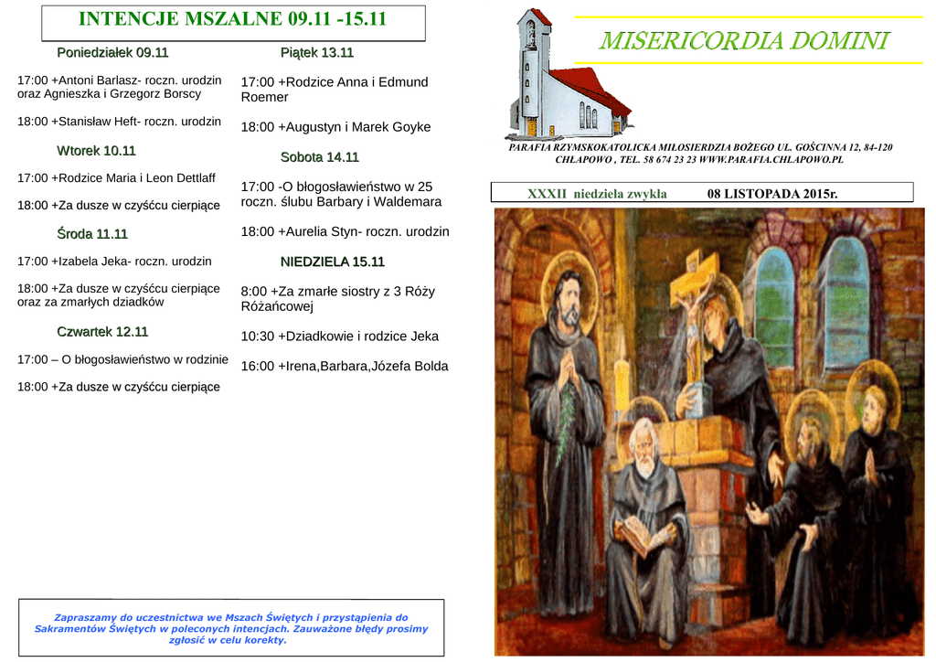 INTENCJE MSZALNE 09.11 -15.11 Poniedziałek 09.11 Piątek 13.11 17:00 +Antoni Barlasz- roczn. urodzin oraz Agnieszka i Grzegorz Borscy 17:00 +Rodzice Anna i Edmund Roemer 18:00 +Stanisław Heft- roczn. urodzin 18:00 +Augustyn i Marek Goyke Wtorek 10.11 17:00 +Rodzice Maria i Leon Dettlaff 18:00 +Za dusze w czyśćcu cierpiące Środa 11.11 17:00 +Izabela Jeka- roczn. urodzin 18:00 +Za dusze w czyśćcu cierpiące oraz za zmarłych dziadków Czwartek 12.11 17:00 – O błogosławieństwo w rodzinie PARAFIA RZYMSKOKATOLICKA MIŁOSIERDZIA BOŻEGO UL. GOŚCINNA 12, 84-120 CHŁAPOWO , TEL. 58 674 23 23 WWW.PARAFIA.CHLAPOWO.PL Sobota 14.11 17:00 -O błogosławieństwo w 25 roczn. ślubu Barbary i Waldemara XXXII niedziela zwykła 18:00 +Aurelia Styn- roczn. urodzin NIEDZIELA 15.11 8:00 +Za zmarłe siostry z 3 Róży Różańcowej 10:30 +Dziadkowie i rodzice Jeka 16:00 +Irena,Barbara,Józefa Bolda 18:00 +Za Za dusze w czyśćcu cierpiące Zapraszamy do uczestnictwa we Mszach Świętych i przystąpienia do Sakramentów Świętych w poleconych intencjach. Zauważone błędy prosimy zgłosić w celu korekty. 08 LISTOPADA 2015r. XXXII niedziela 1 CZYTANIE: (1 Krl 17,10-16) 2 CZYTANIE: (Hbr 9,24-28) EWANGELIA: (Mk 12,38-44) POCHYLENI NAD SŁOWEM Na ogół dzisiejszą Ewangelię wykorzystuje się jako pretekst i okazję do poruszenia tematu ofiarności i utrzymania Kościoła. Faktycznie, jest to bardzo istotny temat i uboga wdowa stanowi dla wielu niedościgły wzór. Ma też dziś wielu naśladowców: obecnie Kościół utrzymuje się bowiem przede wszystkim z ofiar ludzi ubogich, których dochody oscylują w granicach socjalnego minimum. Bogaci wolą sponsorować bardziej spektakularne akcje niż tydzień miłosierdzia, remont dachu czy rachunek za ogrzewanie kościoła.A są to wszystko sprawy niezbędne dla funkcjonowania parafii. Ich zakwestionowanie czy niedofinansowanie grozi bowiem zachwianiem całej posługi duszpasterskiej. Po prostu: Kościół potrzebuje pieniędzy, i to w nominałach wprost proporcjonalnych do inflacji. „Waryński” wrzucony do koszyka stanowi co prawda dokładny odpowiednik jednego grosza z dzisiejszej Ewangelii, ale z drugiej strony to tylko równowartość paru zapałek... Z takim budżetem dużo się nie zdziała. To istny cud, że przy tak skromnych możliwościach materialnych, Kościół robi aż tak wiele. (Ubiegłoroczne dochody i rozchody Diecezji Kaliskiej zamykały się w kwocie kilku miliardów zł. Nie znam danych dotyczących budżetu województwa, ale sądzę, że jest to kilka bilionów. Mechanizm jest chyba dość prosty: kto ma mało, ten szanuje to, co ma. Drugi czynnik to wkład osobisty wielu osób z dużym poczuciem odpowiedzialności.)Ale nie to jest głównym tematem Ewangelii. Otóż kluczem do jej zrozumienia są słowa Chrystusa o ofierze wdowy: „wrzuciła całe swoje utrzymanie”. Nie było to wiele – jeden grosz, ale dla niej było to wszystko. O czym to świadczy? O nieograniczonym zaufaniu do Boga. Gdyby ta reszta pieniędzy została przeznaczona na jakieś głupstwo, byłaby to lekkomyślność; jeśli na chleb, byłoby to tragiczne. Ale to była ofiara. Ofiara to zewnętrzny wyraz zaufania do Boga: rezygnuję z części swego utrzymania, żeby symbolicznie pokazać Bogu, że liczę na Jego pomoc, że On jest dla mnie ważniejszy nad życie.Uboga wdowa pokazała to w sposób nie symboliczny, lecz dosłowny. Oddała wszystko Bogu, bo wiedziała, że w Nim ma wszystko, a nawet jeszcze więcej. Wiedziała, że na Nim może polegać bardziej, niż na swoim ostatnim groszu. Sama z siebie nie miała i nie mogła nic, ale skoro tak, swoim zaufaniem zmuszała niejako Boga do pomocy. Albowiem Bóg, jako kochający Ojciec, wie, że potrzebujemy niezbędnych środków do życia i nikogo, kto Mu ufa, ich nie pozbawi. Podobnie postąpi tata ze swoimi dziećmi: zaopiekuje się szczególnie tym, które ma najmniej i jest najsłabsze.Ale tu nie chodzi tylko o opiekę i pomoc Boga w sprawach doczesnych, lecz o zbawienie. Tu człowiek jest zupełnie bezsilny, bo tylko Bóg może nas zbawić. Wymaga to jednak naszego całkowitego zaufania i oddania się Bogu. Właśnie to uczyniła bohaterka dzisiejszej Ewangelii. I na pewno nie zawiodła się na Nim. Bóg nigdy nie zawiedzie tych, którzy Mu ufają i oddają swoje życie i sprawy w Jego ręce.Oczywiście, taka ofiara i zaufanie, wymagają dużo pokory i wiary. Człowiek nie lubi zawdzięczać innym zbyt wiele. Woli raczej być niezależny i sam zapewnić sobie utrzymanie. W dziedzinie życia doczesnego jest to zdrowa tendencja, ale niestety, przenosi się ona często na zakres życia duchowego i religijnego. Człowieka ogarnia wtedy zgubna pewność siebie, która szybko przeradza się w pychę: sam sobie poradzę, nie potrzebuję niczyjej łaski, nawet Boga! Towarzyszy temu przeświadczenie o własnej doskonałości i samowystarczalności. Jej rzekome zewnętrzne wyrazy zaczyna się więc pomnażać. Tą drogą poszli faryzeusze i pewnie wielu z nas. Ale te pozory nikogo nie zbawią, a Bogu skrępują ręce. OGŁOSZENIA DUSZPASTERSKIE NA XXXII NIEDZIELĘ 08 LISTOPADA 2015 r. 1.Dzisiaj druga niedziela listopada- kolekta specjalnie na budowę kościoła. Bóg zapłać za wszystkie ofiary. Jesteśmy w trakcie instalowania urządzeń gazowych do ogrzewania kościoła. Także dzisiaj o godz. 14:15 odmówimy wspólnie Różaniec Róż Różańcowych W listopadzie będziemy modlili się za Pasterzy Kościoła, aby miłując swoje owce, towarzyszyli im w drodze i podtrzymywali nadzieję. 2.Święta w tym tygodniu: -poniedziałek- Święto Rocznicy Poświecenia Bazyliki Laterańskiej -wtorek- św. Leona Wielkiego -środa- św. Marcina- 97 rocznica odzyskania niepodległości -czwartek- św. Jozafata -piątek- świętych Benedykta, Jana, Mateusza, Izaaka i Krystynapierwszych męczenników Polski 3.Kolekta przyszłej niedzieli jest przeznaczona na Światowe Dni Młodzieży. 4.Dziękuję za sprzątanie kośc