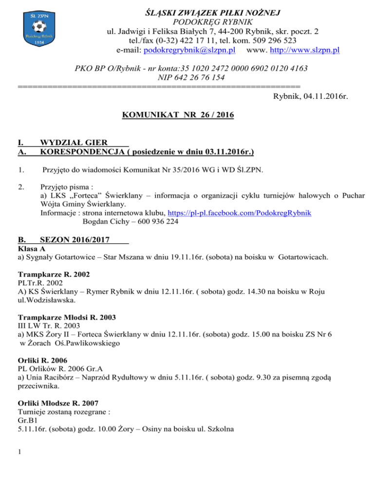 ŚLĄSKI ZWIĄZEK PIŁKI NOŻNEJ PODOKRĘG RYBNIK ul. Jadwigi i Feliksa Białych 7, 44-200 Rybnik, skr. poczt. 2 tel./fax (0-32) 422 17 11, tel. kom. 509 296 523 e-mail: [email protected] www. http://www.slzpn.pl PKO BP O/Rybnik - nr konta:35 1020 2472 0000 6902 0120 4163 NIP 642 26 76 154 ========================================================= Rybnik, 04.11.2016r. KOMUNIKAT NR 26 / 2016 I. A. WYDZIAŁ GIER KORESPONDENCJA ( posiedzenie w dniu 03.11.2016r.) 1. Przyjęto do wiadomości Komunikat Nr 35/2016 WG i WD Śl.ZPN. 2. Przyjęto pisma : a) LKS „Forteca” Świerklany – informacja o organizacji cyklu turniejów halowych o Puchar Wójta Gminy Świerklany. Informacje : strona internetowa klubu, https://pl-pl.facebook.com/PodokregRybnik Bogdan Cichy – 600 936 224 B. SEZON 2016/2017 Klasa A a) Sygnały Gotartowice – Star Mszana w dniu 19.11.16r. (sobota) na boisku w Gotartowicach. Trampkarze R. 2002 PLTr.R. 2002 A) KS Świerklany – Rymer Rybnik w dniu 12.11.16r. ( sobota) godz. 14.30 na boisku w Roju ul.Wodzisławska. Trampkarze Młodsi R. 2003 III LW Tr. R. 2003 a) MKS Żory II – Forteca Świerklany w dniu 12.11.16r. (sobota) godz. 15.00 na boisku ZS Nr 6 w Żorach Oś.Pawlikowskiego Orliki R. 2006 PL Orlików R. 2006 Gr.A a) Unia Racibórz – Naprzód Rydułtowy w dniu 5.11.16r. ( sobota) godz. 9.30 za pisemną zgodą przeciwnika. Orliki Młodsze R. 2007 Turnieje zostaną rozegrane : Gr.B1 5.11.16r. (sobota) godz. 10.00 Żory – Osiny na boisku ul. Szkolna 1 Gr.D 1 5.11.16r. (sobota) godz. 9.30 Baranowice ( boisko ) ul. Lipowa Gr.E1 4.11.16r. (piątek) godz. 16.30 Jastrzębie –Zdr. ( Orlik) ul.Staszica Gr.G1 5.11.16r. (sobota) godz. 13.00 Szeroka ( boisk ) ul. Gagarina Żaki R. 2008 Turnieje zostaną rozegrane : Gr.C1 6.11.16r. (niedziela) godz. 9.30 Suszec ( boisko – 2 równolegle) ul. Piaskowa Gr.E1 6.11.16r. (niedziela) godz. 9.30 Marklowice (Orlik) ul. Wyzwolenia Żaki R. 2009 5.11.6r. (sobota) godz. 10.00 Krostoszowice (Orlik ) ul. Szybowa C. WERYFIKACJE 1. Wydział Gier po zapoznaniu się ze sprawozdaniem sędziego ( oryginał) z zawodów III LWJ Mł.R. 2000 postanowił: anulować decyzję z Komunikatu Nr 24/16 ( I.D.1) – walkower w zawodach Granica Ruptawa – MKS Żory i utrzymać wynik z boiska 6:2 dla Ruptawy ( błędny wpis sędziego w sprawozdaniu w systemie Extranet). Przekazano do WD w celu wyciągnięcia sankcji dyscyplinarnych do sędziego zawodów. 2. Nieodbyte zawody PLJ St. R. 98 Kamień – Szczerbice z dnia 29.10.16r. weryfikuje się jako wo i 3:0 dla Kamienia ( zespół gości nie stawił się na boisku). Przekazano do WD. 3. Na posiedzeniu WG w dniu 3.11.16r. zatwierdzono weryfikacje zawodów : Puchar Polski – Dębieńsko – Marklowice z 19.10.16r. 1:4 Klasa A – kolejka z 29.30.10.16r. Klasa B – zawody Ruptawa II – Bełk II Z 23.10.16r. oraz kolejka z 29-30.10.16r. a) zawody Bełk II – Rogoźna z dnia 30.10.16r. weryfikuje się jako wo i utrzymuje wynik z boiska 5:0 dla Bełku ( zespół gości zdekompletowany w 57 min.) b) zawody Krostoszowice – Dębieńsko z dnia 30.10.16r. brak opieki medycznej. Przekazano do WD. Klasa C – kolejka z 29-30.10.16r. PLJ St. R. 98 – kolejka z 29-30.10.16r. III LWJ Mł.R. 2000- kolejka z 30.10.16r. PLJ Mł.R.2000Gr.A – kolejka z 30.10.16r. 2 a) zawody Gołkowice – Czerwionka weryfikuje się jako wo i utrzymuje wynik z boiska 0:8 dla Czerwionki ( zespół gospodarzy zdekompletowany w 33 min.) PLJ Mł.R. 2000 Gr.B – kolejka z 29-30.10.16r. a) zawody Polaris Żory – Orzepowice weryfikuje się jako wo i utrzymuje wynik z boiska 1:9 dla Orzepowic ( zespół gosp. zdekompletowany w 41 min.) PL Tr.R. 2002 – kolejka z 29.10.16r. PL Tr. R. 2003 – kolejka z 29.10.16r. za wyjątkiem zawodów Gołkowice – Szczerbice III LW Tr. R. 2004- kolejka z 29.10.16r. PL Mł.R. 2004 Gr.A – kolejka z 29.10.16r. PL Mł.R. 2004 Gr. B – kolejka z 29.10.16r. WLM Mł.R. 2005 – kolejka z 29-30.16r. za wyjątkiem zawodów Silesia Rybnik – Forteca Świerklany PLM Mł. R. 2005 Gr.A – kolejka z 29.10.16r. PLM Mł. R. 2005 Gr. B – kolejka z 29.10.16r. PLM Mł. R. 2005 Gr. C – kolejka z 29.10.16r. PL Orlików R. 2006 Gr.A – zawody RKP Rybnik I – Rydułtowy z 22.10.16r. PL Orlików R. 2006 Gr. B – zawody Radlin – Chwałowice z 8.10.16r. Orliki R. 2007 – turniej w Ruptawie ( 16.10.16r.) oraz turnieje z 22-23.10.16r. w Jastrzębiu Zdr., Wodzisławiu Śl., Niedobczycach, Suszcu, Mszanie i Stanowicach Żaki R. 2008 – turnieje z 22-23.10.16r. w Rybniku, Szczerbicach, Krostoszowicach, Jastrzębiu Zdr,, Marklowicach Żaki R. 2009 – turniej z 23.10.16r. w Rybniku 4. 1 2 3 4 5 6 7 8 9 10 3 Tabelki Klasa C LKS Żar Szeroka LKS Skrbeńsko LKS Zwonowice Ruch Stanowice KS Szczerbice KS Leszczyny Płomień Połomia II Sokół Chwałęcice KS Kleszczów MKS 32 Radziejów II 9 9 9 9 9 9 9 9 9 9 25 18 18 17 15 15 13 6 3 3 36:10 27:12 30:16 18:13 32:20 28:25 33:26 13:38 11:40 11:39 1 2 3 4 5 6 7 8 9 Podokręgowa Liga Jun. St. R. 98 Górnik Boguszowice 8 19 KP Kamień 8 17 LKS Baranowice 8 16 Orzeł Jankowice 8 15 Czerwionka 8 12 SKF Rowień 8 10 Wicher Wilchwy 8 7 Płomień Ochojec 8 6 KS Szczerbice 8 3 40:13 36:15 25:15 25:23 32:28 19:25 21:30 9:43 15:30 E. 1. SPRAWY ORGANIZACYJNE Przyjęto informacje o ż.k i cz.k oraz dodatkowych uwagach opisanych w sprawozdaniach. 2. Przyjęto pisma : a) KS Świerklany – wyjaśnienie błędnych zapisów w sprawozdaniu powinno być : Dudkiewicz Oliwier ur. 29.07.2007r. Skrobol Jakub ur. 15.07.2010r. 3. Brak sprawozdań z zawodów ( Extranet): PL Orlików R. 2006 – Unia Racibórz – Odra Centrum W-aw WSP Wodzisław – Płomień Czuchów Orzeł Moszczenica – Płomień Ochojec PL Tr.Mł. 2003 KS 27 Gołkowice – KS Szczerbice WLM R. 2005 Silesia Rybnik – Forteca Świerklany 4. Brak sędziego na zawodach : - Turniej Żaki R. 2008 w Marklowicach. Przekazano do Kolegium Sędziów. 5. Brak sprawozdań z turniejów ( 29-30.10.16r.) Orliki R. 2007 – Boguszowice, Poł