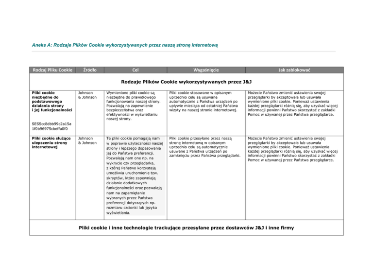 Aneks A: Rodzaje Plików Cookie wykorzystywanych przez naszą stronę internetową Rodzaj Pliku Cookie Źródło Cel Wygaśnięcie Jak zablokować Rodzaje Plików Cookie wykorzystywanych przez J&J Pliki cookie niezbędne do podstawowego działania strony i jej funkcjonalności Johnson & Johnson Wymienione pliki cookie są niezbędne do prawidłowego funkcjonowania naszej strony. Pozwalają na zapewnienie bezpieczeństwa oraz efektywności w wyświetlaniu naszej strony. Pliki cookie stosowane w opisanym uprzednio celu są usuwane automatycznie z Państwa urządzeń po upływie miesiąca od ostatniej Państwa wizyty na naszej stronie internetowej. Możecie Państwo zmienić ustawienia swojej przeglądarki by akceptowała lub usuwała wymienione pliki cookie. Ponieważ ustawienia każdej przeglądarki różnią się, aby uzyskać więcej informacji powinni Państwo skorzystać z zakładki Pomoc w używanej przez Państwa przeglądarce. Johnson & Johnson Te pliki cookie pomagają nam w poprawie użyteczności naszej strony i lepszego dopasowania jej do Państwa preferencji. Pozwalają nam one np. na wykrycie czy przeglądarka, z której Państwo korzystają umożliwia uruchomienie tzw. skryptów, które zapewniają działanie dodatkowych funkcjonalności oraz pozwalają nam na zapamiętanie wybranych przez Państwa preferencji dotyczących np. rozmiaru czcionki lub języka wyświetlania. Pliki cookie przesyłane przez naszą stronę internetową w opisanym uprzednio celu są automatycznie usuwane z Państwa urządzeń po zamknięciu przez Państwa przeglądarki. Możecie Państwo zmienić ustawienia swojej przeglądarki by akceptowała lub usuwała wymienione pliki cookie. Ponieważ ustawienia każdej przeglądarki różnią się, aby uzyskać więcej informacji powinni Państwo skorzystać z zakładki Pomoc w używanej przez Państwa przeglądarce. SESScc8dbb99c2a15a 1f0b96975cbeffa0f0 Pliki cookie służące ulepszeniu strony internetowej Pliki cookie i inne technologie trackujące przesyłane przez dostawców J&J i inne firmy Pliki cookie i technologie używane do raportowania Google Analytics Te pliki cookie wykorzystywane są do gromadzenia informacji na temat tego, w jaki sposób użytkownicy odwiedzający naszą stronę internetową z niej korzystają. „Ciasteczka” zbierają informacje w sposób anonimowy, zawierający informacje na temat tego, z jakich stron użytkownicy przeszli na naszą stronę internetową, oraz które podstrony na naszej stronie internetowej oglądali. Niektóre z tych plików cookie, przesłanych w opisanym uprzednio celu, są wykasowywane z Państwa urządzenia po zamknięciu przez Państwa przeglądarki. Pozostałe mogą być przechowywane w okresie do 24 miesięcy od Państwa ostatniej wizyty na naszej stronie internetowej. Możecie Państwo wyłaczyć tracking poprzez odwiedzenie strony Google Analytics: Pliki cookie i technologie używane do targetowania reklam Zanox Te piliki cookie wykorzystywane są w celu zbierania informacji o sposobie korzystania z naszej strony internetowej przez odwiedzających ją użytkowników w celu dostarczenia im reklam, które będą lepiej odpowiadać ich zainteresowaniu naszą stroną i/lub innymi stronami. Zanox nie używa klasycznych plików cookie w opisanym uprzednio celu, ale może wykorzystywać inne technologie (takie jak kody skryptu lub pixele trakujące) by rejestrować przebieg Państwa interakcji z naszą stroną internetową. Możecie Państwo zrezygnować z trackingu Zanox kasując lub blokując w ustawieniach przeglądarki Pliki Cookie o nazwie zcc. https://www.google.com/ads/prefere nces/html/blocked-cookies.html