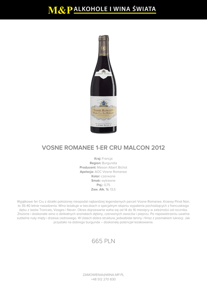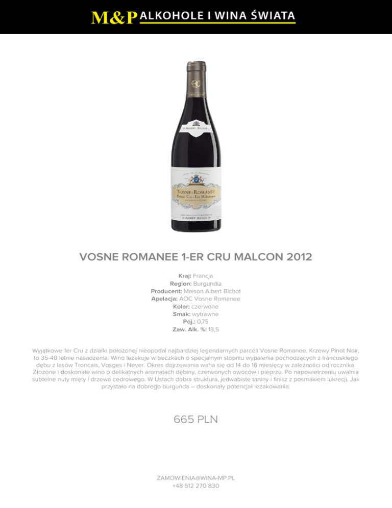 VOSNE ROMANEE 1-ER CRU MALCON 2012 665 PLN