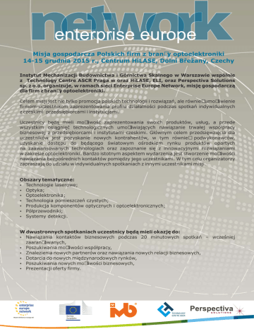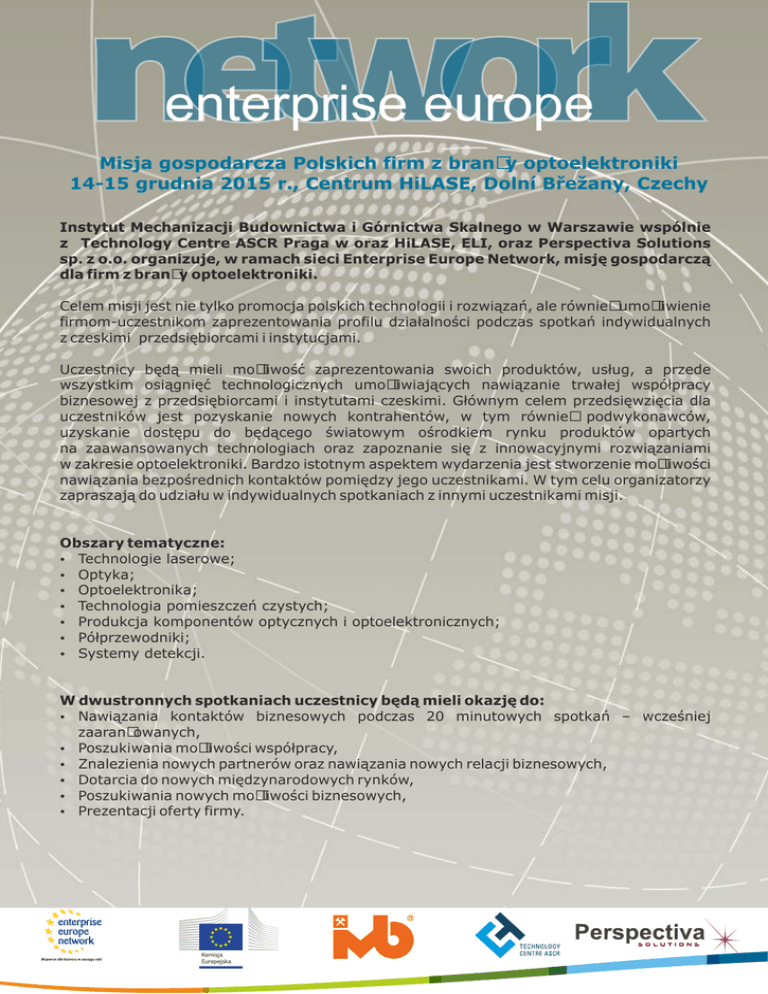 enterprise europe Misja gospodarcza Polskich firm z branży optoelektroniki 14-15 grudnia 2015 r., Centrum HiLASE, Dolní Břežany, Czechy Instytut Mechanizacji Budownictwa i Górnictwa Skalnego w Warszawie wspólnie z Technology Centre ASCR Praga w oraz HiLASE, ELI, oraz Perspectiva Solutions sp. z o.o. organizuje, w ramach sieci Enterprise Europe Network, misję gospodarczą dla firm z branży optoelektroniki. Celem misji jest nie tylko promocja polskich technologii i rozwiązań, ale również umożliwienie firmom-uczestnikom zaprezentowania profilu działalności podczas spotkań indywidualnych z czeskimi przedsiębiorcami i instytucjami. Uczestnicy będą mieli możliwość zaprezentowania swoich produktów, usług, a przede wszystkim osiągnięć technologicznych umożliwiających nawiązanie trwałej współpracy biznesowej z przedsiębiorcami i instytutami czeskimi. Głównym celem przedsięwzięcia dla uczestników jest pozyskanie nowych kontrahentów, w tym również podwykonawców, uzyskanie dostępu do będącego światowym ośrodkiem rynku produktów opartych na zaawansowanych technologiach oraz zapoznanie się z innowacyjnymi rozwiązaniami w zakresie optoelektroniki. Bardzo istotnym aspektem wydarzenia jest stworzenie możliwości nawiązania bezpośrednich kontaktów pomiędzy jego uczestnikami. W tym celu organizatorzy zapraszają do udziału w indywidualnych spotkaniach z innymi uczestnikami misji. Obszary tematyczne: ź Technologie laserowe; ź Optyka; ź Optoelektronika; ź Technologia pomieszczeń czystych; ź Produkcja komponentów optycznych i optoelektronicznych; ź Półprzewodniki; ź Systemy detekcji. W dwustronnych spotkaniach uczestnicy będą mieli okazję do: ź Nawiązania kontaktów biznesowych podczas 20 minutowych spotkań – wcześniej ź ź ź ź ź zaaranżowanych, Poszukiwania możliwości współpracy, Znalezienia nowych partnerów oraz nawiązania nowych relacji biznesowych, Dotarcia do nowych międzynarodowych rynków, Poszukiwania nowych możliwości biznesowych, Prezentacji oferty firmy. enterprise europe Misja gospodarcza Polskich firm z branży optoelektroniki 14-15 grudnia 2015 r., Centrum HiLASE, Dolní Břežany, Czechy Ramowy program misji gospodarczej 14.12.2015 r. 9.30 – 10.00 10.00 – 12.30 12.30 – 13.30 13.30 – 15.00 15.00 – 17.00 Rejestracja i poranna kawa Prezentacja firm (każdy uczestnik misji gospodarczej będzie miał możliwość krótkiego przedstawienia własnej działalności w formie prezentacji lub innej – do 15 min.) Lunch Wizyta studyjna w HiLASE: New lasers for industry and research, Dolní Břežany (HiLASE Centrum, Za Radnicí 828, 252 41 Dolní Břežany) Spotkania indywidualne 15.12.2015 r. 9.00 – 9.30 9.30 – 12.00 12.00 – 13.00 13.00 – 14.30 14.30 – 16.00 Rejestracja i poranna kawa Prezentacja firm Lunch Wizyta studyjna w Extreme Light Infrastructure (ELI), Dolní Břežany (Fyzikální ústav AV ČR, v.v.i./ ELI Beamlines, 5. května 835, 252 41 Dolní Břežany) Spotkania indywidualne Aby wziąć udział w misji należy wypełnić formularz zgłoszeniowy wraz z kilkuzdaniowym opisem oferty i potrzeb firmy i przesłać na adres e-mail: [email protected]. EEN zapewnia wsparcie w organizacji misji gospodarczej w Czechach w następujących obszarach: opieka tłumacza, transport wewnętrzny, organizacja dwóch wizyt studyjnych w czeskich organizacjach. Koszty zakwaterowania pozostają po stronie uczestników. Kontakt: Ewa Żbikowska - EEN Central Poland Instytut Mechanizacji Budownictwa i Górnictwa Skalnego tel.: +48 22 853-21-82 e-mail: [email protected] http://www.een-centralpoland.eu/