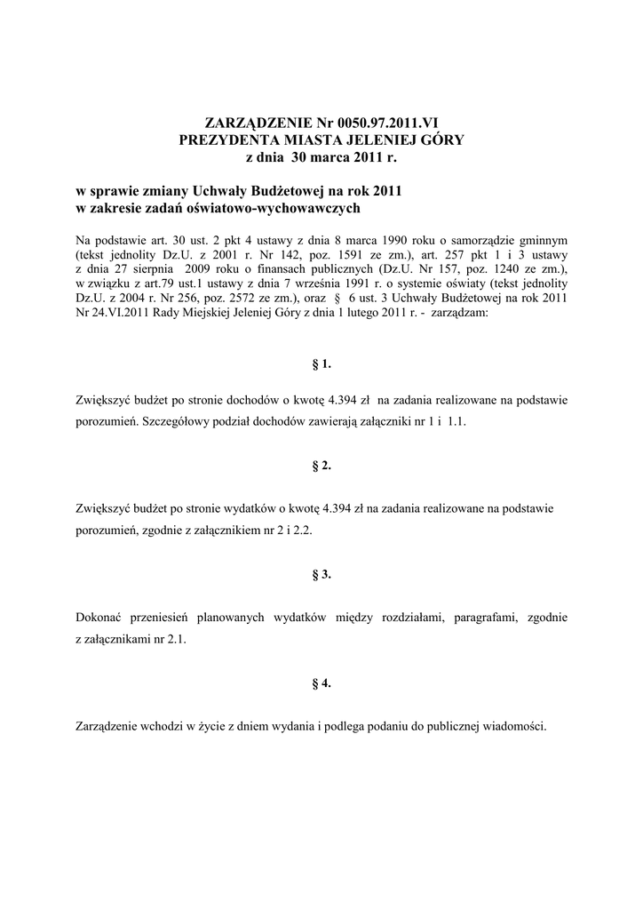 ZARZĄDZENIE Nr 0050.97.2011.VI PREZYDENTA MIASTA JELENIEJ GÓRY z dnia 30 marca 2011 r. w sprawie zmiany Uchwały Budżetowej na rok 2011 w zakresie zadań oświatowo-wychowawczych Na podstawie art. 30 ust. 2 pkt 4 ustawy z dnia 8 marca 1990 roku o samorządzie gminnym (tekst jednolity Dz.U. z 2001 r. Nr 142, poz. 1591 ze zm.), art. 257 pkt 1 i 3 ustawy z dnia 27 sierpnia 2009 roku o finansach publicznych (Dz.U. Nr 157, poz. 1240 ze zm.), w związku z art.79 ust.1 ustawy z dnia 7 września 1991 r. o systemie oświaty (tekst jednolity Dz.U. z 2004 r. Nr 256, poz. 2572 ze zm.), oraz § 6 ust. 3 Uchwały Budżetowej na rok 2011 Nr 24.VI.2011 Rady Miejskiej Jeleniej Góry z dnia 1 lutego 2011 r. - zarządzam: § 1. Zwiększyć budżet po stronie dochodów o kwotę 4.394 zł na zadania realizowane na podstawie porozumień. Szczegółowy podział dochodów zawierają załączniki nr 1 i 1.1. § 2. Zwiększyć budżet po stronie wydatków o kwotę 4.394 zł na zadania realizowane na podstawie porozumień, zgodnie z załącznikiem nr 2 i 2.2. § 3. Dokonać przeniesień planowanych wydatków między rozdziałami, paragrafami, zgodnie z załącznikami nr 2.1. § 4. Zarządzenie wchodzi w życie z dniem wydania i podlega podaniu do publicznej wiadomości. UZASADNIENIE: Zmiany budżetu miasta na 2011 rok po stronie dochodów i wydatków wynikają z tytułu: 1. Wprowadzenia do budżetu dotacji w kwocie 4.394 zł otrzymywanych z gmin na zadania realizowane na podstawie porozumień z jednostkami samorządu terytorialnego wynikających z nowo zawartego porozumienia z Miastem Karpacz w zakresie utrzymania dzieci będących mieszkańcami innych gmin, uczęszczających do przedszkola niepublicznego dotowanego przez Miasto Jelenia Góra – Przedszkole Niepubliczne Akademia Happy Kids, al. Jana Pawła II 20a, 2. Przeniesienia wydatków między rozdziałami, paragrafami, w tym między innymi: Zmiany w działach: 801- Oświata i wychowanie i 854 – Edukacyjna opieka wychowawcza polegają na przeniesieniu środków w kwocie 1.235.298 zł z tego: 1) środków będących w dyspozycji Wydziału Oświaty i Wychowania w kwocie 1.224.500 zł: a. na dokształcanie i doskonalenie nauczycieli w kwocie 442.315 zł b. na awarię i remonty bieżące w kwocie 10.153 zł dla Szkoły Podstawowej Nr 2 na usuniecie awarii cieknącej rury zimnej i ciepłej wody (800 zł), Szkoły Podstawowej Nr 3 na usunięcie awarii instalacji wodnej (1.913 zł), Gimnazjum Nr 2 na wykonanie ekspertyzy technicznej budynku sali gimnastycznej (1.000 zł), Zespołu Szkół Technicznych „Mechanik” na usunięcie awarii sieci c.o. (3.500 zł) oraz Miejskiego Integracyjnego Przedszkola Nr 14 na zakup taboretu gazowego w związku z awarią sprzętu (2.940 zł), c. w rozdziale 80106 – Inne formy wychowania przedszkolnego środków przeznaczonych na dotację podmiotową z budżetu dla Niepublicznego Punktu Przedszkolnego „Chatka Kubusia Puchatka” ul. Kiepury 29D/2 w kwocie 134.332 zł w związku ze zmianą osoby prowadzącej z Przedsiębiorstwa Wielobranżowego „Tawiz” Sp. z o.o. ul. Karola Miarki 42 58-500 Jelenia Góra, na P.W. „Pabo” Paweł Połulich ul. Słowackiego 39/16 58-500 Jelenia Góra, d. w rozdziale 80195 - Pozostała działalność - na organizację i współzawodnictwo dzieci i młodzieży w konkursach i olimpiadach w kwocie 300 zł dla Miejskiego Przedszkola Nr 19 na zakup nagród dla grup dziecięcych biorących udział w IX Ekologicznych Prezentacjach Twórczości Dziecięcej, - na dofinansowanie kosztów wyjazdów dzieci i młodzieży w kwocie 5.300 zł dla Szkoły Podstawowej Nr 2 na dofinansowanie dowozu uczniów klasy sportowej na zajęcia na basenie (2.300 zł) i Szkoły Podstawowej Nr 15 na pokrycie kosztów przejazdu uczniów na Ogólnopolskie Igrzyska Młodzieży Szkolnej (3.000 zł), e. przenosi się w związku z podpisaniem umowy wykonawczej, środki własne przeznaczone na współudział w projekcie pn. „Modernizacja centrów kształcenia zawodowego na Dolnym Śląsku” w kwocie 632.100 zł z rozdziału 80130 – Szkoły zawodowe do 80195 – Pozostała działalność, z tego środki w kwocie 9.754 zł z wydatków inwestycyjnych na dotację celową dla Województwa Dolnośląskiego przeznaczoną na współfinansowanie wydatków związanych z przygotowaniem i przeprowadzeniem procedur przetargowych, przygotowaniem studium wykonalności, zarządzaniem projektem, opiniami i ekspertyzami, promocją projektu w tym wydatki kwalifikowane w kwocie 5.695 zł wydatki niekwalifikowane w kwocie 4.059 zł. 2) zaoszczędzonych środków z dodatkowego wynagrodzenia rocznego w kwocie 10.798 zł z przeznaczeniem dla Gimnazjum Nr 2 na zakup materiałów i wyposażenia, usług pozostałych (3.416 zł), zakup zestawów komputerowych w związku z wprowadzeniem naboru elektronicznego w Miejskim Przedszkolu Nr 10 (2.500 zł) i Miejskim Przedszkolu Nr 11 (2.500 zł) oraz na dodatkowe wynagrodzenie roczne w Szkole Podstawowej Nr 5, Szkole Podstawowej Nr 7 i Zespole Szkół Rzemiosł Artystycznych w ogólnej kwocie 2.382 zł. Dział 851 – Ochrona zdrowia W rozdziale 85154 - Przeciwdziałanie alkoholizmowi, przenosi się środki zaplanowane na organizację czasu wolnego dla dzieci i młodzieży z rodzin zagrożonych patologią uzależnień zadanie realizowane podczas ferii letnich i zimowych oraz w czasie przerw świątecznych wraz z realizacją programów profilaktycznych 1) w Młodzieżowym Domu Kultury w kwocie 1.000 zł z zakupu usług pozostałych na wynagrodzenia bezosobowe, 2) z Wydziału Oświaty i Wychowania do Szkoły Podstawowej Nr 10 w kwocie 748 zł na pokrycie kosztów prowadzonych zajęć. Zmiany w planie wydatków budżetowych miasta na 2011 rok szczegółowo z podziałem na jednostki przedstawia załącznik do uzasadnienia.