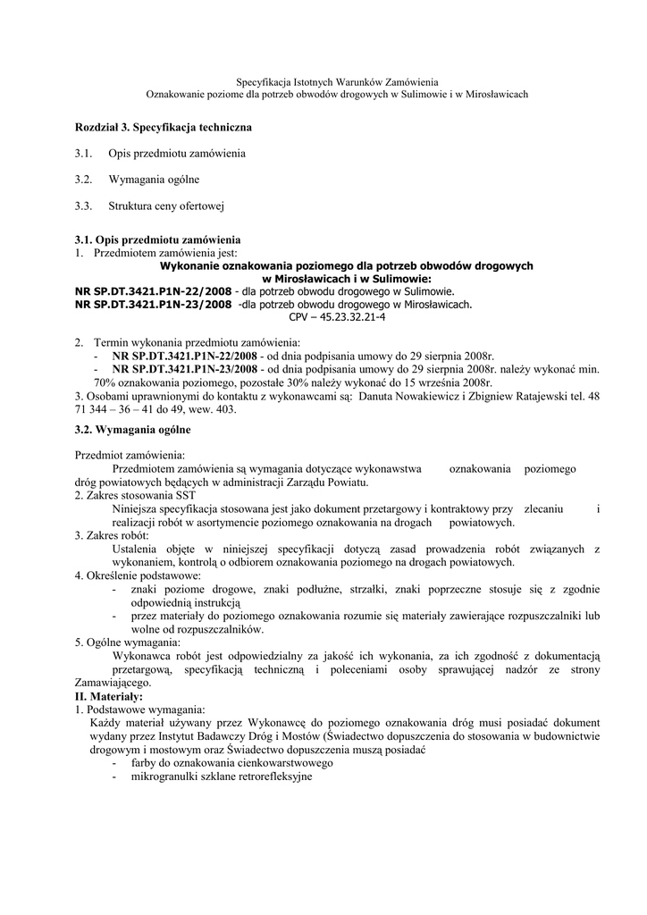 Specyfikacja Istotnych Warunków Zamówienia Oznakowanie poziome dla potrzeb obwodów drogowych w Sulimowie i w Mirosławicach Rozdział 3. Specyfikacja techniczna 3.1. Opis przedmiotu zamówienia 3.2. Wymagania ogólne 3.3. Struktura ceny ofertowej 3.1. Opis przedmiotu zamówienia 1. Przedmiotem zamówienia jest: Wykonanie oznakowania poziomego dla potrzeb obwodów drogowych w Mirosławicach i w Sulimowie: NR SP.DT.3421.P1N-22/2008 - dla potrzeb obwodu drogowego w Sulimowie. NR SP.DT.3421.P1N-23/2008 -dla potrzeb obwodu drogowego w Mirosławicach. CPV – 45.23.32.21-4 2. Termin wykonania przedmiotu zamówienia: - NR SP.DT.3421.P1N-22/2008 - od dnia podpisania umowy do 29 sierpnia 2008r. - NR SP.DT.3421.P1N-23/2008 - od dnia podpisania umowy do 29 sierpnia 2008r. naleŜy wykonać min. 70% oznakowania poziomego, pozostałe 30% naleŜy wykonać do 15 września 2008r. 3. Osobami uprawnionymi do kontaktu z wykonawcami są: Danuta Nowakiewicz i Zbigniew Ratajewski tel. 48 71 344 – 36 – 41 do 49, wew. 403. 3.2. Wymagania ogólne Przedmiot zamówienia: Przedmiotem zamówienia są wymagania dotyczące wykonawstwa oznakowania poziomego dróg powiatowych będących w administracji Zarządu Powiatu. 2. Zakres stosowania SST Niniejsza specyfikacja stosowana jest jako dokument przetargowy i kontraktowy przy zlecaniu i realizacji robót w asortymencie poziomego oznakowania na drogach powiatowych. 3. Zakres robót: Ustalenia objęte w niniejszej specyfikacji dotyczą zasad prowadzenia robót związanych z wykonaniem, kontrolą o odbiorem oznakowania poziomego na drogach powiatowych. 4. Określenie podstawowe: - znaki poziome drogowe, znaki podłuŜne, strzałki, znaki poprzeczne stosuje się z zgodnie odpowiednią instrukcją - przez materiały do poziomego oznakowania rozumie się materiały zawierające rozpuszczalniki lub wolne od rozpuszczalników. 5. Ogólne wymagania: Wykonawca robót jest odpowiedzialny za jakość ich wykonania, za ich zgodność z dokumentacją przetargową, specyfikacją techniczną i poleceniami osoby sprawującej nadzór ze strony Zamawiającego. II. Materiały: 1. Podstawowe wymagania: KaŜdy materiał uŜywany przez Wykonawcę do poziomego oznakowania dróg musi posiadać dokument wydany przez Instytut Badawczy Dróg i Mostów (Świadectwo dopuszczenia do stosowania w budownictwie drogowym i mostowym oraz Świadectwo dopuszczenia muszą posiadać - farby do oznakowania cienkowarstwowego - mikrogranulki szklane retrorefleksyjne Specyfikacja Istotnych Warunków Zamówienia Oznakowanie poziome dla potrzeb obwodów drogowych w Sulimowie i w Mirosławicach Do danego materiału podstawowego (farby) naleŜy stosować zalecane przez producenta rodzaj i ilość rozpuszczalnika oraz retrorefleksyjnych mikrogranulek szklanych do posypywania. Niedopuszczalne jest stosowanie materiałów, które nie posiadają Świadectwa dopuszczenia lub stosowania dowolnych zamienników. Jako materiał do poziomego oznakowania dróg rozumie się materiały zawierające rozpuszczalniki oraz materiały wolne od rozpuszczalników, które mogą zostać naniesione przez malowanie lub natryskiwanie. Materiały do znakowania cienkowarstwowego są to materiały nakładane warstwą grubości 0,4 do 0,8 mm (na mokro), przy czasie schnięcia: - superszybkoschnące poniŜej 1 min, - szybkoschnące poniŜej 10 min, - normalnie schnące poniŜej 20 min. NaleŜą do nich rozpuszczalnikowe farby jedno- i dwuskładnikowe stosowane w temperaturze otoczenia lub podgrzane do temperatury powyŜej 500C. 2. Wykonawca powinien Ŝądać od producenta aby oznakowanie opakowań materiałów do poziomego oznakowania dróg było wykonane zgodnie z obowiązującymi normami, a ponadto na kaŜdym opakowaniu powinien być umieszczony trwały napis zawierający nazwę producenta i materiałów, datę produkcji, informację o szkodliwości i klasie zagroŜenia poŜarowego. 3. Zawartość składników lotnych (rozpuszczalników) w materiałach cienkowarstwowych nie powinna przekraczać 30% (m/m). Nie dopuszcza się stosowania materiałów zawierających rozpuszczalniki aromatyczne. 4. Materiały do poziomego znakowania nawierzchni muszą zachować stałość swoich właściwości w okresie 6 miesięcy i być składowane w warunkach określonych przez producenta. Materiały naleŜy przechowywać zabezpieczając je od opadów, temperatur: - dla farb rozpuszczalnikowych od 00 do 250 C, - dla farb wodorozcieńczalnych od 50 do 400C. 5. Materiały do posypywania – kulki szklane retrorefleksyjne powinny charakteryzować się odpornością na wodę, zawierać nie więcej niŜ 20% kulek z defektami. 6. Wykonawca zobowiązany jest do przedstawienia na Ŝyczenie zamawiającego dokumentów potwierdzających jakość uŜywanych materiałów: - świadectwo dopuszczenia - ewentualne wyniki nadań kontrolnych materiałów - atesty potwierdzające gwarantowaną przez producenta jakość materiałów. III. Sprzęt 1. Wymagania ogólne Sprzęt powinien być dostosowany do rodzaju uŜywanego materiału i warunków wykonania. 1.1 Do przygotowania podłoŜa moŜna stosować szczotki mechaniczne lub szczotki ręczne. 1.2 Do wykonania oznakowania cienkowarstwowego naleŜy stosować malowarki z automatycznym podziałem linii i posypywaniem kulkami odblaskowymi. Zastosowana malowarka musi zapewnić pełną jednorodność nanoszonego materiału (równomierne rozłoŜenie farby i szklanych kulek, dozowanie wymaganej ilości materiałów. 1.3 Do usuwania istniejącego oznakowania poziomego cienkowarstwowego metodą piaskowania, wypalania po zaakceptowaniu przez zamawiającego. 1.4. Do wykonania oznakowania grubowarstwowego naleŜy zastosować materiały umoŜliwiające nakładanie ich warstwa grubości od 0,9 mm do 5 mm, jak masy chemoutwardzalne stosowane na zimno oraz masy termoplastyczne. Masy chemoutwardzalne powinny być substancjami jedno lub dwuskładnikowymi, mieszanymi ze sobą w proporcjach ustalonych przez producenta i nakładanymi na nawierzch