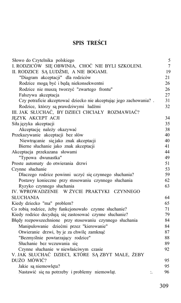 SPIS TREŚCI Słowo do Czytelnika polskiego I. RODZICÓW SIĘ OBWINIA, CHOĆ NIE BYLI SZKOLENI. II. RODZICE SĄ LUDŹMI, A NIE BOGAMI. "Diagram akceptacji" dla rodziców Rodzice mogą być i będą niekonsekwentni Rodzice nie muszą tworzyć "zwartego frontu" Fałszywa akceptacja Czy potraficie akceptować dziecko nie akceptując jego zachowania? . Rodzice, którzy są prawdziwymi ludźmi III. JAK SŁUCHAĆ, BY DZIECI CHCIAŁY ROZMAWIAĆ? JĘZYK AKCEPT ACJI Siła języka akceptacji Akceptację należy okazywać Przekazywanie akceptacji bez słów Niewtrącanie się jako znak akceptacji Bierne słuchanie jako znak akceptacji Akceptacja przekazana słowami "Typowa dwunastka" Proste automaty do otwierania drzwi Czynne słuchanie Dlaczego rodzice powinni uczyć się czynnego słuchania? Postawy konieczne przy stosowaniu czynnego słuchania Ryzyko czynnego słuchania IV. WPROWADZENIE W ŻYCIE PRAKTYKI CZYNNEGO SŁUCHANIA Kiedy dziecko "ma" problem? Co robią rodzice, żeby funkcjonowało czynne słuchanie? Kiedy rodzice decydują się zastosować czynne słuchanie? Błędy rozpowszechnione przy stosowaniu czynnego słuchania Manipulowanie dziećmi przez "kierowanie" Otwieranie drzwi, by je za chwilę zamknąć "Bezmyślnie powtarzający rodzice" Słuchanie bez wczuwania się Czynne słuchanie w niewłaściwym czasie V. JAK SŁUCHAĆ DZIECI, KTÓRE SĄ ZBYT MAŁE, ŻEBY DUŻO MÓWIĆ? Jakie są niemowlęta? Nastawić się na potrzeby i problemy niemowląt. :. 5 7 19 21 26 26 27 31 32 34 35 38 40 40 41 44 49 51 53 59 62 63 64 65 71 79 84 84 87 88 89 92 95 95 96 309 Stosowanie czynnego słuchania, aby pomóc niemowlęciu . Dajcie swojemu dziecku sposobność, aby mogło samo zaspokajać swoje potrzeby ' . VI. JAK NALEŻY MÓWIĆ, ABY DZIECI SŁUCHAŁY? . Kiedy ojciec lub matka stają wobec problemu? . Dokonywanie konfrontacji z dziećmi w sposób nieskuteczny . Przekazywanie "wypowiedzi z rozwiązaniem" . Nadawanie "wypowiedzi poniżającej" . Kontrolowanie dzieci w sposób efektywny . "Wypowiedzi «t}'»" i "wypowiedzi (<ja»" . Dlaczego "wypowiedzi (<ja»" są skuteczniejsze? . VII. WPROWADZENIE W ŻYCIE "WYPOWIEDZI dA»" . Zamaskowana "wypowiedź ((ty»" . Nie podkreślajcie tego, co ujemne . Wysłać chłopca, aby wykonał pracę mężczyzny . Wybu.:hający Wezuwiusz . Co mogą sprawić skuteczne .,wypowiedzi (<ja»"? . Przekazywać bardzo małym dzieciom bezsłowne "wypowiedzi (<ja»" Trzy problemy z "wypowiedziami (<ja»" . VIII. ZMIANA NIEAKCEPTOWANEGO ZACHOWANIA POPRZEZ ZMIANĘ OTOCZENIA . Wzbogacić otoczenie . Ograniczyć bodźce otoczenia . Uprościć otoczenie , . Ograniczyc przestrLcn życiową dziecka . Uczynić otoczenie bardziej bezpie.:znym dla dzieci . Zastąpić jedno zajęcie innym . Przygotować dziecko do zmian otoczenia . Robić plany ze starszymi dziećmi . IX. KONFLIKTY MIĘDZY RODZICAMI I DZIECKIEM, KTÓRYCH NIE MOŻNA UNIKNĄĆ. KTO POWINIEN ZWYCIĘŻYĆ? Walka o władzę między rodzicami i dzieckiem . Dwa sposoby rozpatrywania sprawy: zwycięstwo lub porażka . Dlaczego pierwsza metoda jest nieskuteczna? . Dlaczego druga metoda jest nieskuteczna? . Dodatkowe problemy z pierwszą i drugą metodą . X. CZY WŁADZA RODZICIELSKA JEST KONIECZNA I UZASADNIONA? . Czym jest autorytet? '" . Niebezpieczne granice rodzicielskiej władzy . Władza rodzicielska kończy się nieuchronnie . "Okropne nastolatki" . Wychowanie przez władzę wymaga surowych warunków . Skutki oddziaływania na dziecko władzy rodzicielskiej . Opór, przekora, bunt, negacja . ZłoŚĆ,gniew, wrogOŚĆ ' . Agresja, środki odwetowe, kontratak . Kłamstwo, ukrywanie uczuć . Obwinianie innych, plotkowanie, oszukiwanie . 310 98 100 102 104 106 10'" 110 112 I ł2 115 118 118 119 121 l2~ 12S 128 130 133 133 13~ 135 135 13:> 135 Ir Ir ISć 1:>6 16. 16. 15: ló3 156 16168 16C 1-- Dominowanie, komenderowanie, tyranizowanie . Konieczność zwyciężania, niechętne uleganie . Zawieranie sojuszów, organizowanie się przeciw rodzicom . Uległość, posłuszeństwo, poddanie się . Przymilanie się, ubieganie się o względy . przystosowanie się, brak twórczej siły, obawa przed spróbowaniem czegoś nowego, potrzeba zabezpieczenia dawnych sukcesów Wycofywanie się, ucieczka, marzenia . Kilka bardziej dociekliwych pytań dotyczących autorytetu rodzicielskiego Czy dzieci nie chcą autorytetu i ograniczeń? . Czy autorytetowi nie można nic zarzucić, jeśli rodzice są konsekwentni? . Czy więc rodzice nie mają obowiązku oddziaływania na dzieci? .. Dlaczego władza utrzymała się w wychowaniu dzieci? . XI. ROZWIĄZYWANIE KONFLIKTÓW METODĄ BEZ PORAżEK . Dlaczego trzecia metoda jest tak skuteczna? . Dziecku zależy na wypełnieniu zobowiązań, jakie wzięło na siebie .. Jest większa szansa znalezienia możliwie najlepszego rozwiązania . Trzecia metoda rozwija sprawnoŚĆ myślenia u dzieci . Mniej wrogości - więcej miłości . Trzecia metoda nie potrzebuje tylu wzmocnień, przekonywania. Likwiduje konieczność stosowania siły . Dociera do istoty problemu . Traktować dzieci jak dorosłych . Trzecia metoda jako terapia dla dziecka '" . XII. RODZICIELSKIE TROSKI I OBAWY W ZWIĄZKU Z METODĄ BEZ pORAżEK . Czyż nie jest to stara znana konferencja rodzinna pod nową nazwą? . Trzecia metoda widziana jako rodzicielska słabość . "Grupy nie mogą podejmować decyzji" . "Trzecia metoda zabiera zbyt wiele czasu" . "Czyż prawo rodziców do stosowania pierwszej metody nie wynika z tego, że są mądrzejsi?" . Czy trzecia metoda może być stosowana wobec małych dzieci? . Czy zdarza się sytuacja, kiedy musisz postępować według pierwszej metody . "Czy nie utracę szacunku moich dzieci?" . XIII. PRAKTYCZNE ZASTOSOWANIE METODY BEZ PORAŻEK ; . Jak zacząć? . Sześć kroków metody bez porażek . Krok I: rozpoznać i nazwać konflikt ; . Krok 2: rozwinąć możliwości rozwiązań . Krok 3: krytycznie ocenić propozycje rozwiązań . Krok 4: zdecydować się na najlepsze rozwiązanie . Krok 5: wykonać